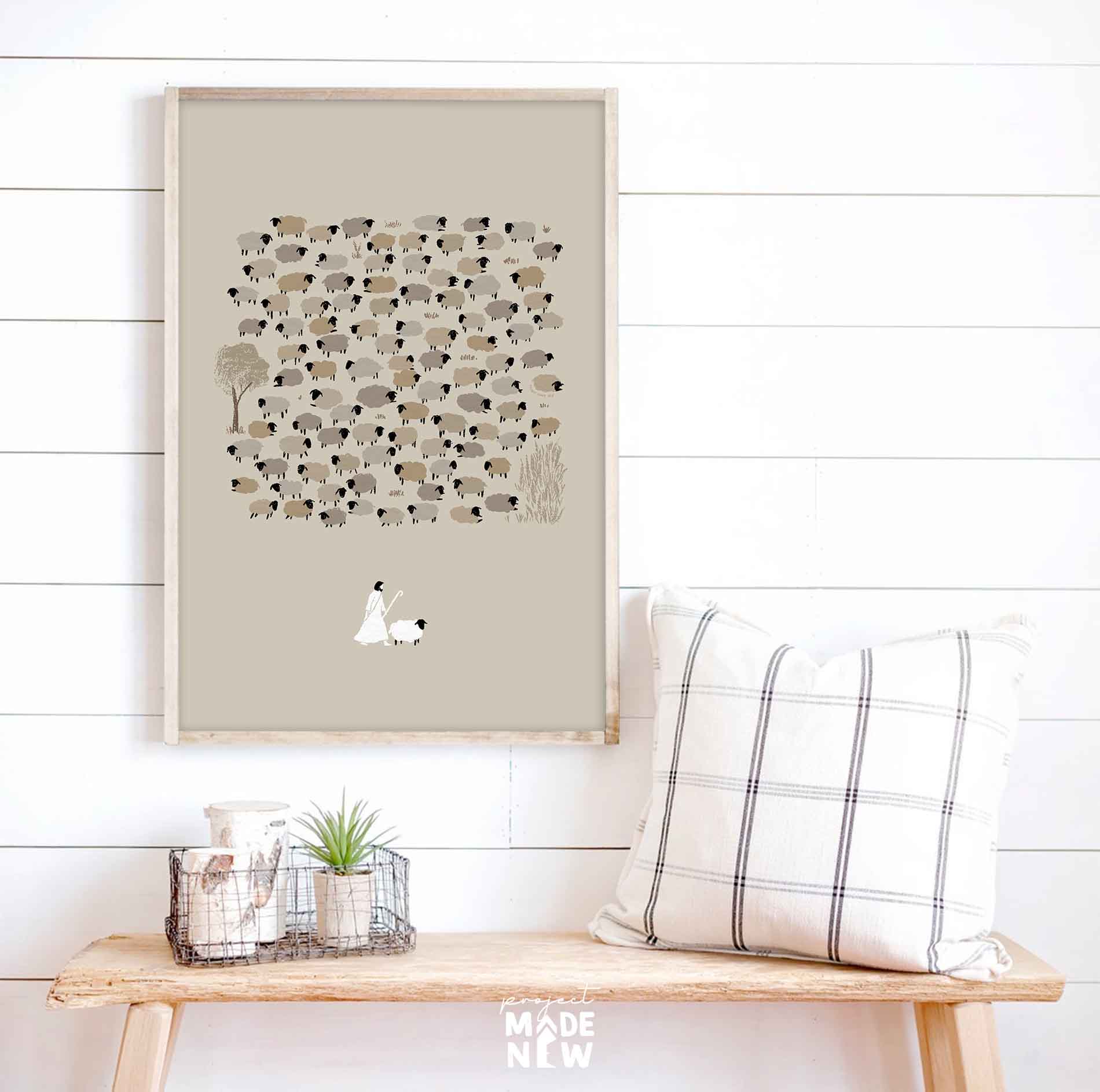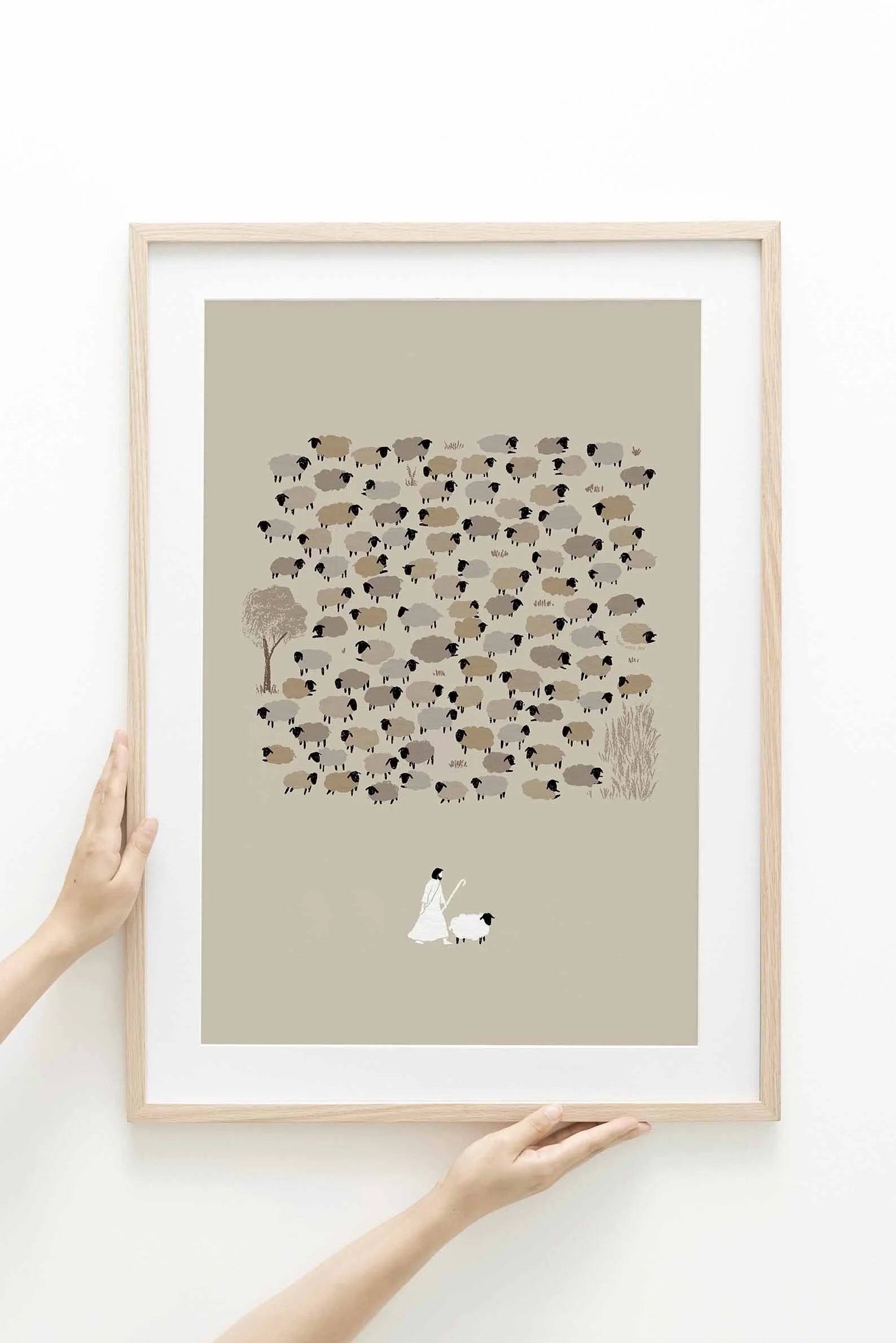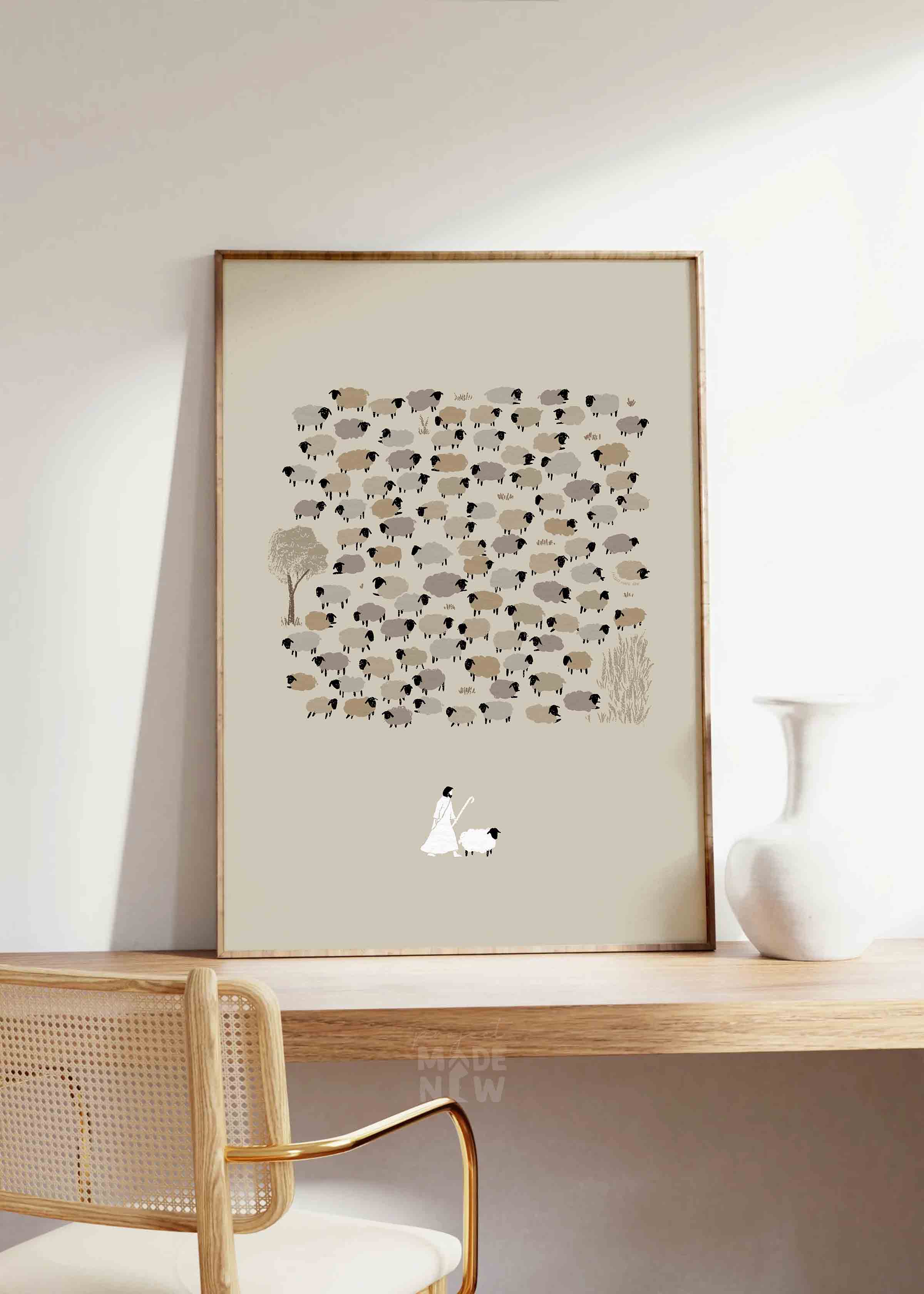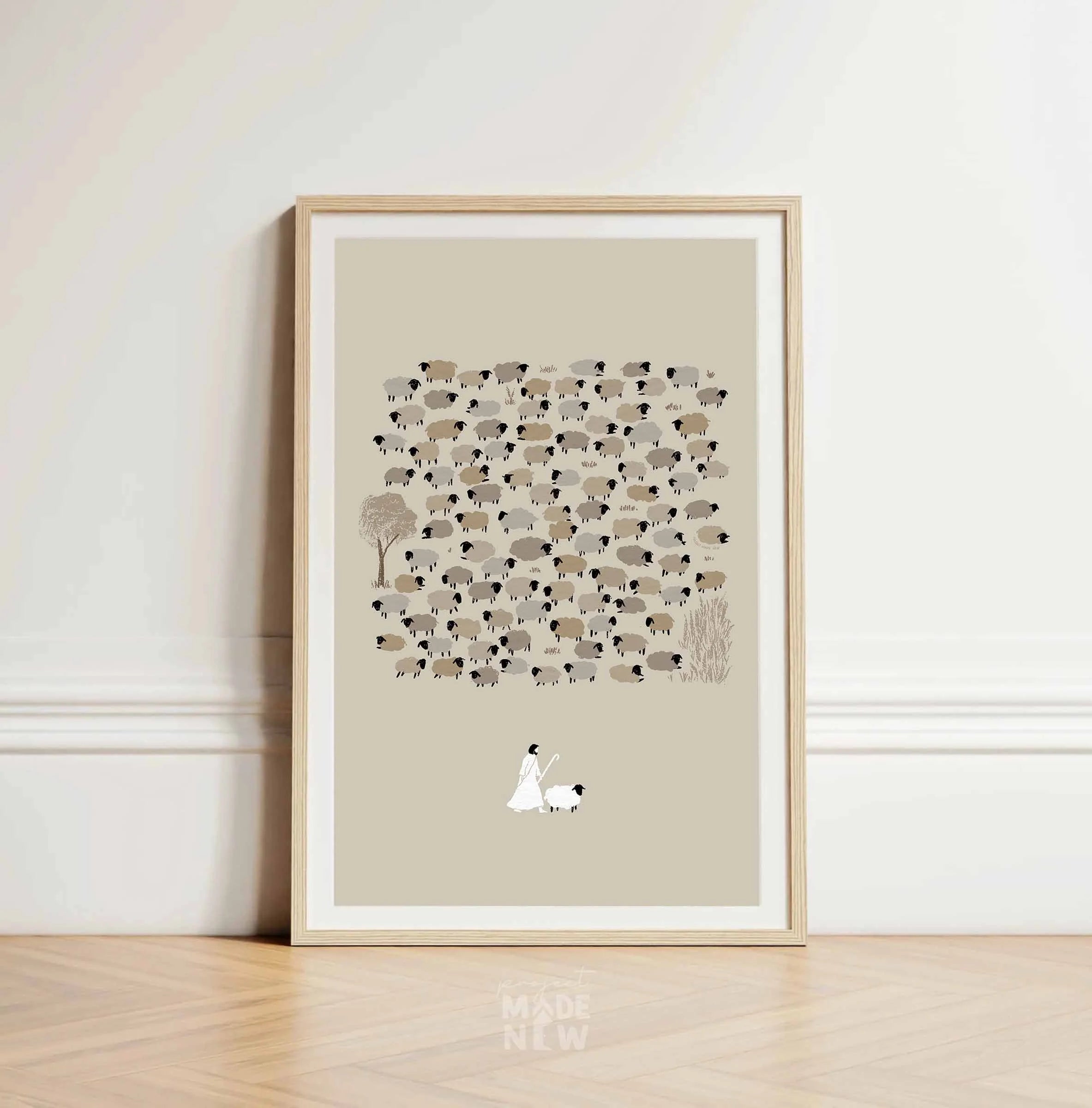 Minimalistic and modern digitally hand drawn art of Jesus leaving the 99 sheep for the 1 lost sheep.