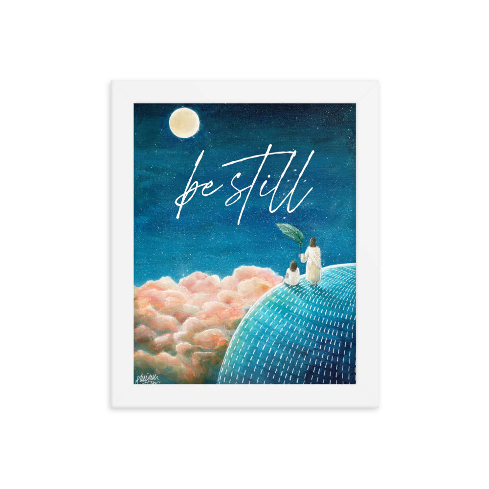 This artwork features a acrylic illustration of Jesus and a girl in a space. This artwork is a great gift to anybody who needs to be reminded to always choose to be still and know that He is God, that He is in control.. It may also be something you want to remind yourself of on a daily basis by putting it up on your wall.