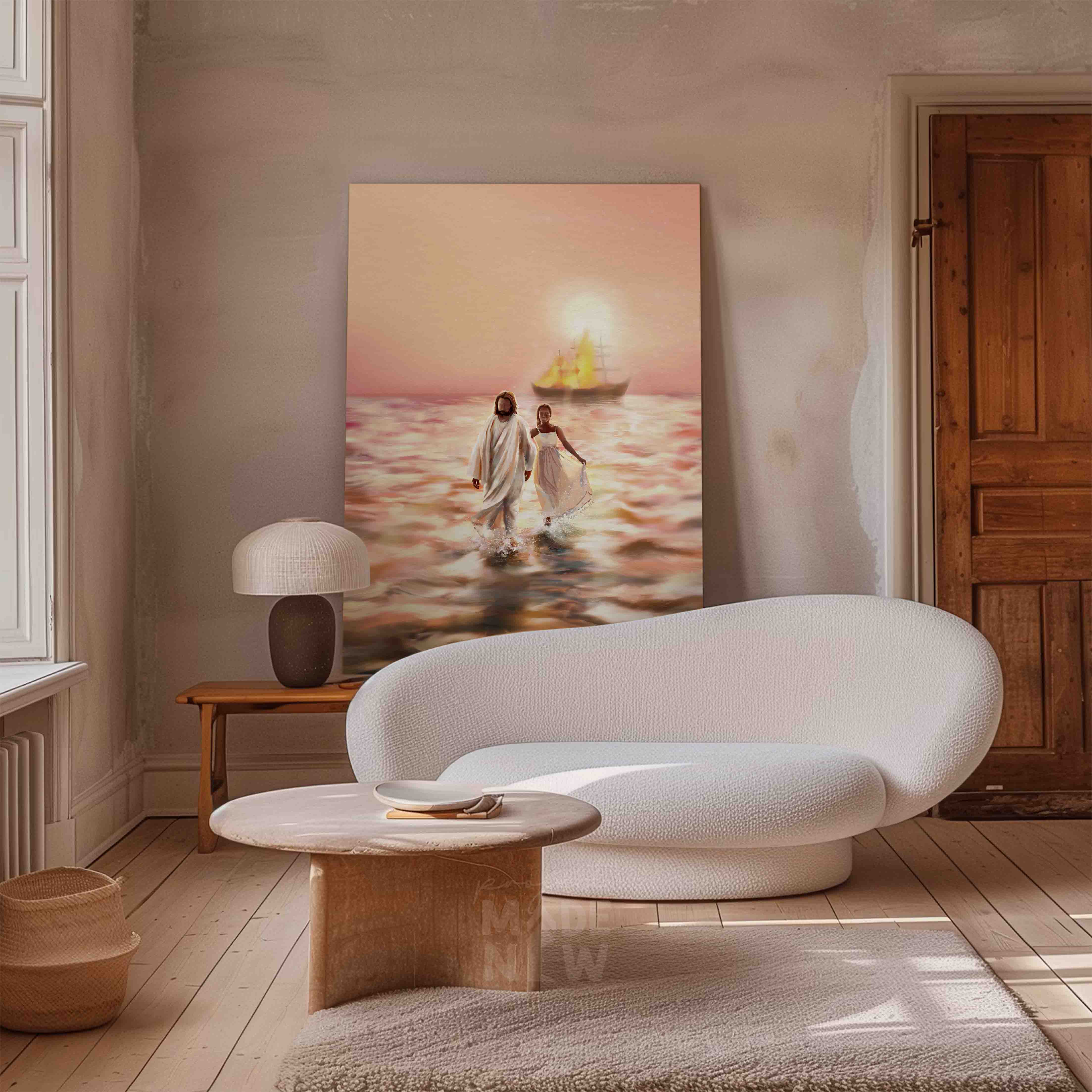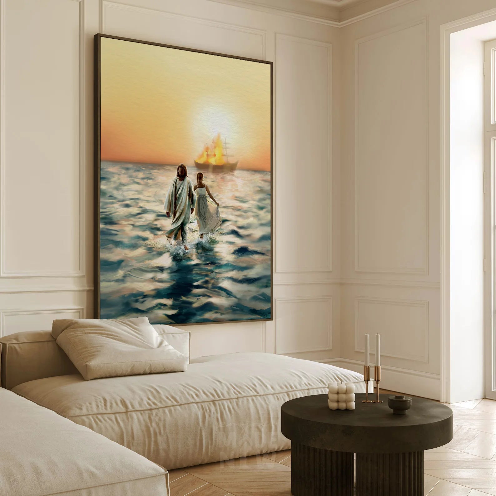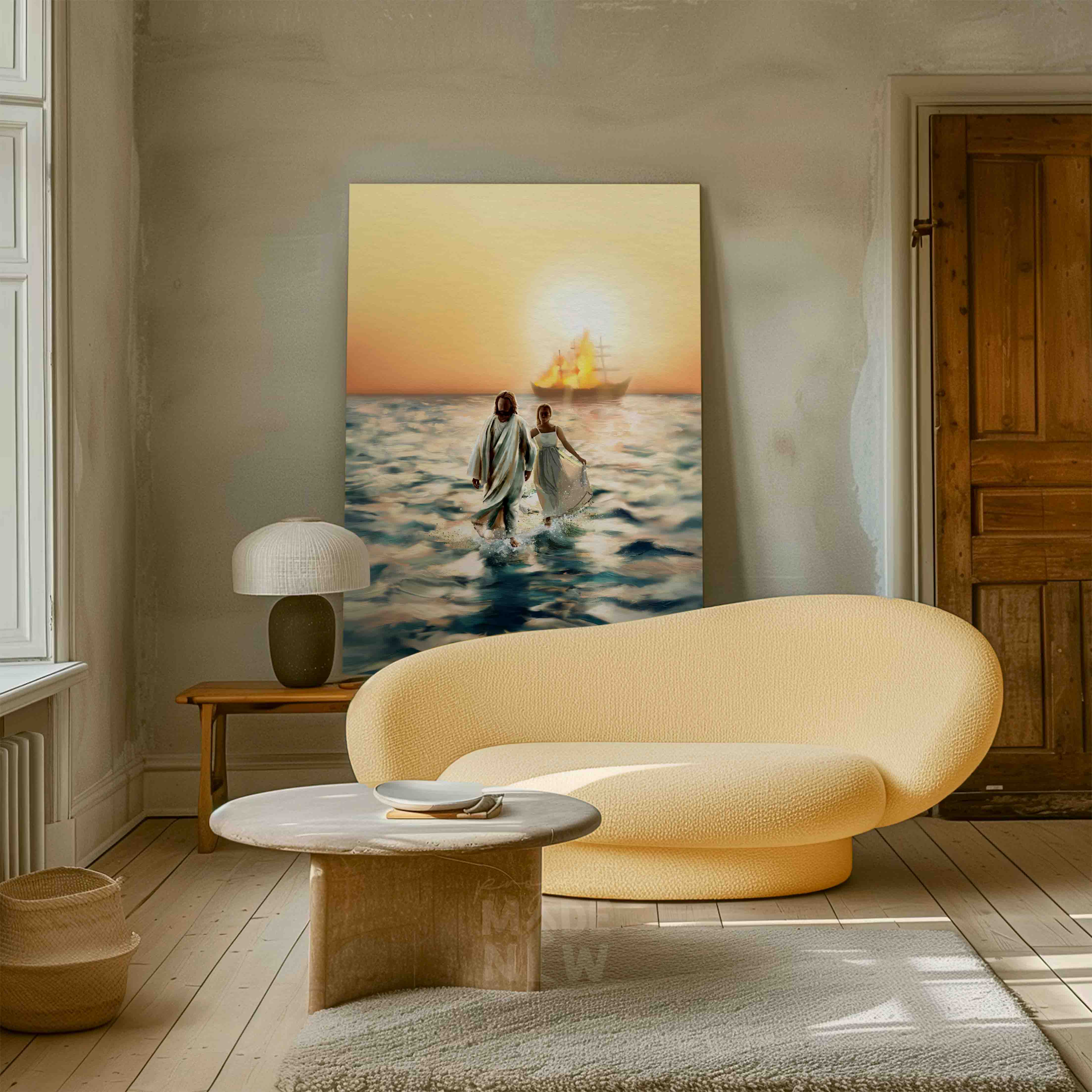 Painting of Jesus and a woman walking on water, away from the burning ship behind.