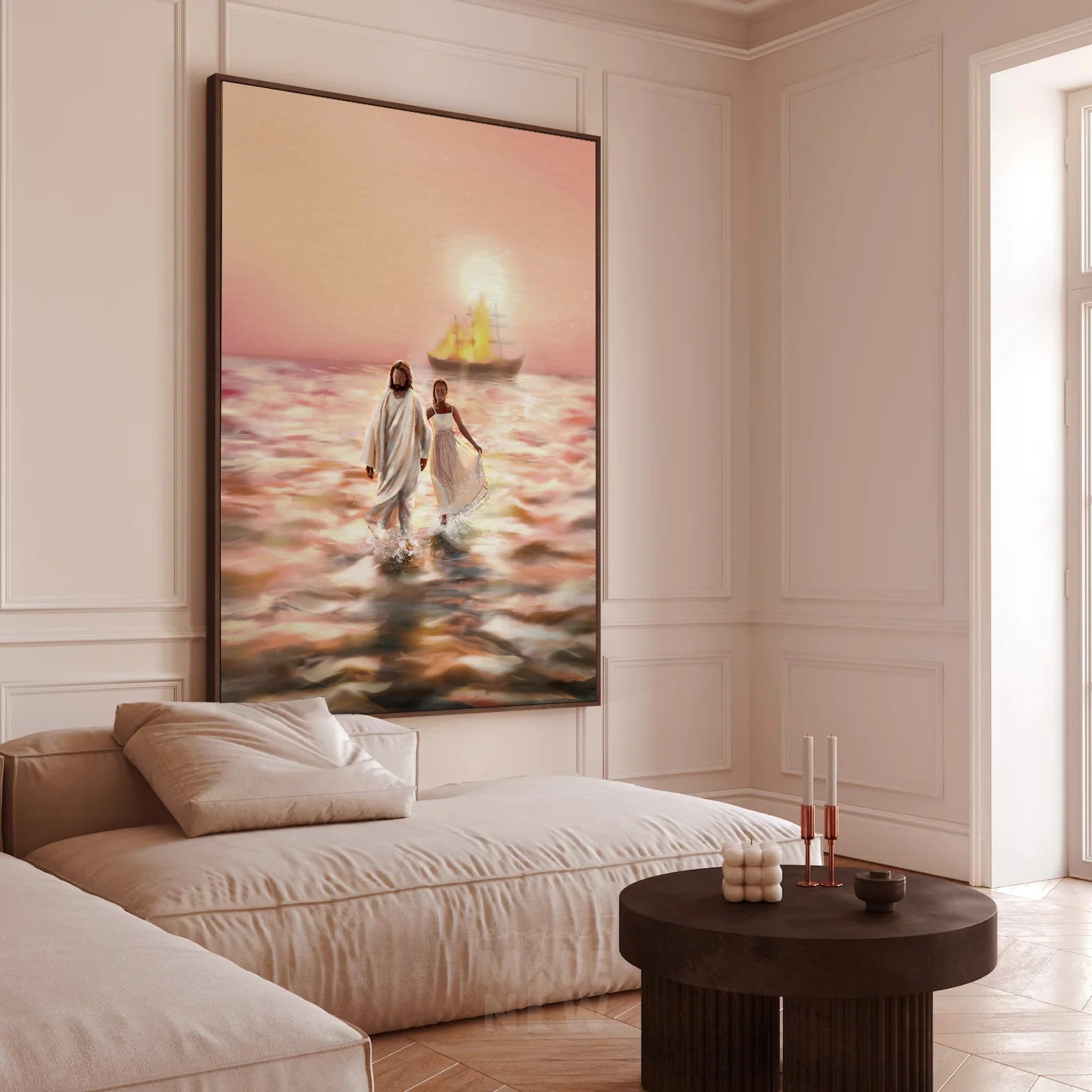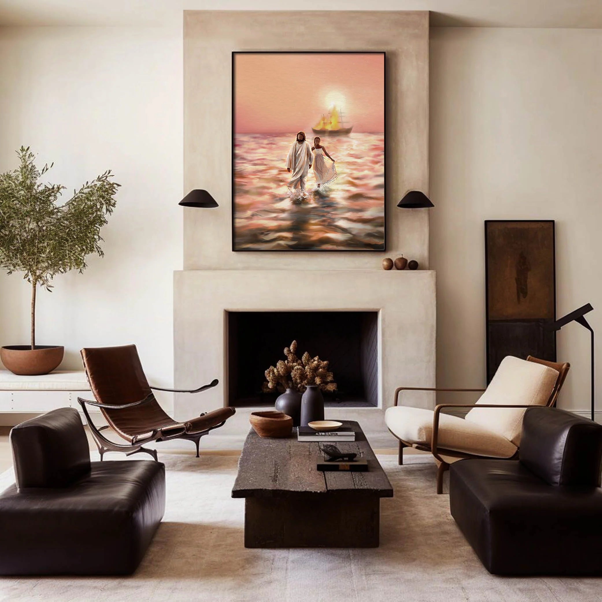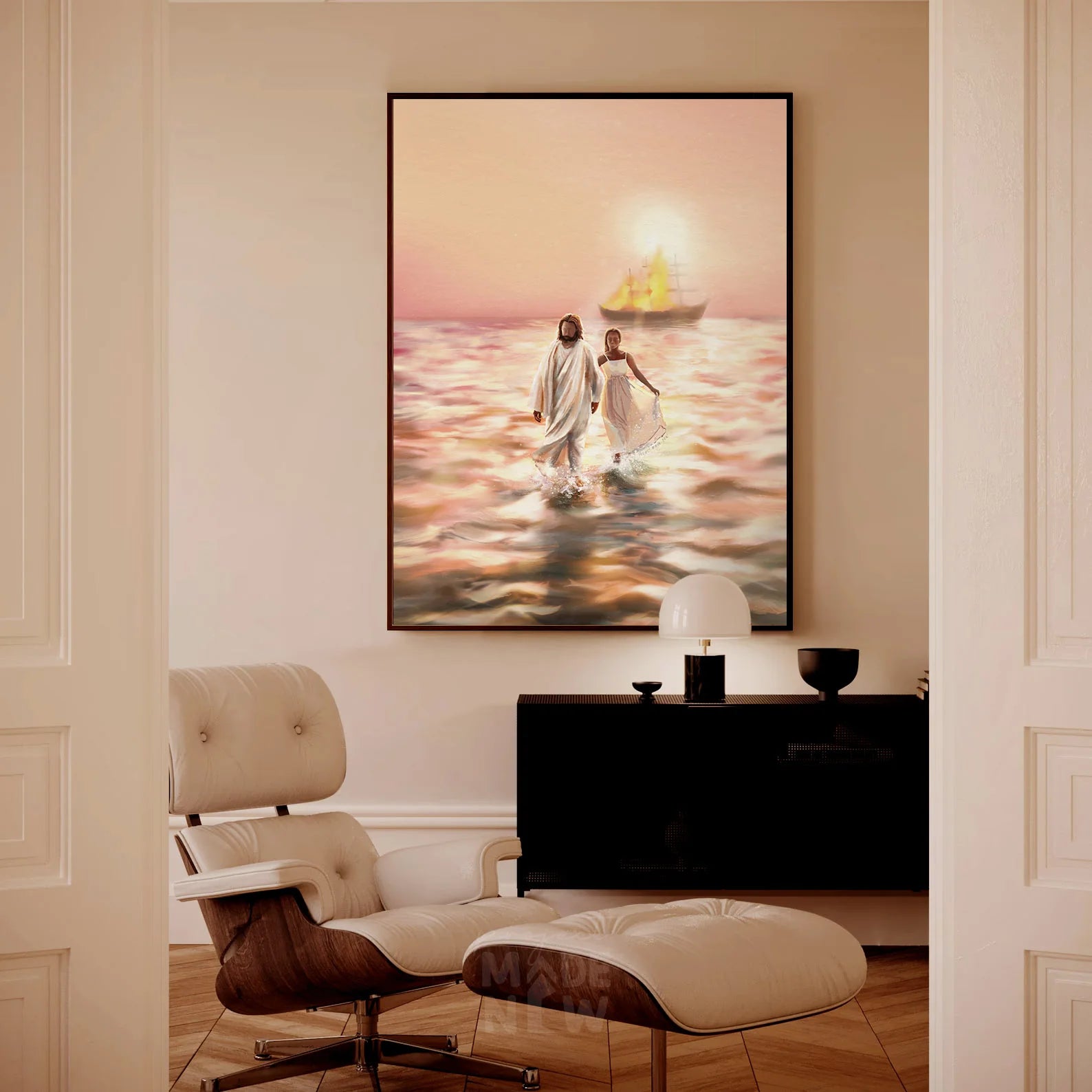 Painting of Jesus and a woman walking on water, away from the burning ship behind.