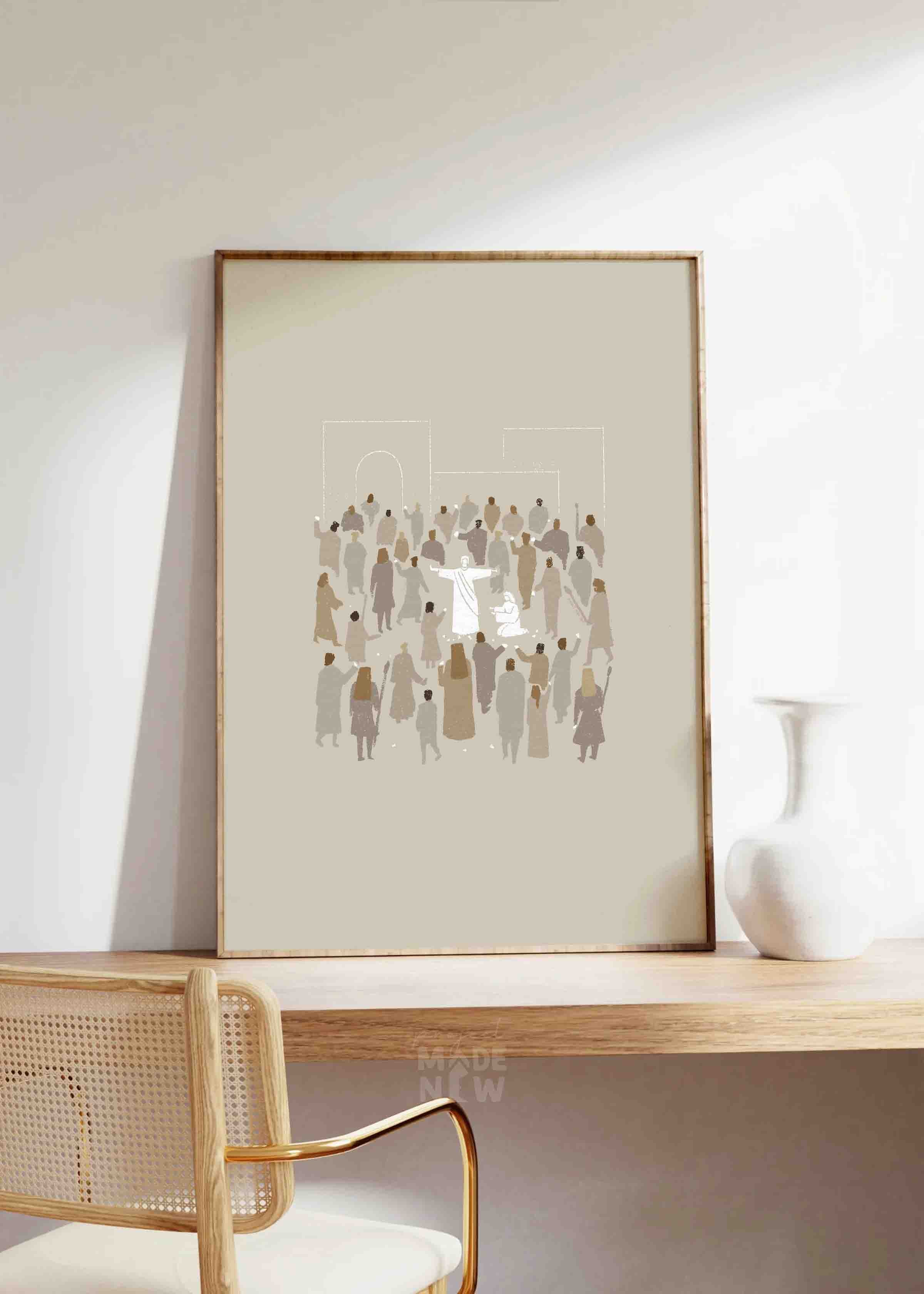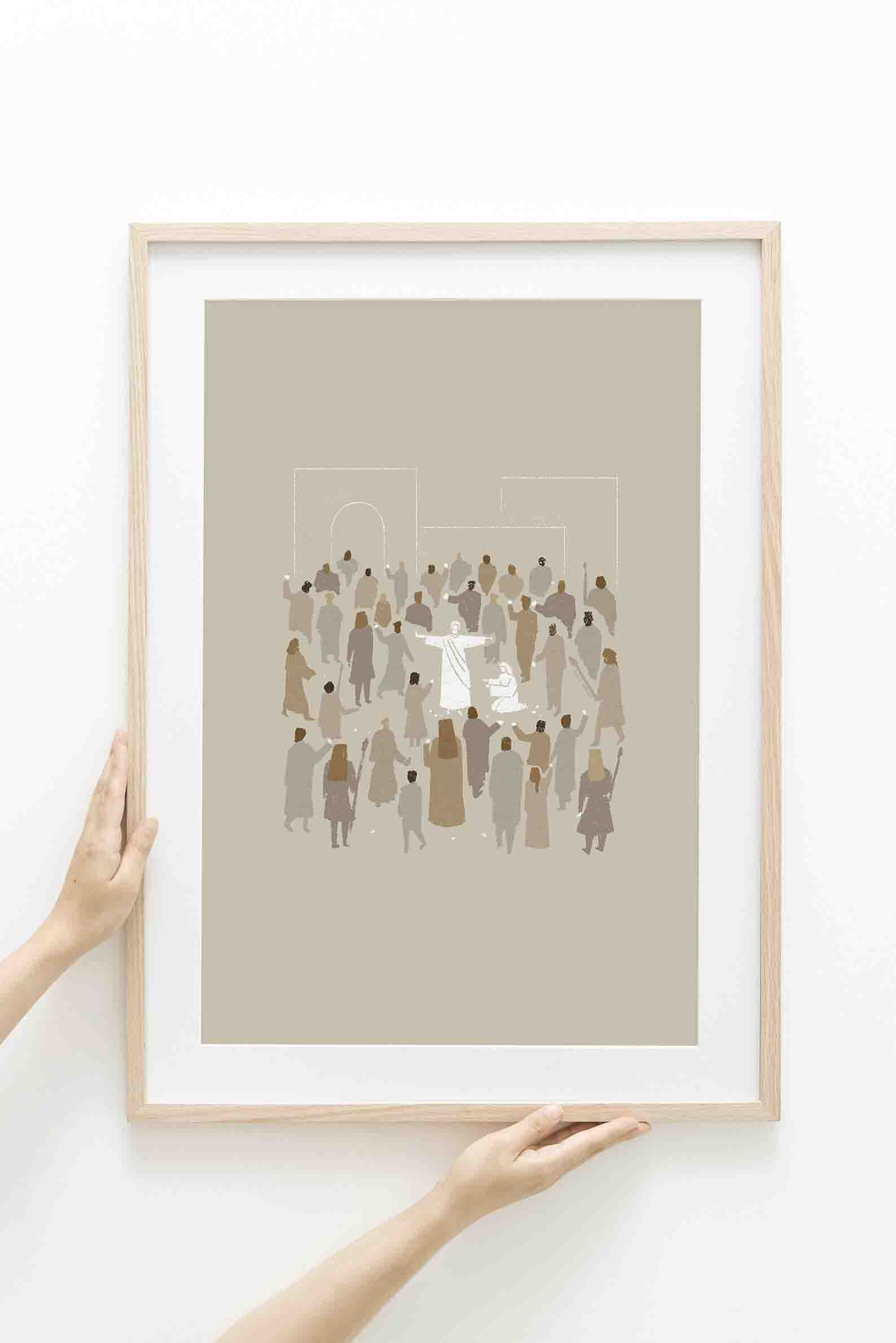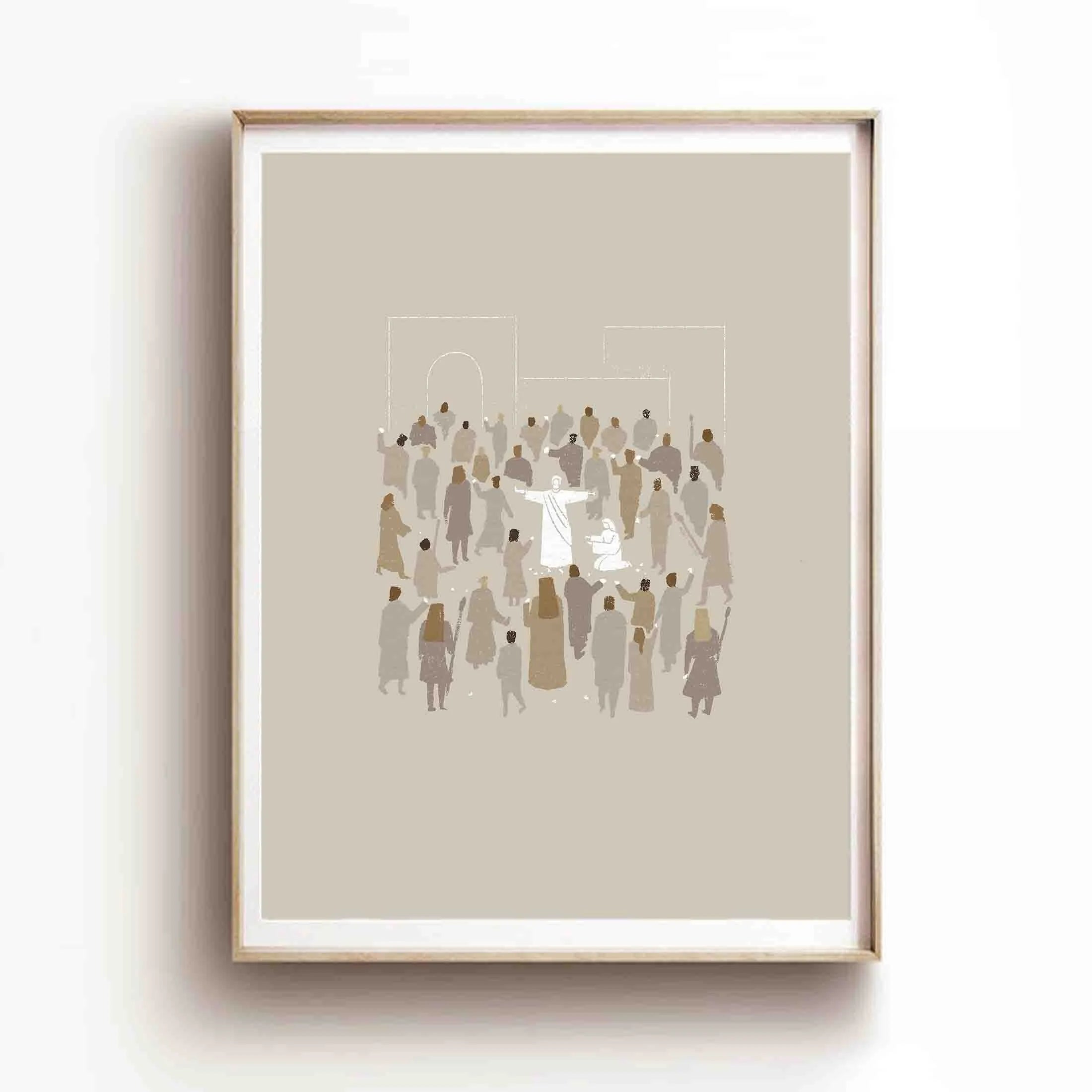 Minimalistic and modern digitally hand drawn art of Jesus saving the sinful woman who was caught in the act of adultery.