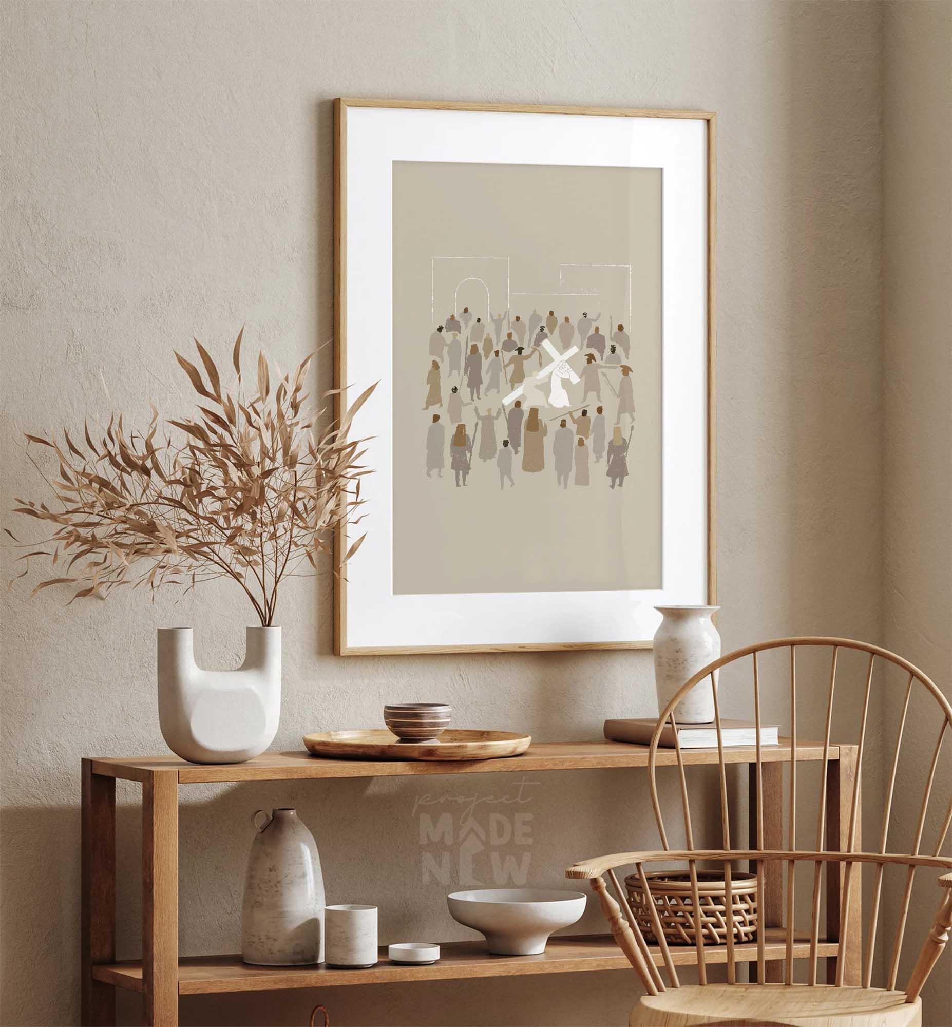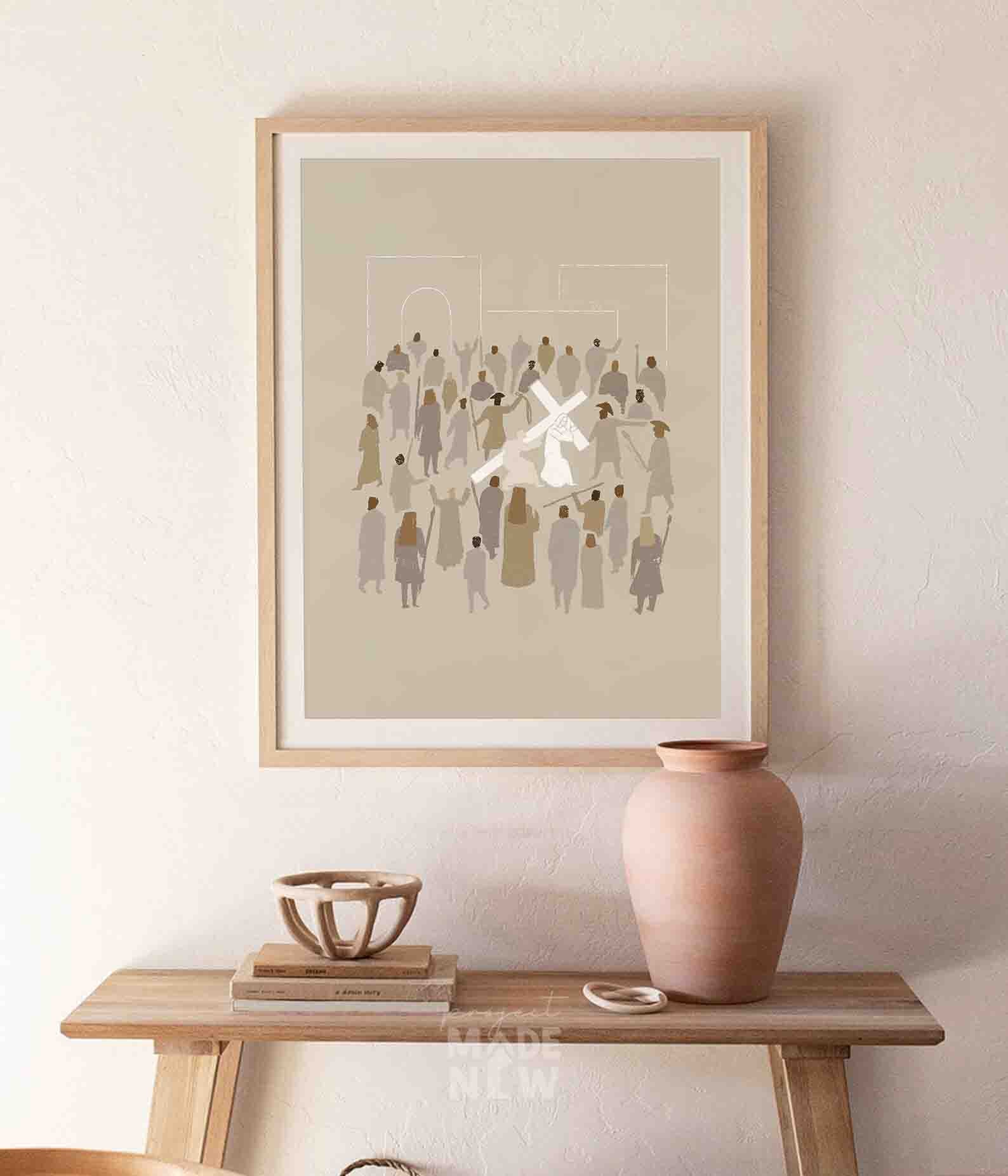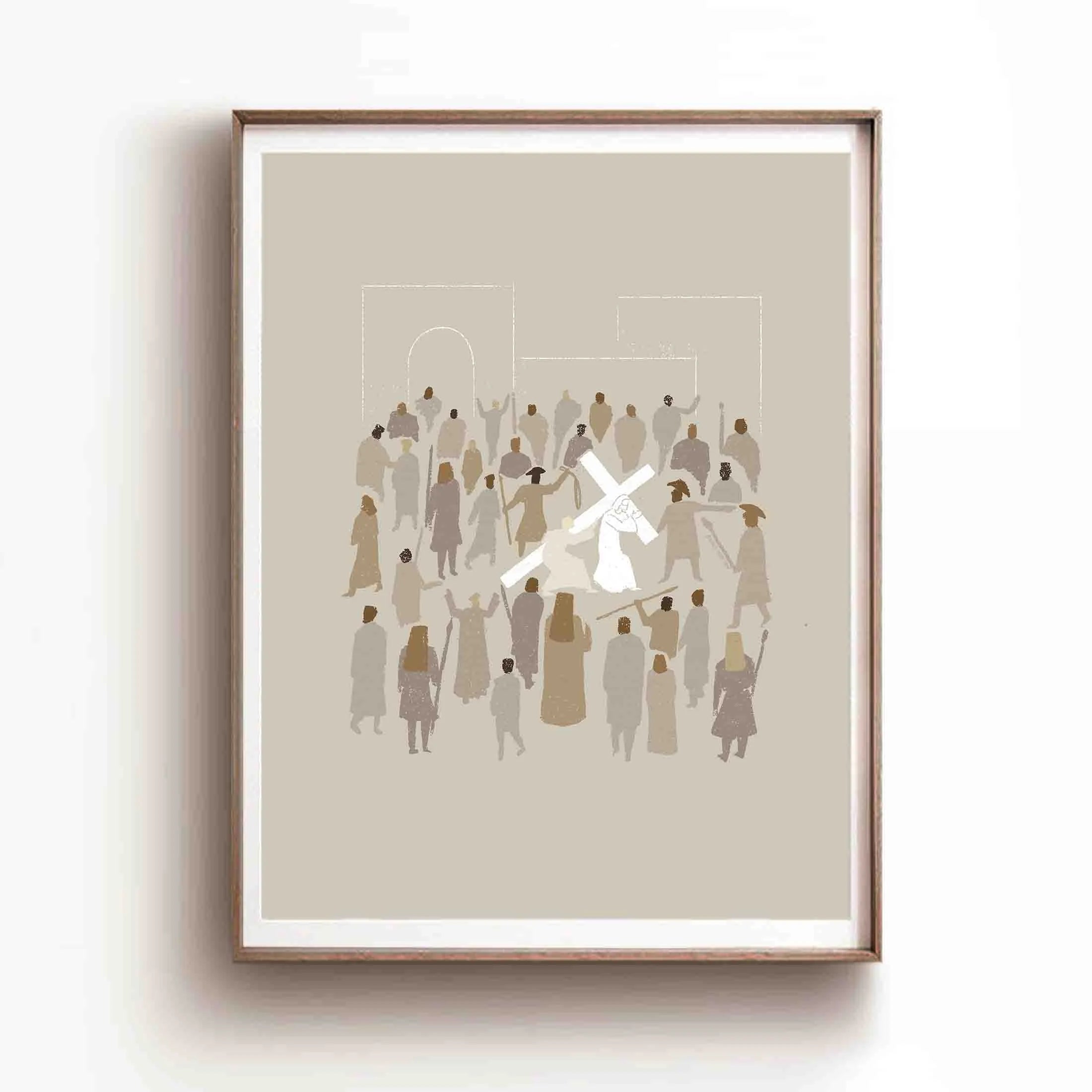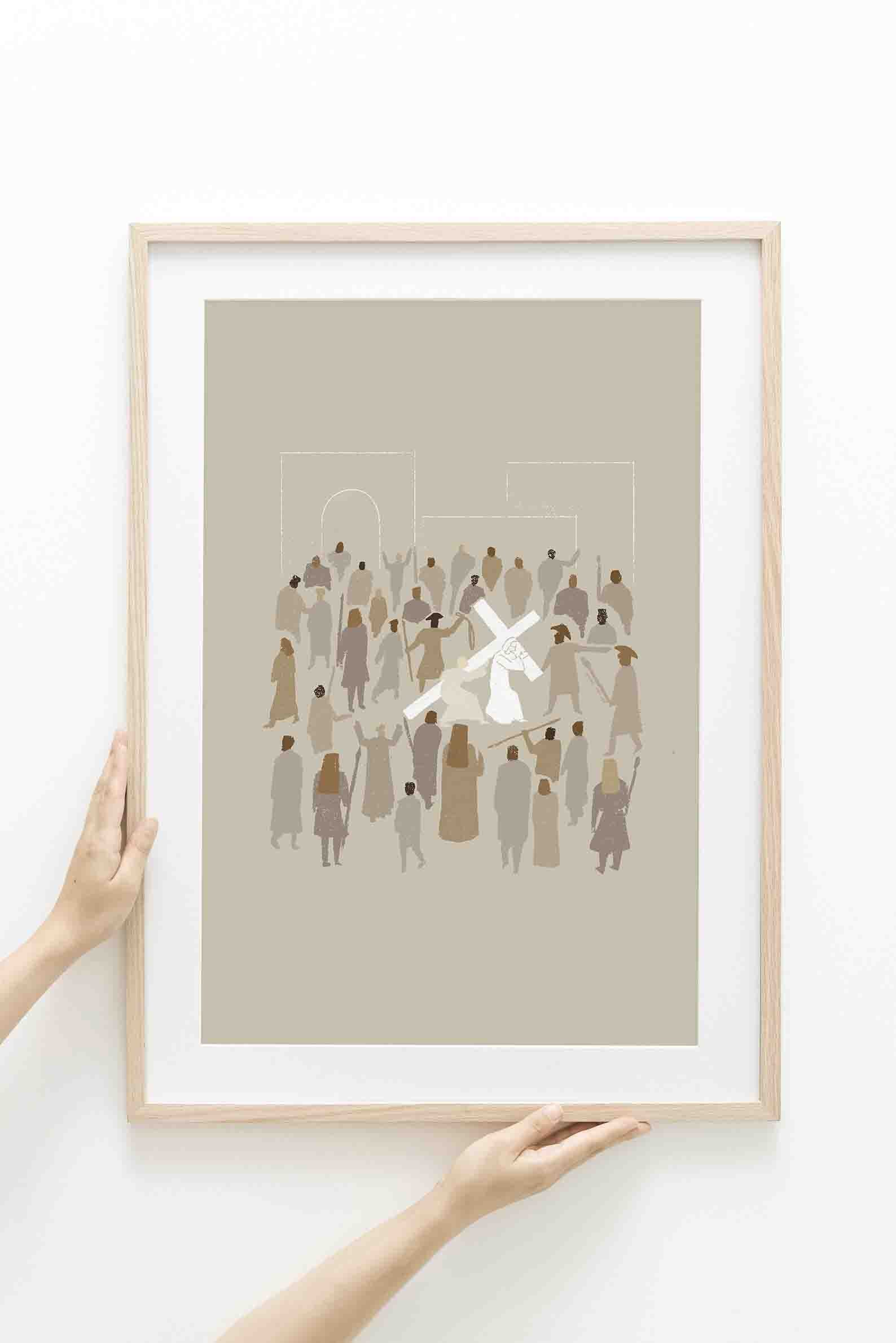 Minimalistic and modern digitally hand drawn art of the journey to Jesus Christ's crucifixion where He was ordered by the soldiers to carry the cross to the hill outside Jerusalem where He was to be crucified. Midway, Simon of Cyrene came in to help Jesus carry the cross.