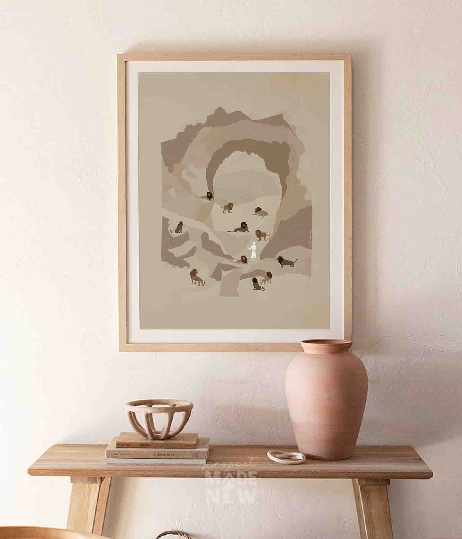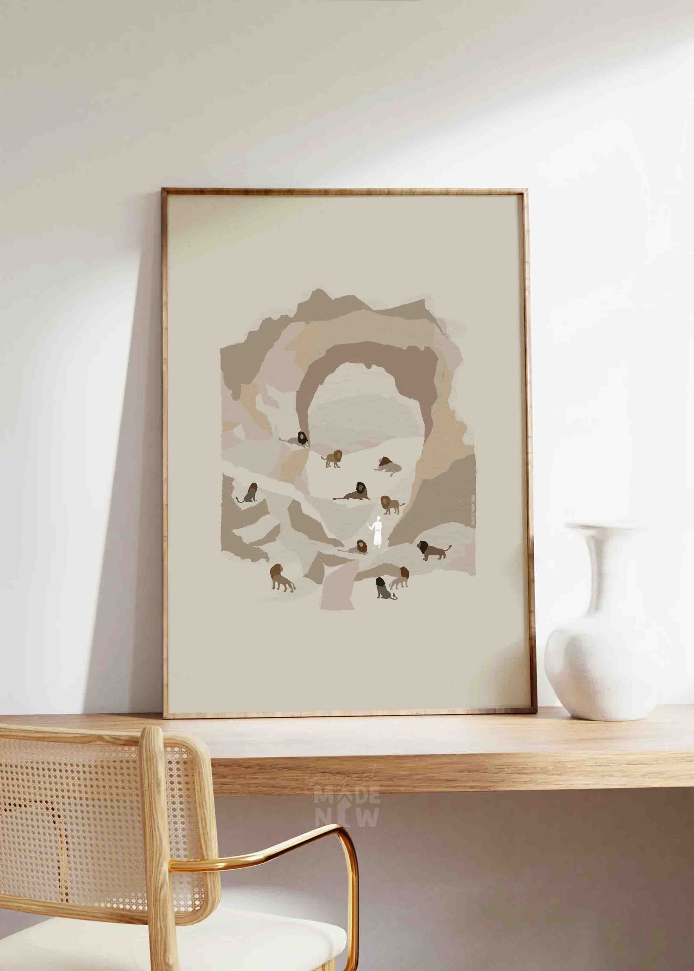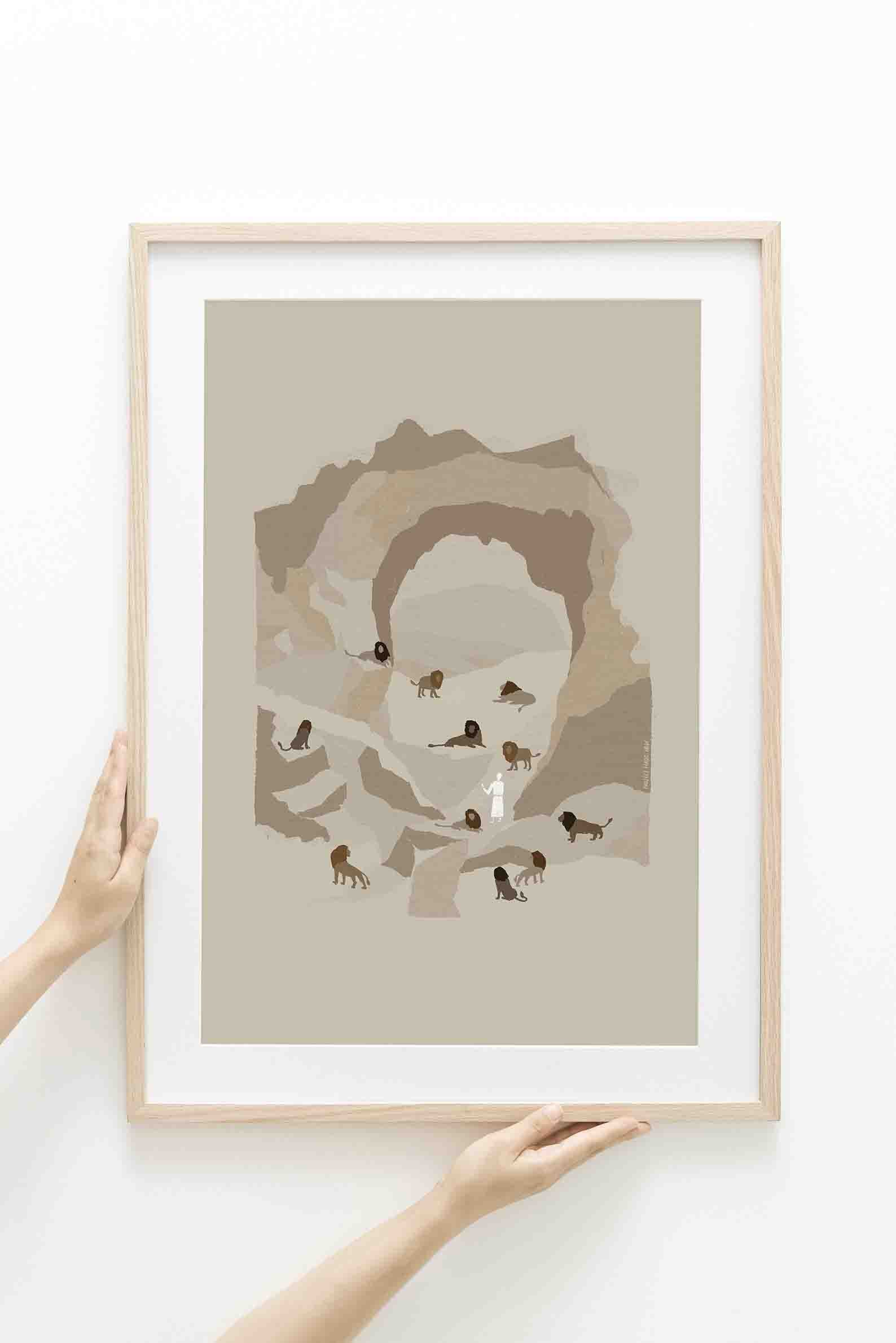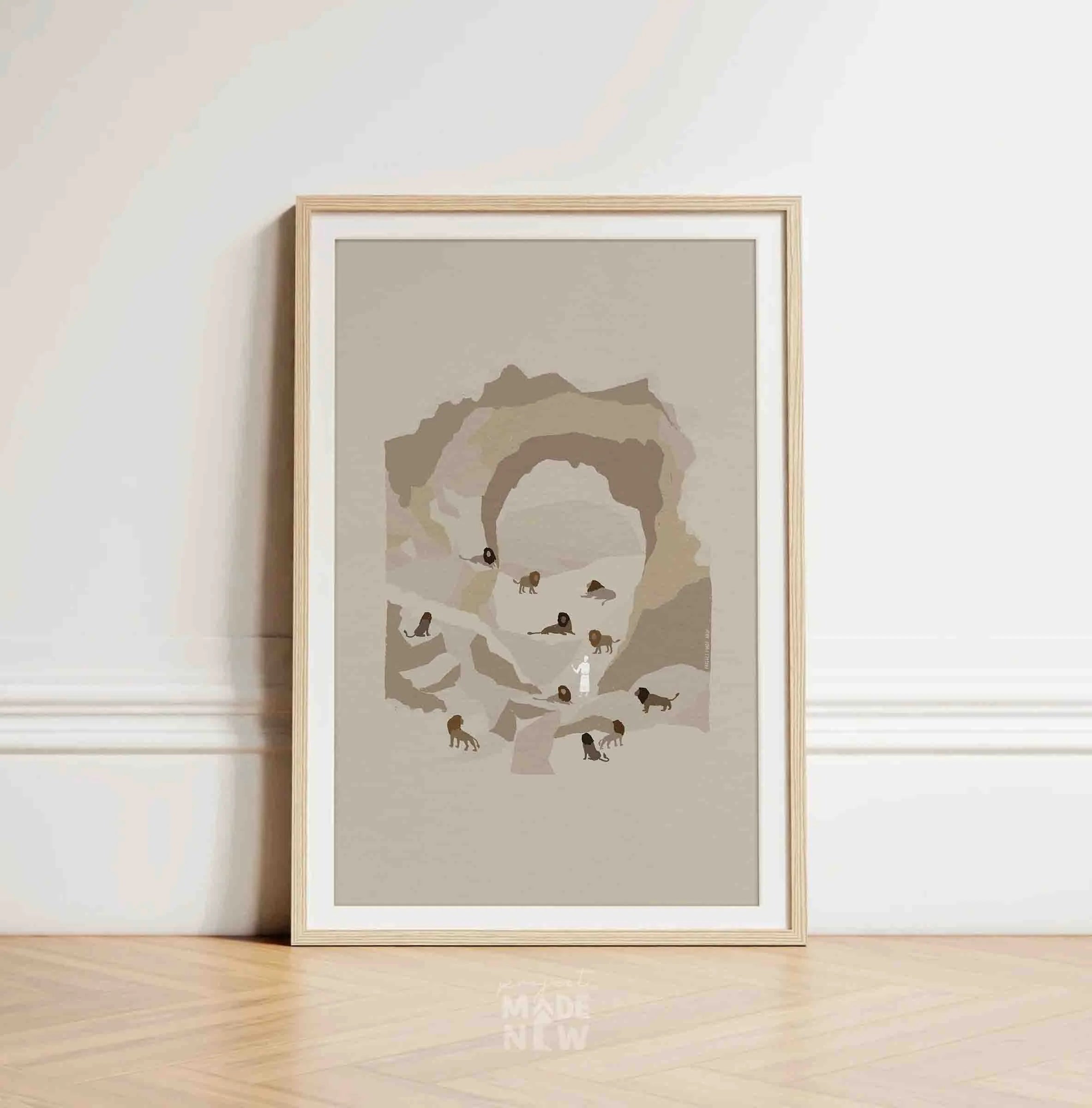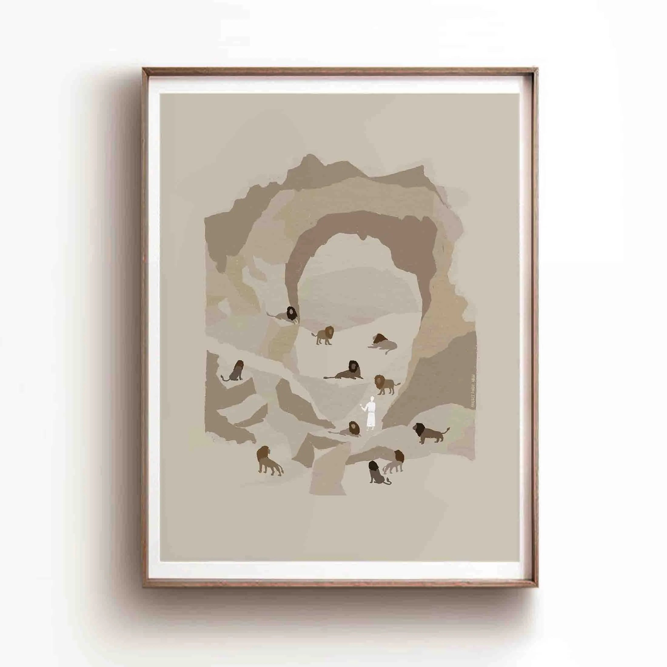 Minimalistic and modern digitally hand drawn art of Daniel 6, when Daniel was cast into a den of lions for praying three times a day. This passage of course ends with the the gracious preservation of his life by the Lord's grace, "The king declared to Daniel, “O Daniel, servant of the living God, has your God, whom you serve continually, been able to deliver you from the lions?” Then Daniel said to the king, “O king, live forever! My God sent his angel and shut the lions' mouths, and they have not harmed me, because I was found blameless before him; and also before you, O king, I have done no harm.” Then the king was exceedingly glad, and commanded that Daniel be taken up out of the den." Daniel 6:20-23