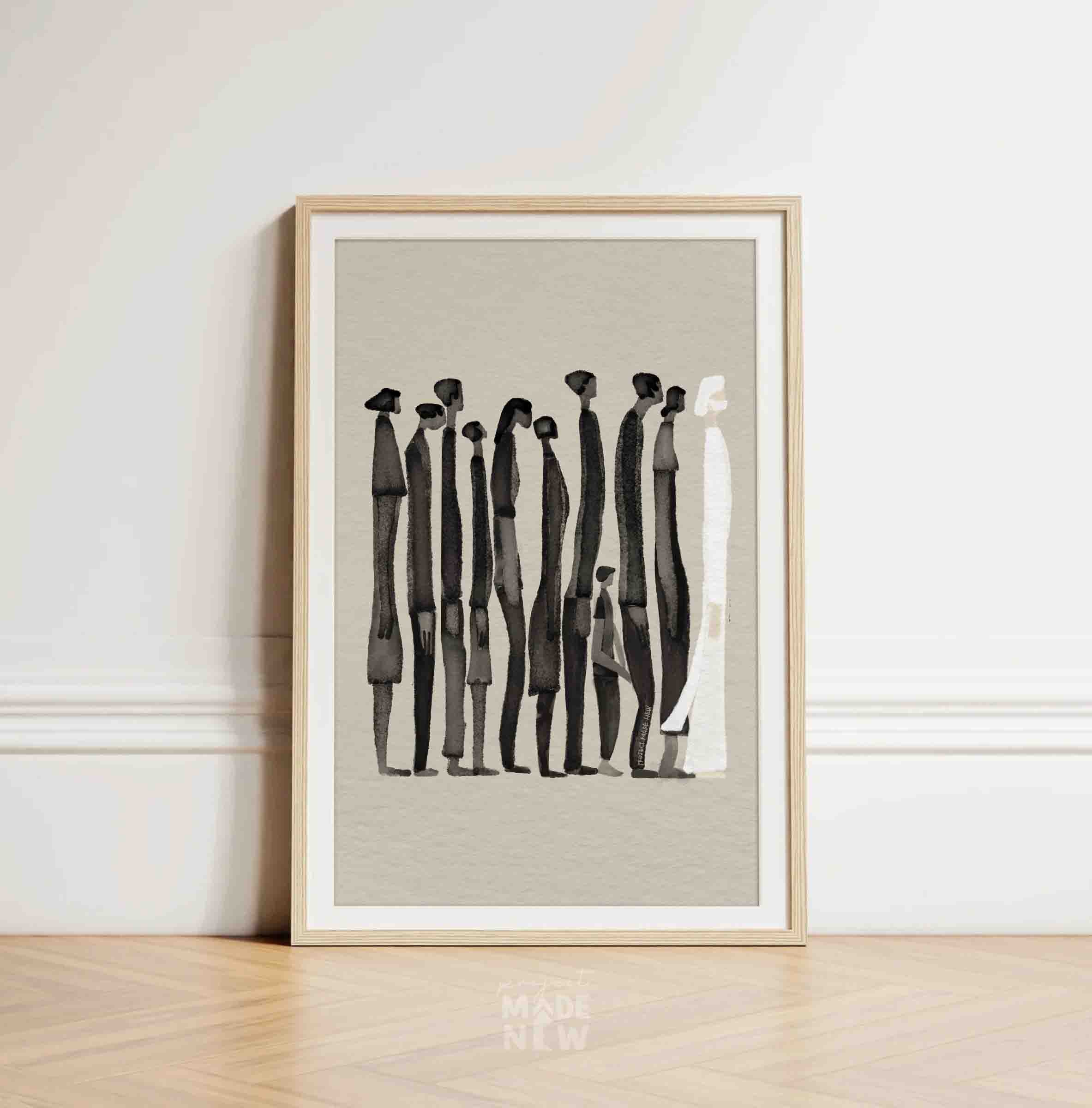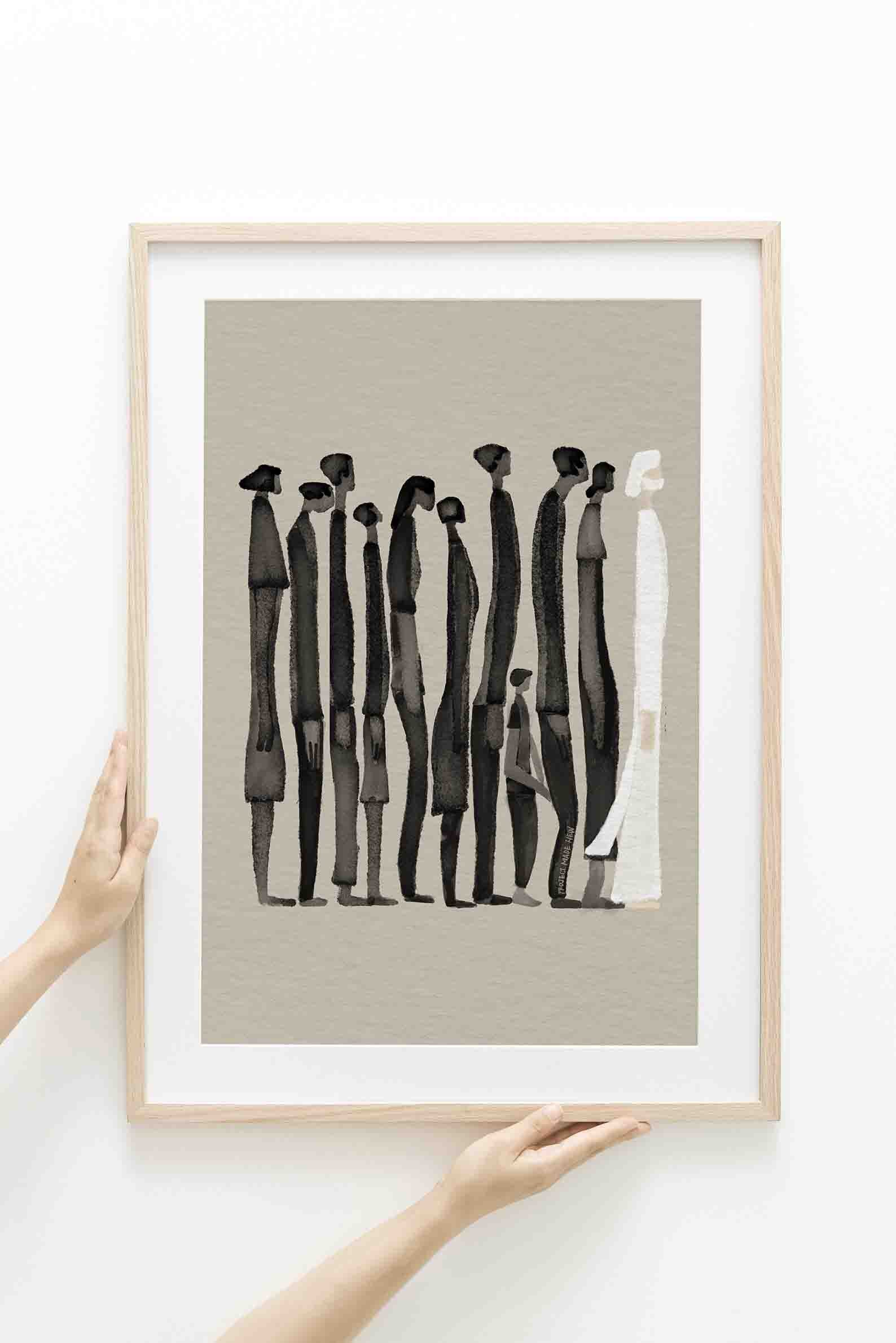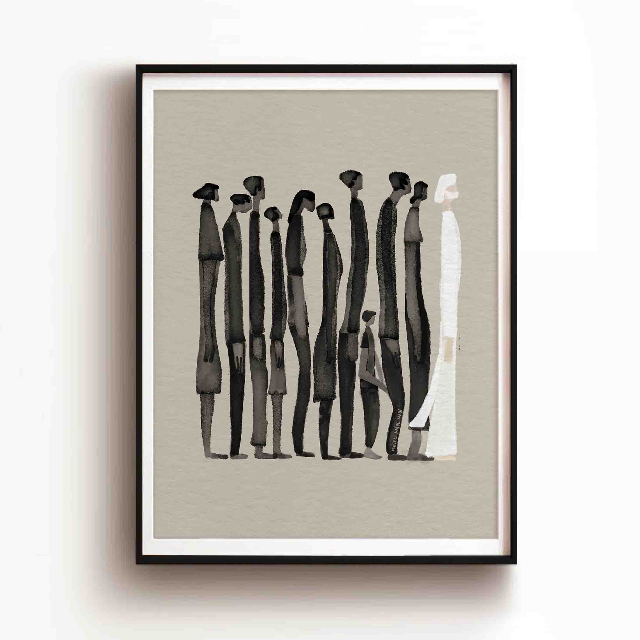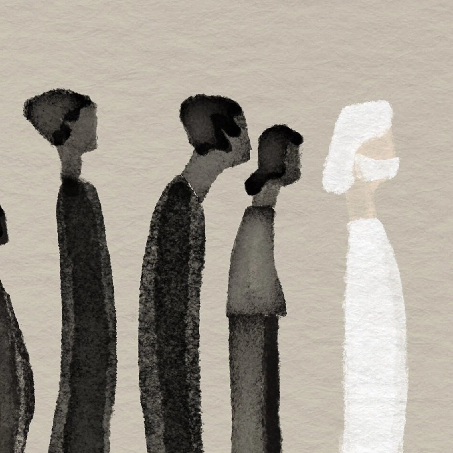 Minimalistic and modern hand drawn watercolor art of people following Jesus.