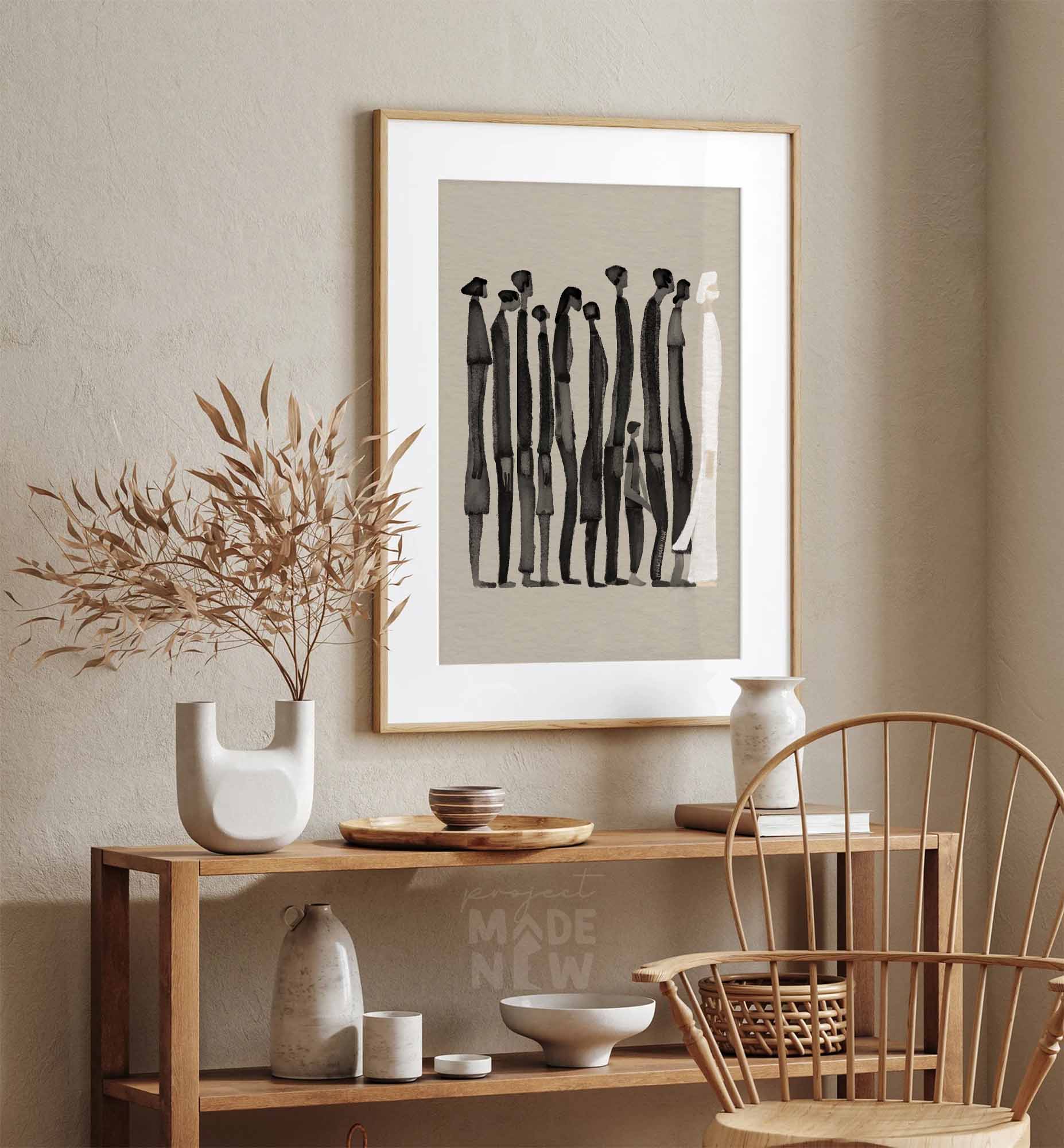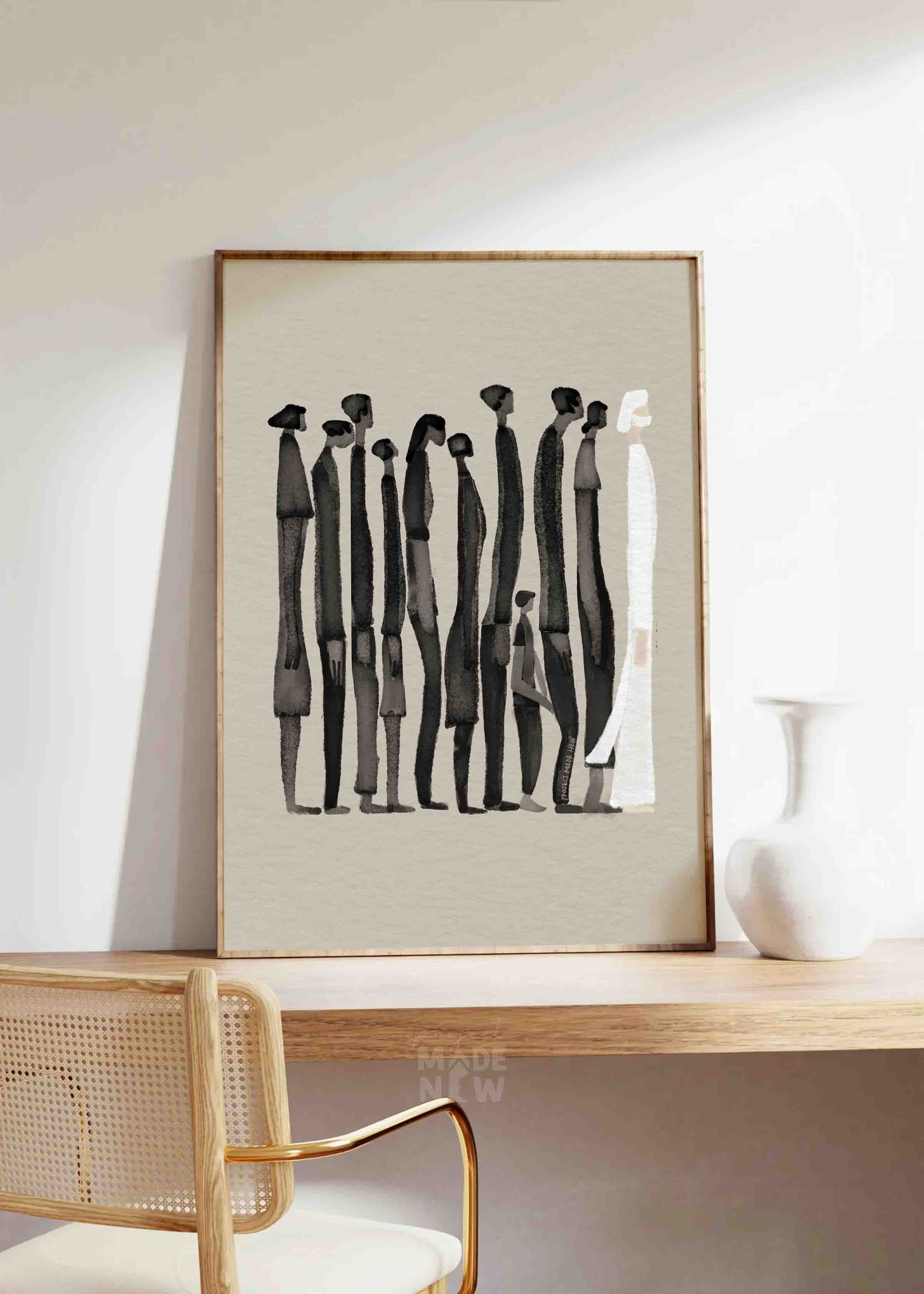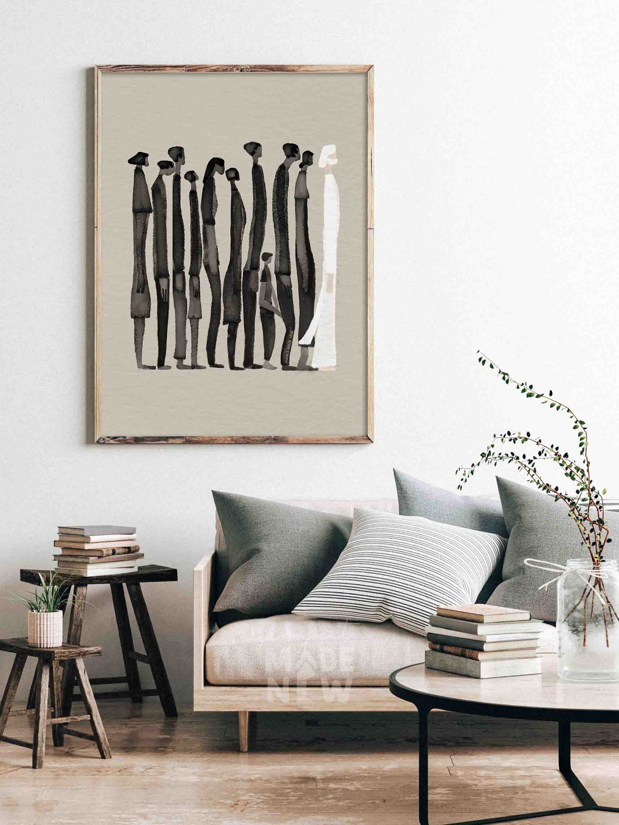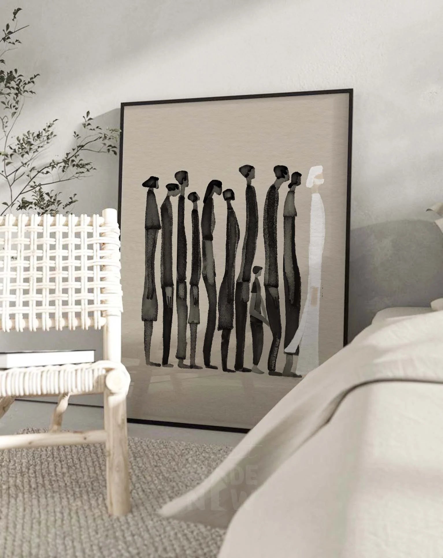 Minimalistic and modern hand drawn watercolor art of people following Jesus.