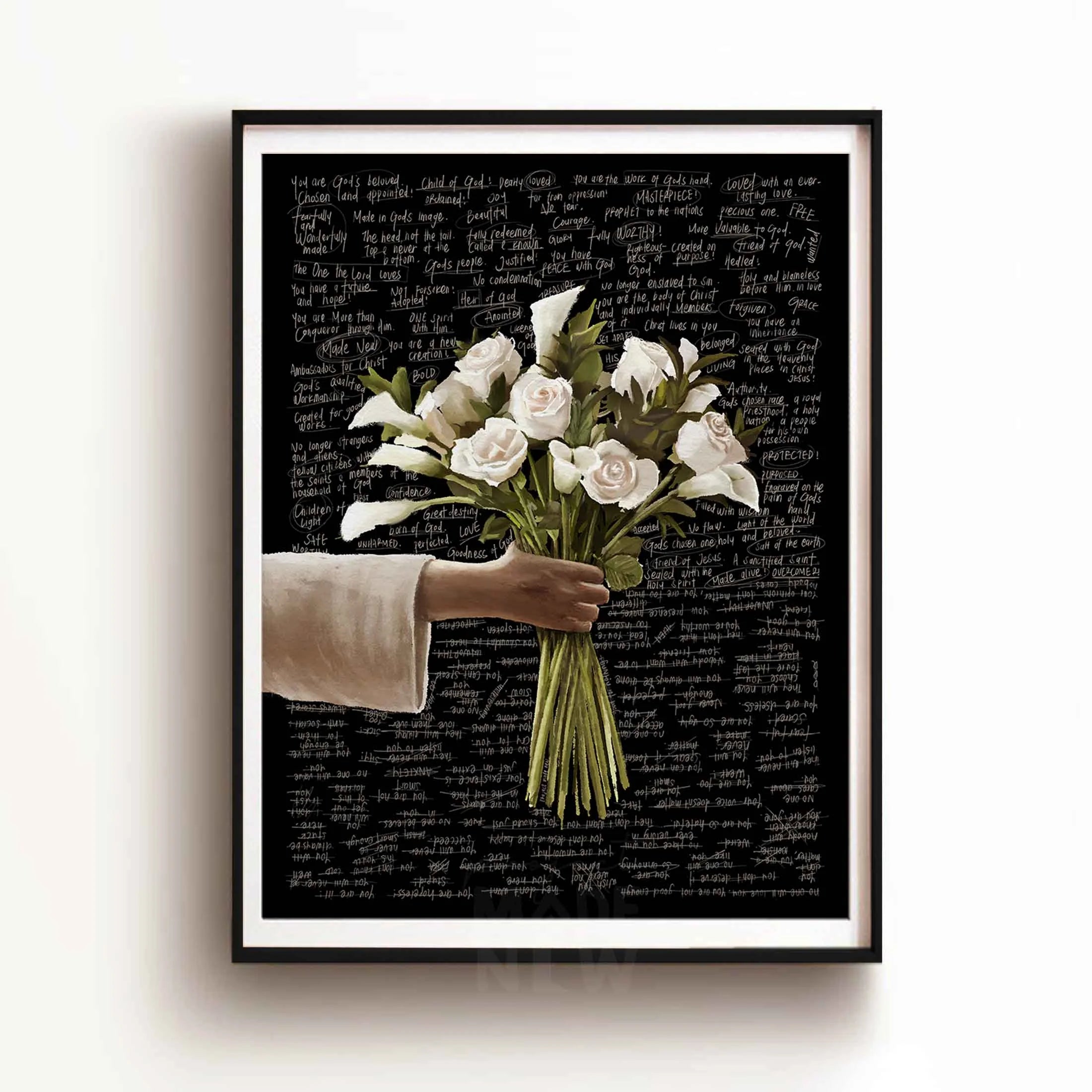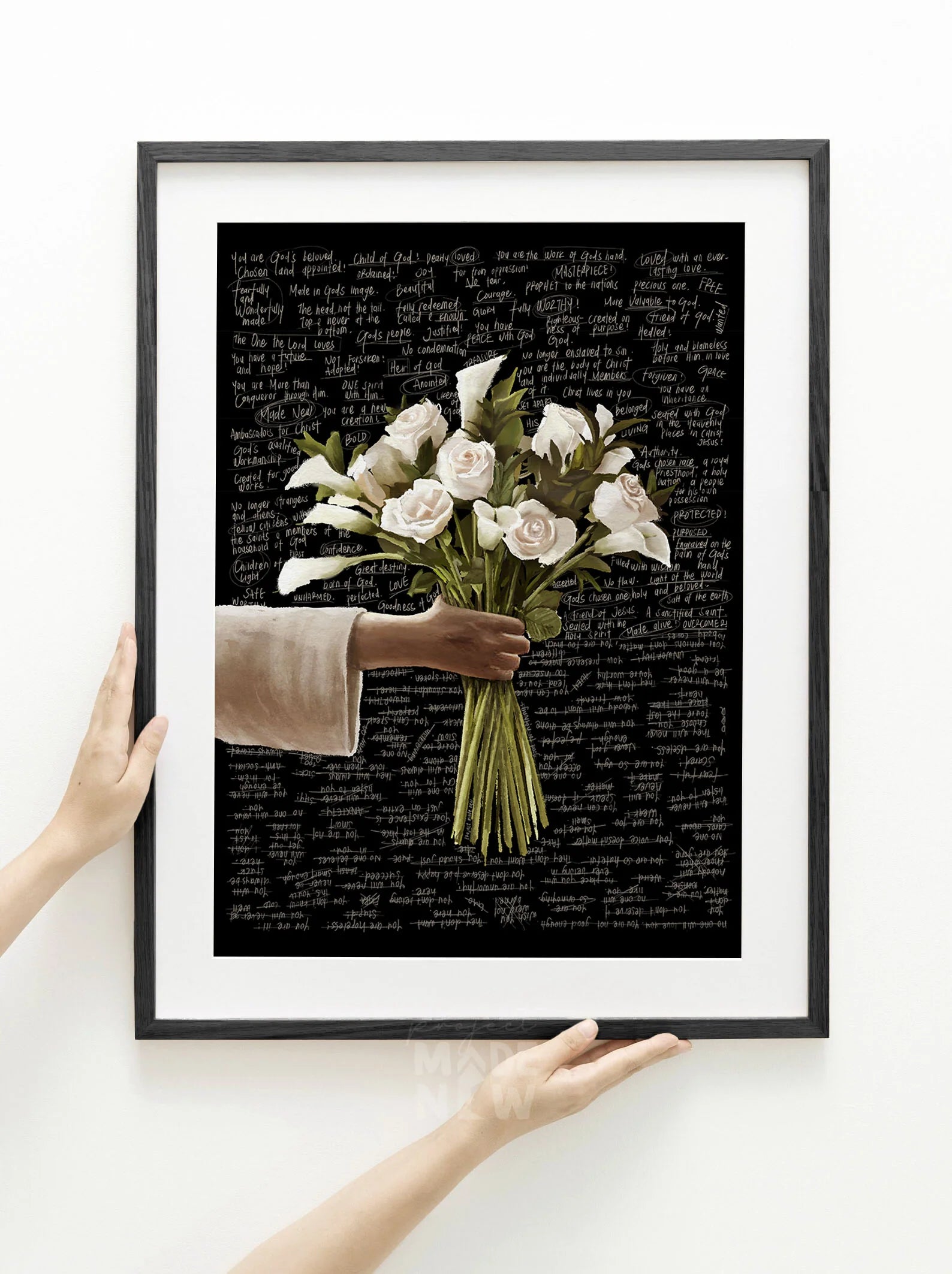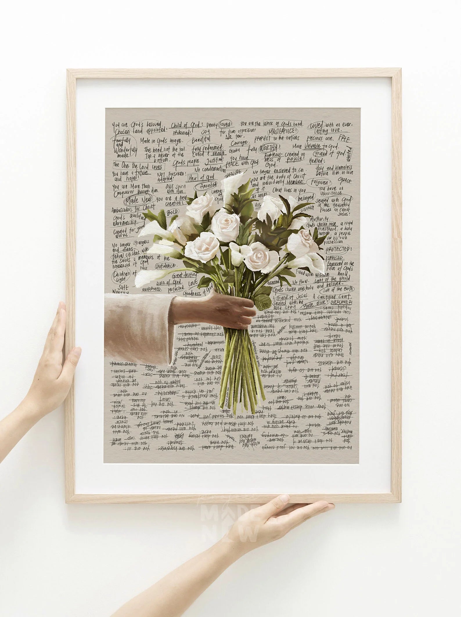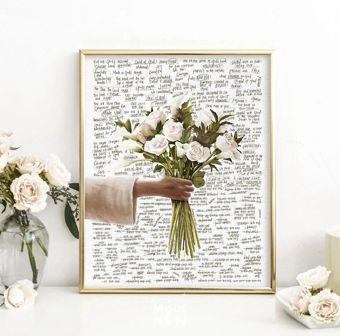 This artwork depicts Jesus's hand holding a bouquet to you because you are His beloved. It contains bible verses on identity and crossed-out false labels that the world puts on you. We want you to be reminded everyday of your life of the truth of who you are. Knowing your God-given identity can give you confidence, self-esteem, and awareness. It reveals to you your deeper purpose. Knowing who you are changes everything.