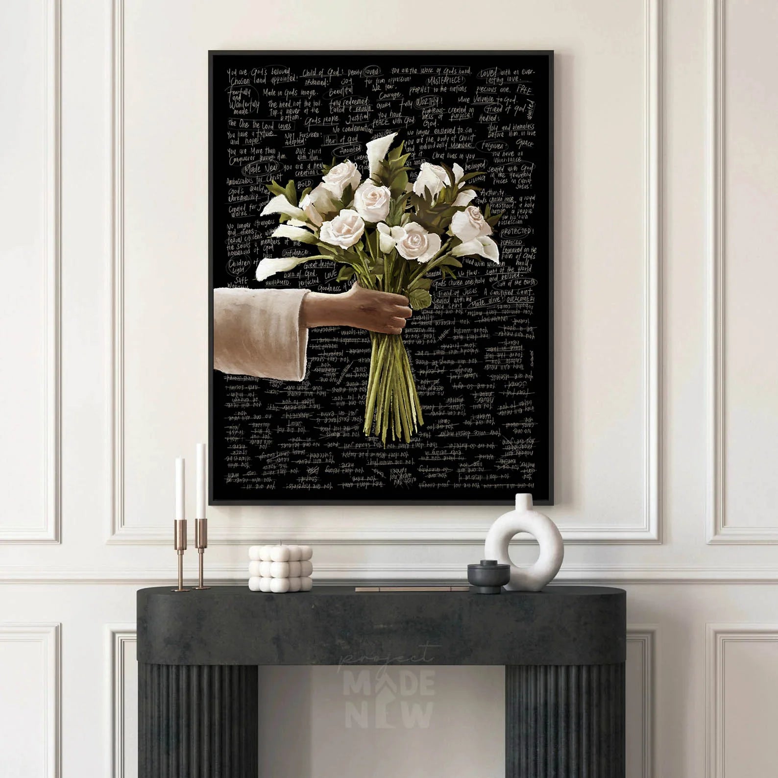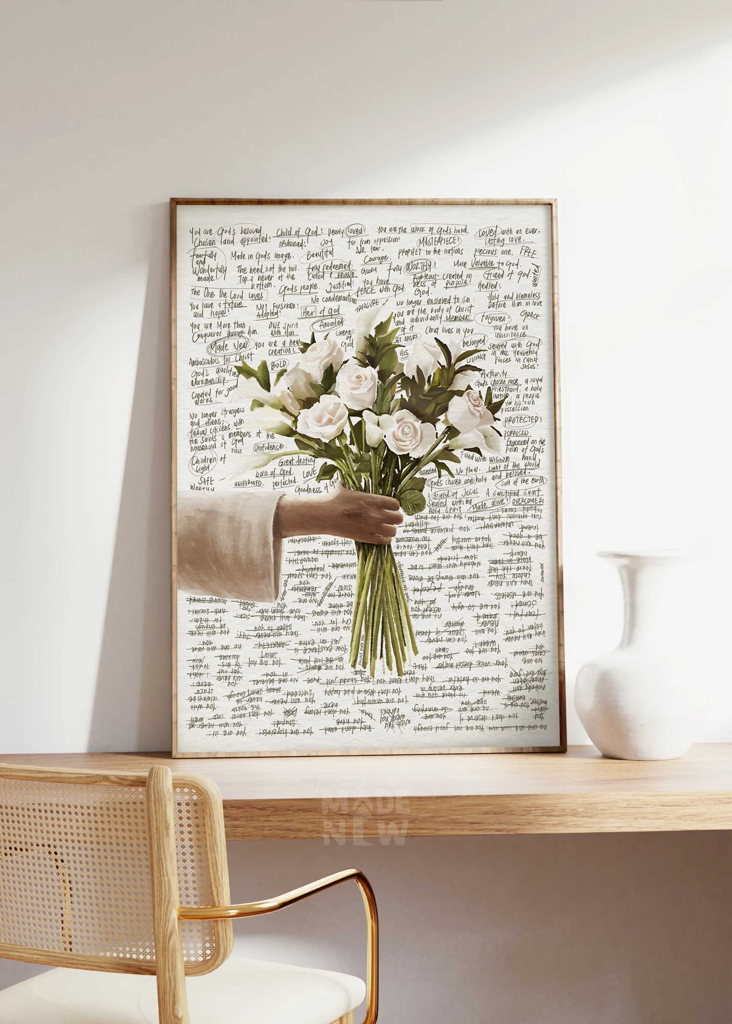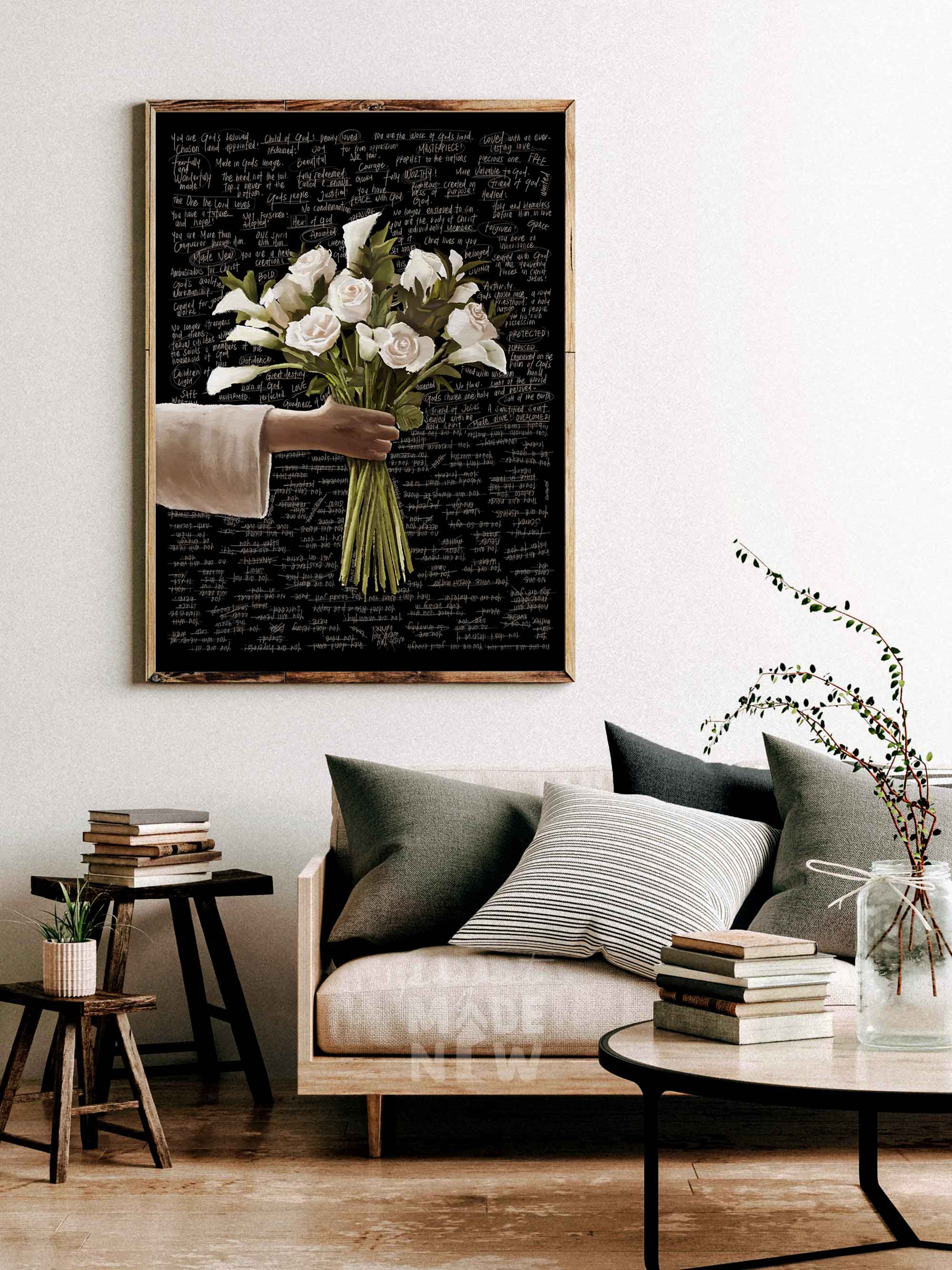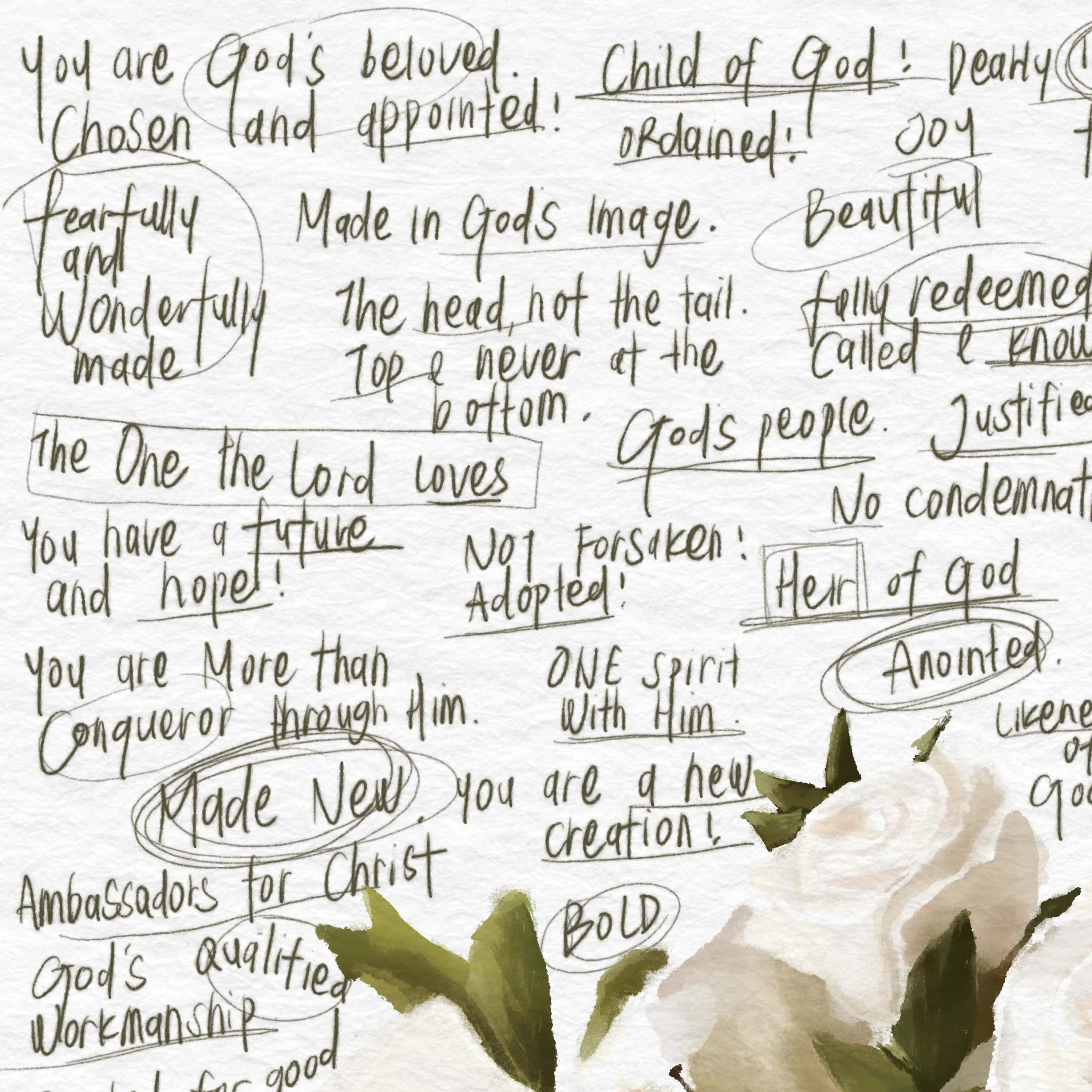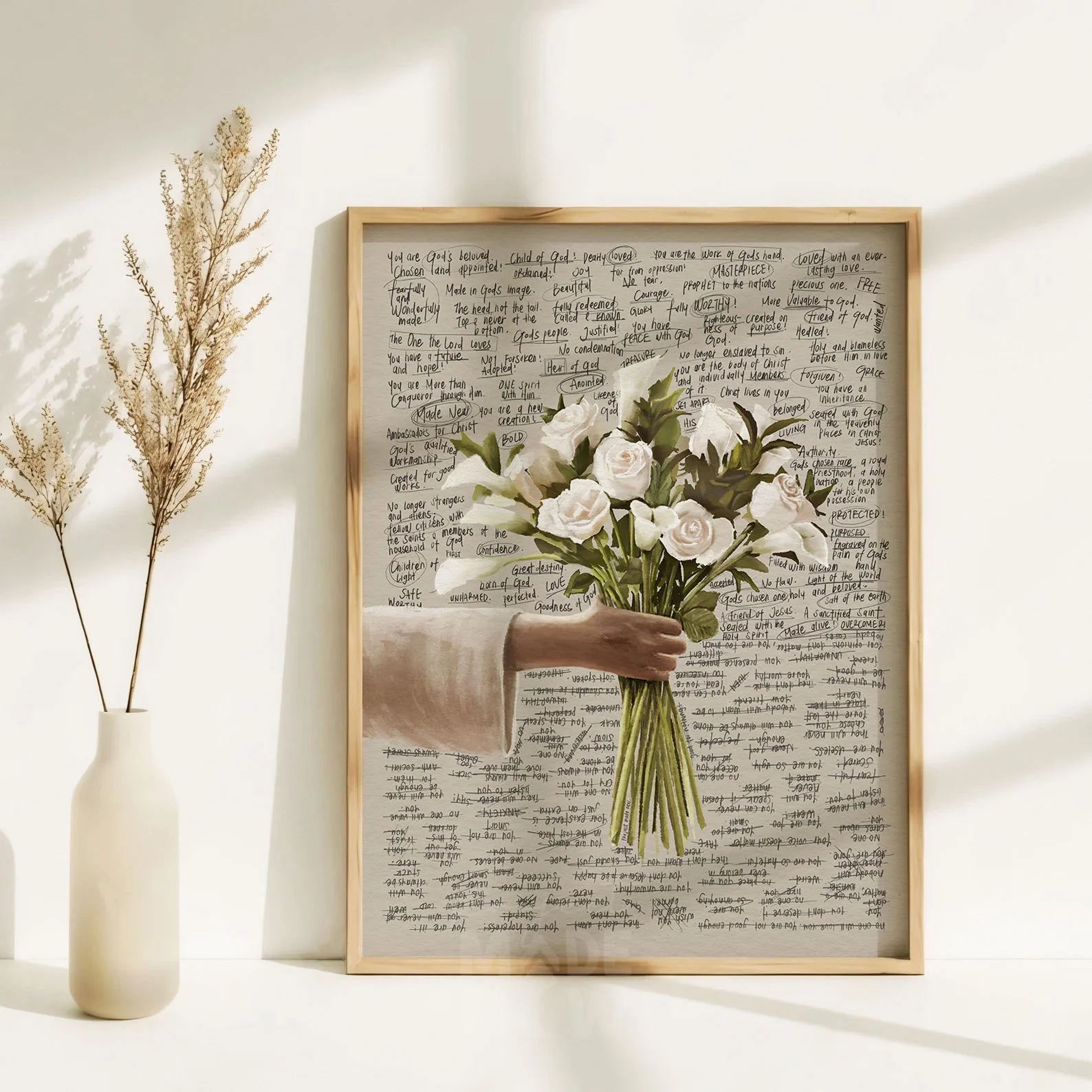 This artwork depicts Jesus's hand holding a bouquet to you because you are His beloved. It contains bible verses on identity and crossed-out false labels that the world puts on you. We want you to be reminded everyday of your life of the truth of who you are. Knowing your God-given identity can give you confidence, self-esteem, and awareness. It reveals to you your deeper purpose. Knowing who you are changes everything.