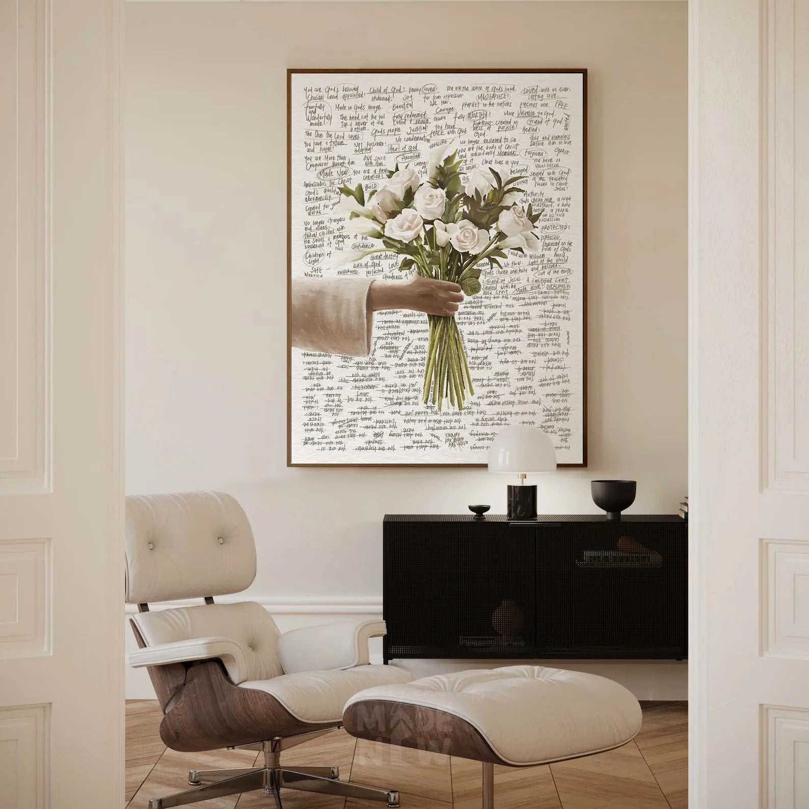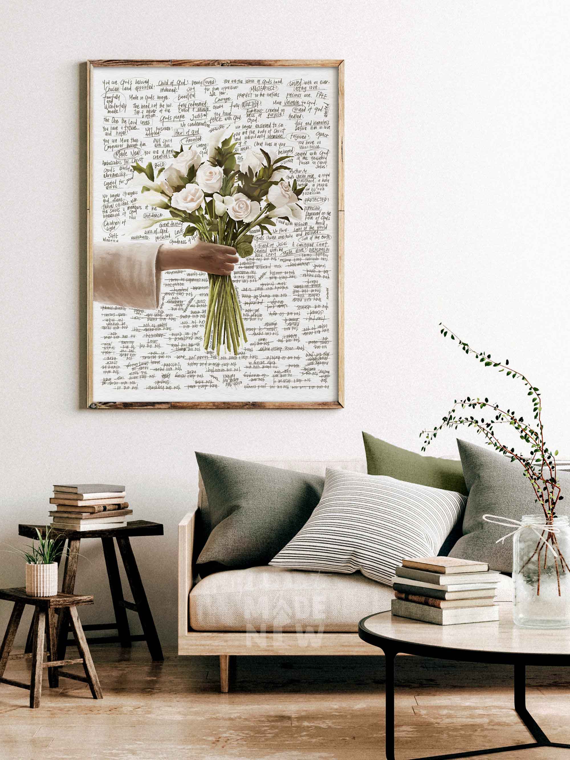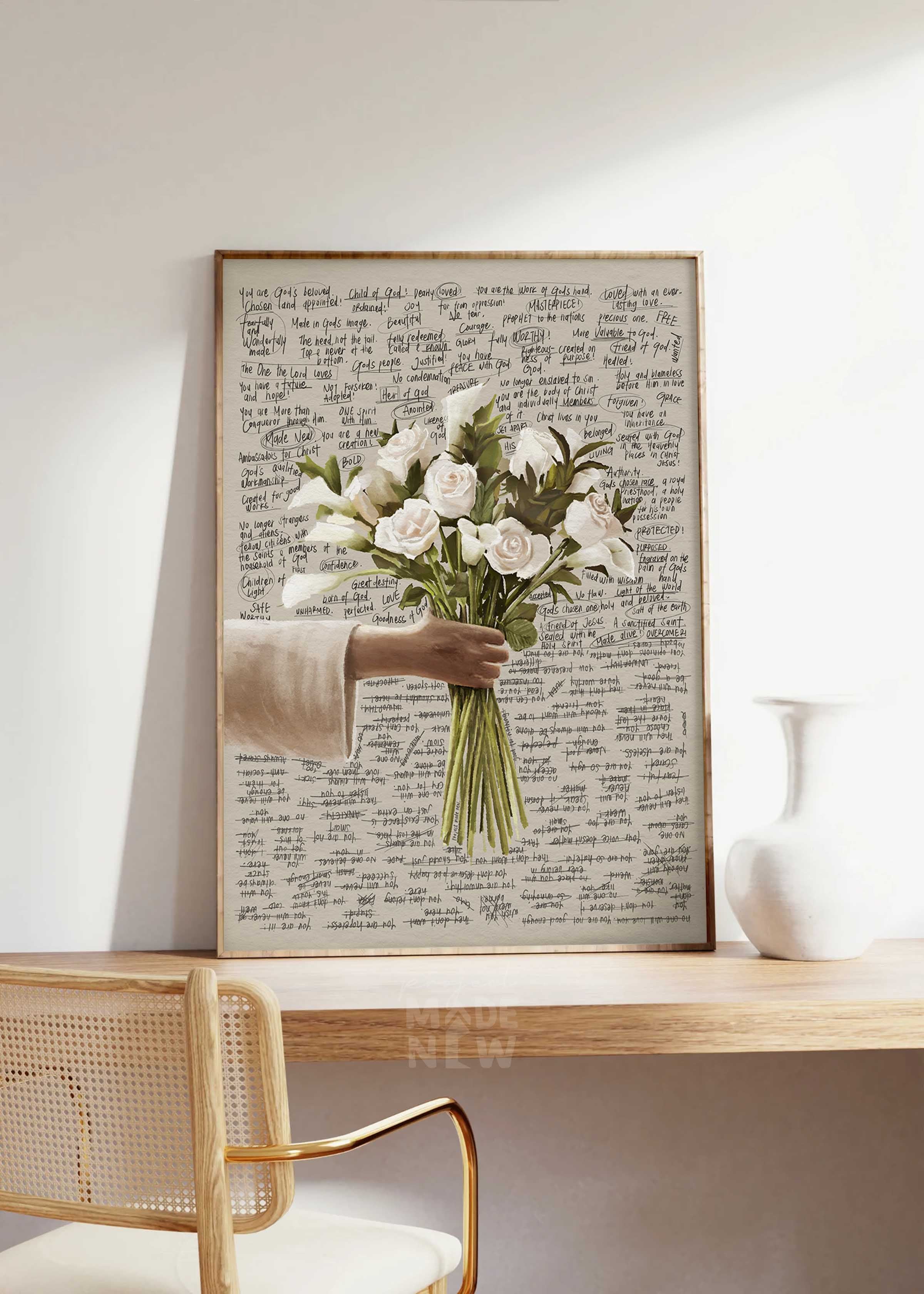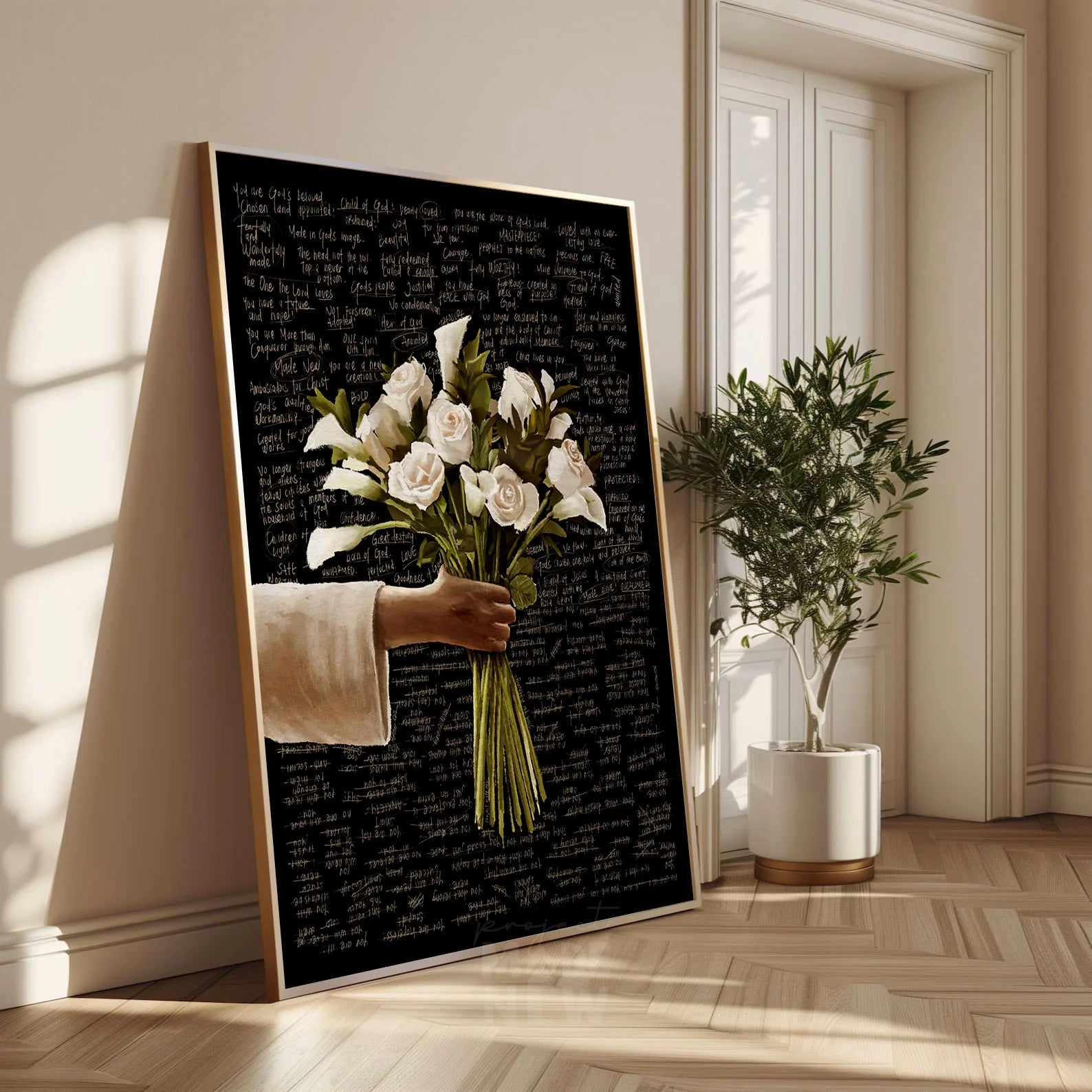 This artwork depicts Jesus's hand holding a bouquet to you because you are His beloved. It contains bible verses on identity and crossed-out false labels that the world puts on you. We want you to be reminded everyday of your life of the truth of who you are. Knowing your God-given identity can give you confidence, self-esteem, and awareness. It reveals to you your deeper purpose. Knowing who you are changes everything.