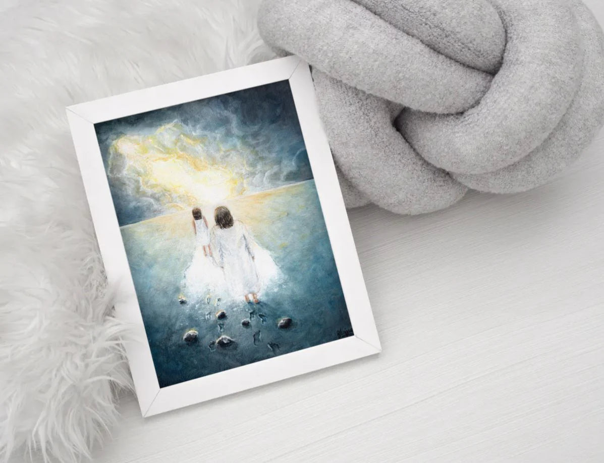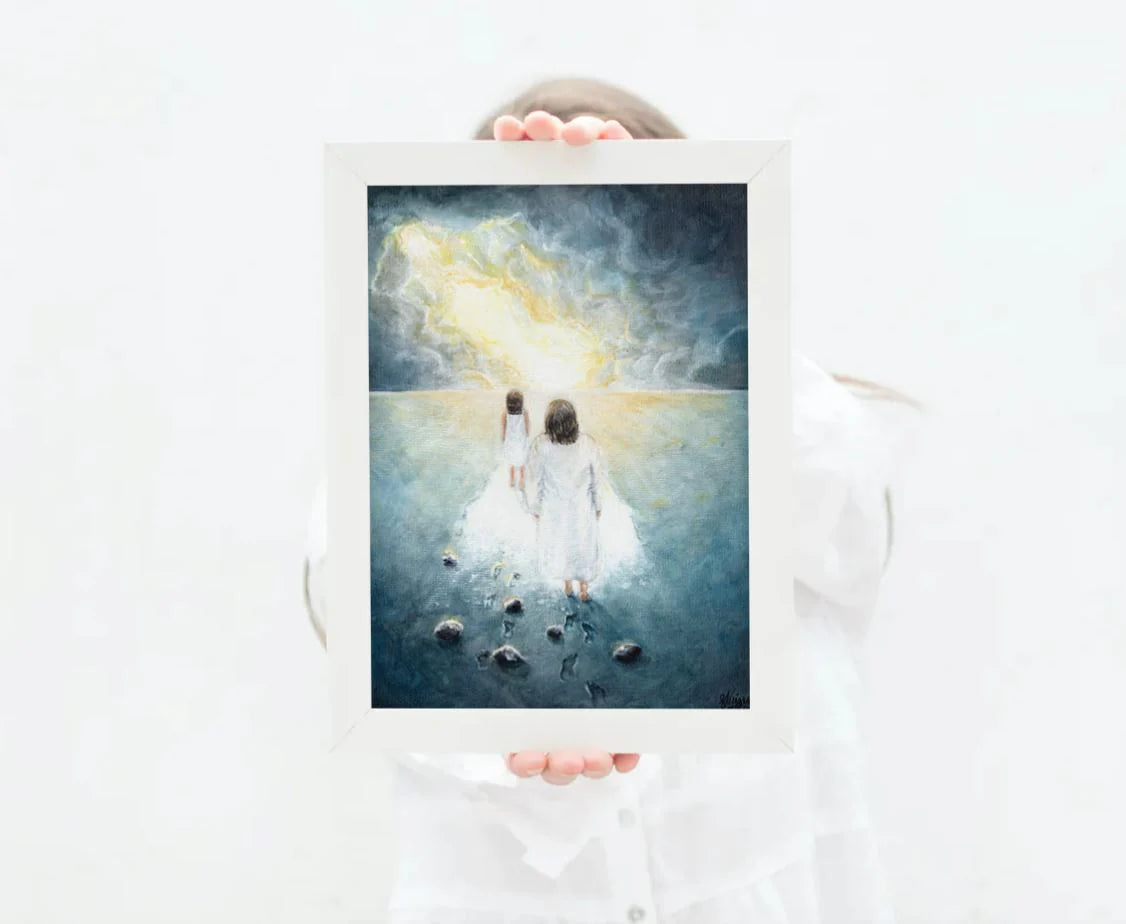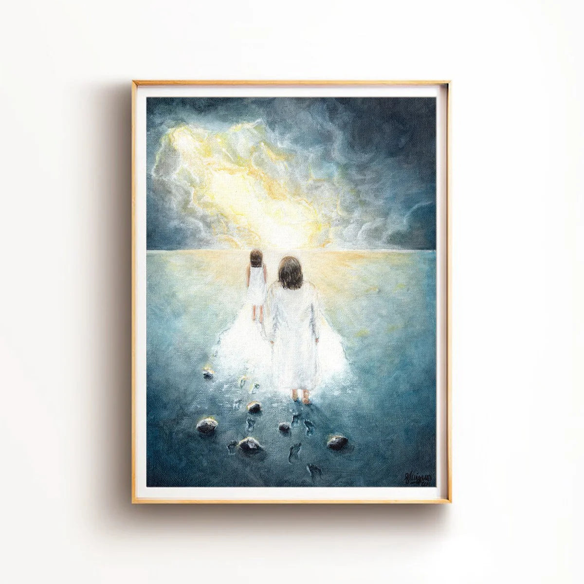 This artwork features an acrylic illustration of Jesus walking behind the little girl-- walking in between the little girl's new path and her past. This artwork is a great gift to anyone who needs the newness of life that God has planned for each and everyone. It may also be something you want to remind yourself of on a daily basis by putting it up on your wall.