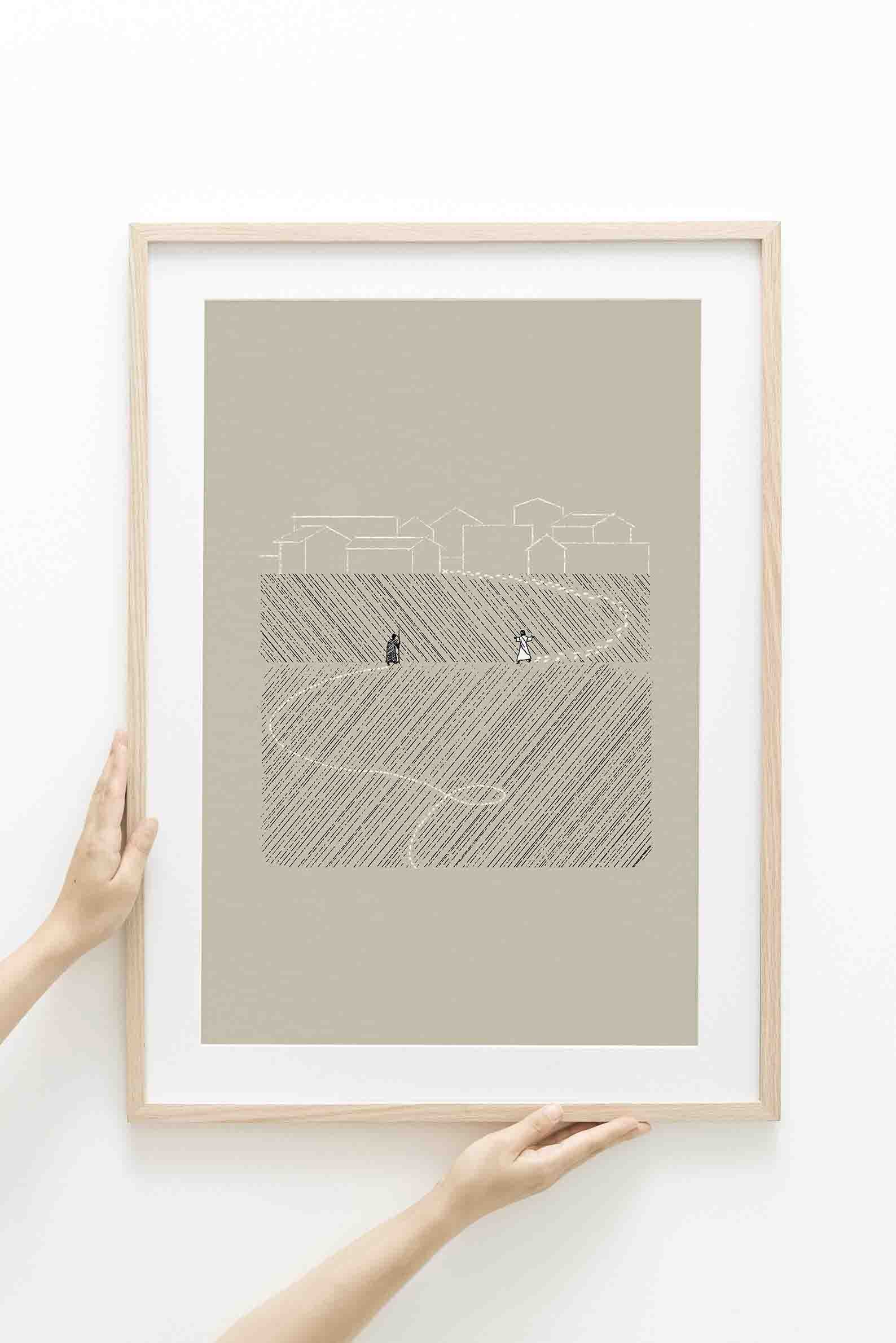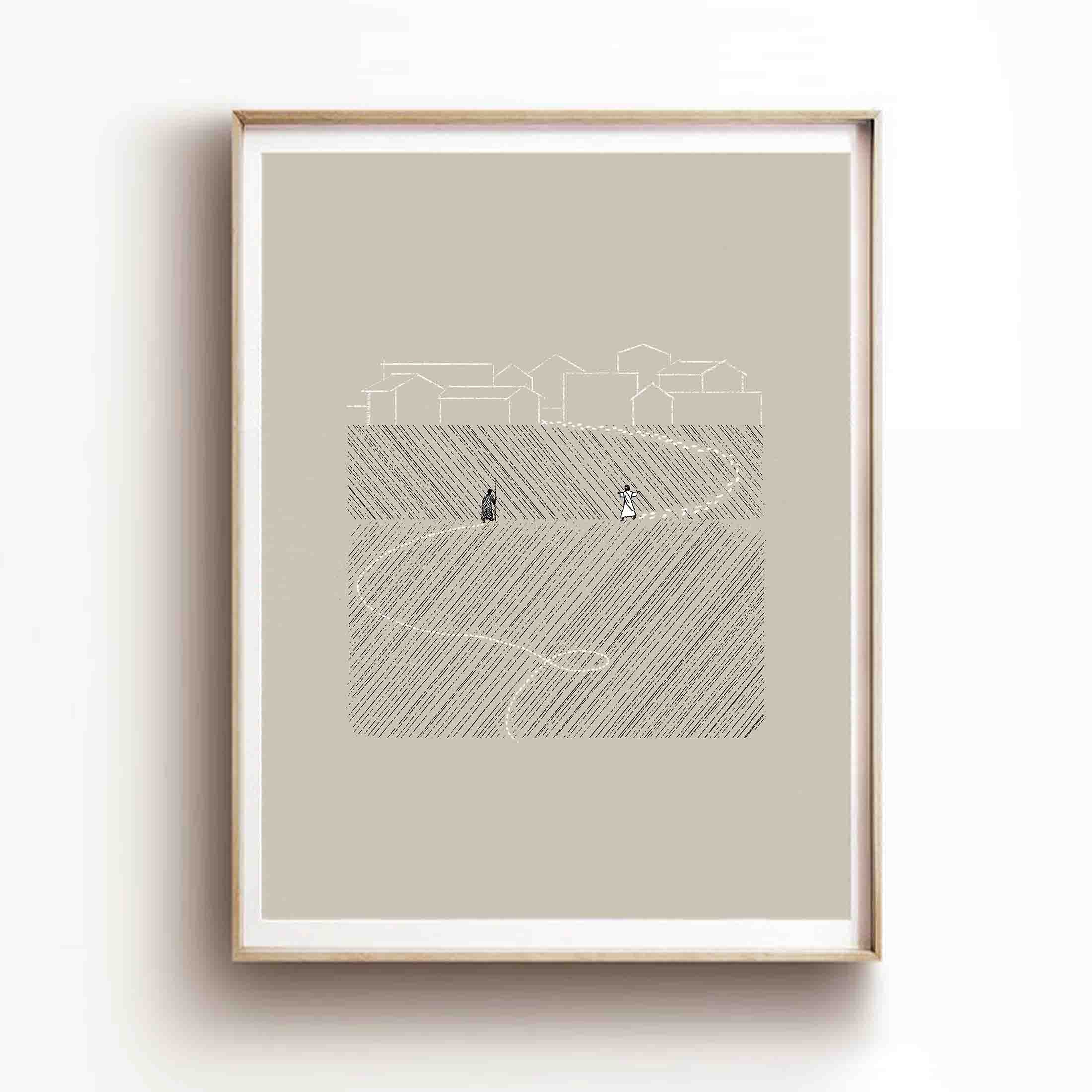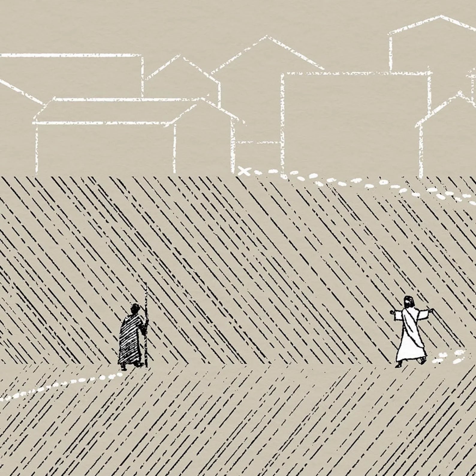Minimalistic and modern digitally hand drawn art of the parable of the lost son, with the Father welcoming the son home with open arms.