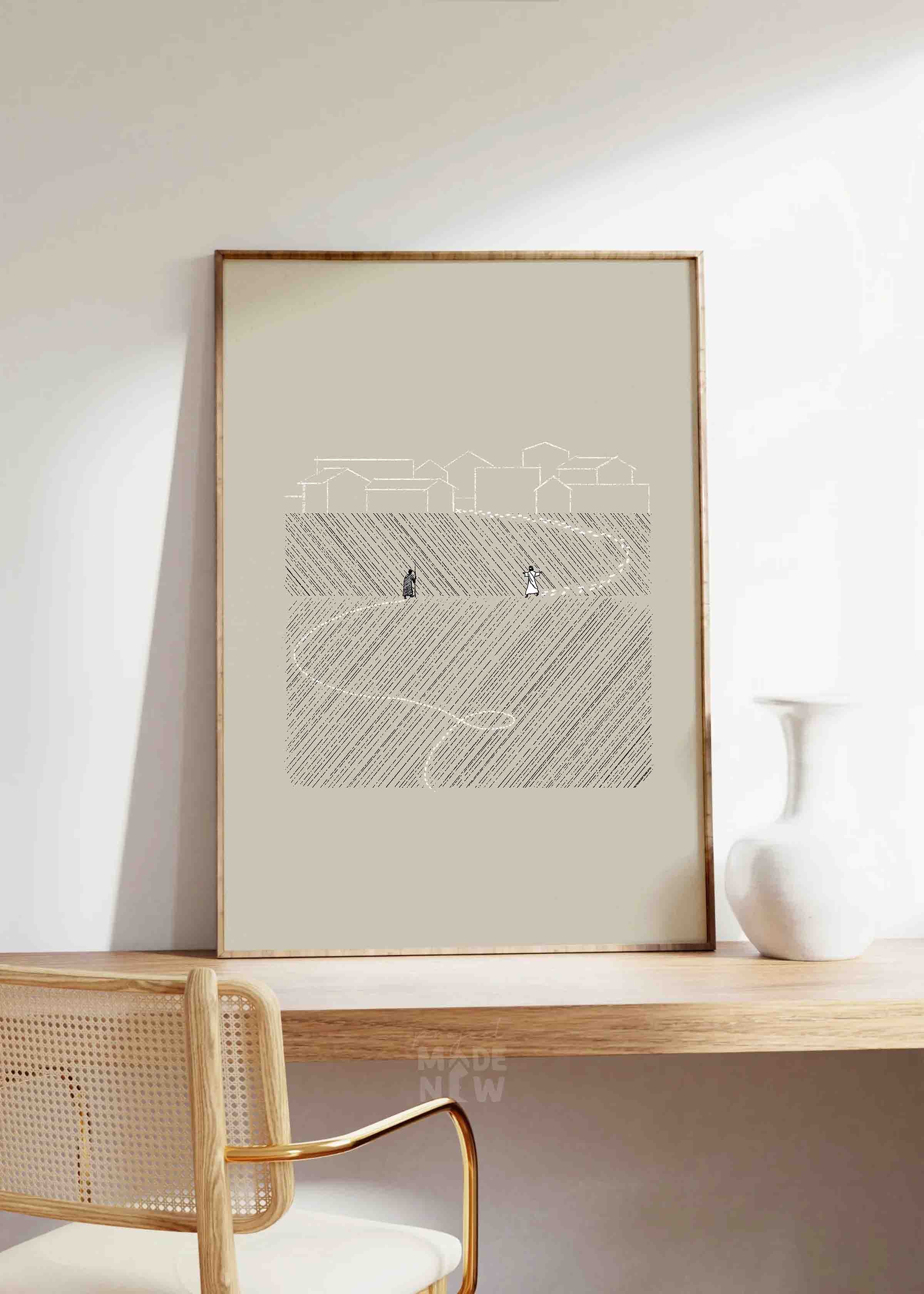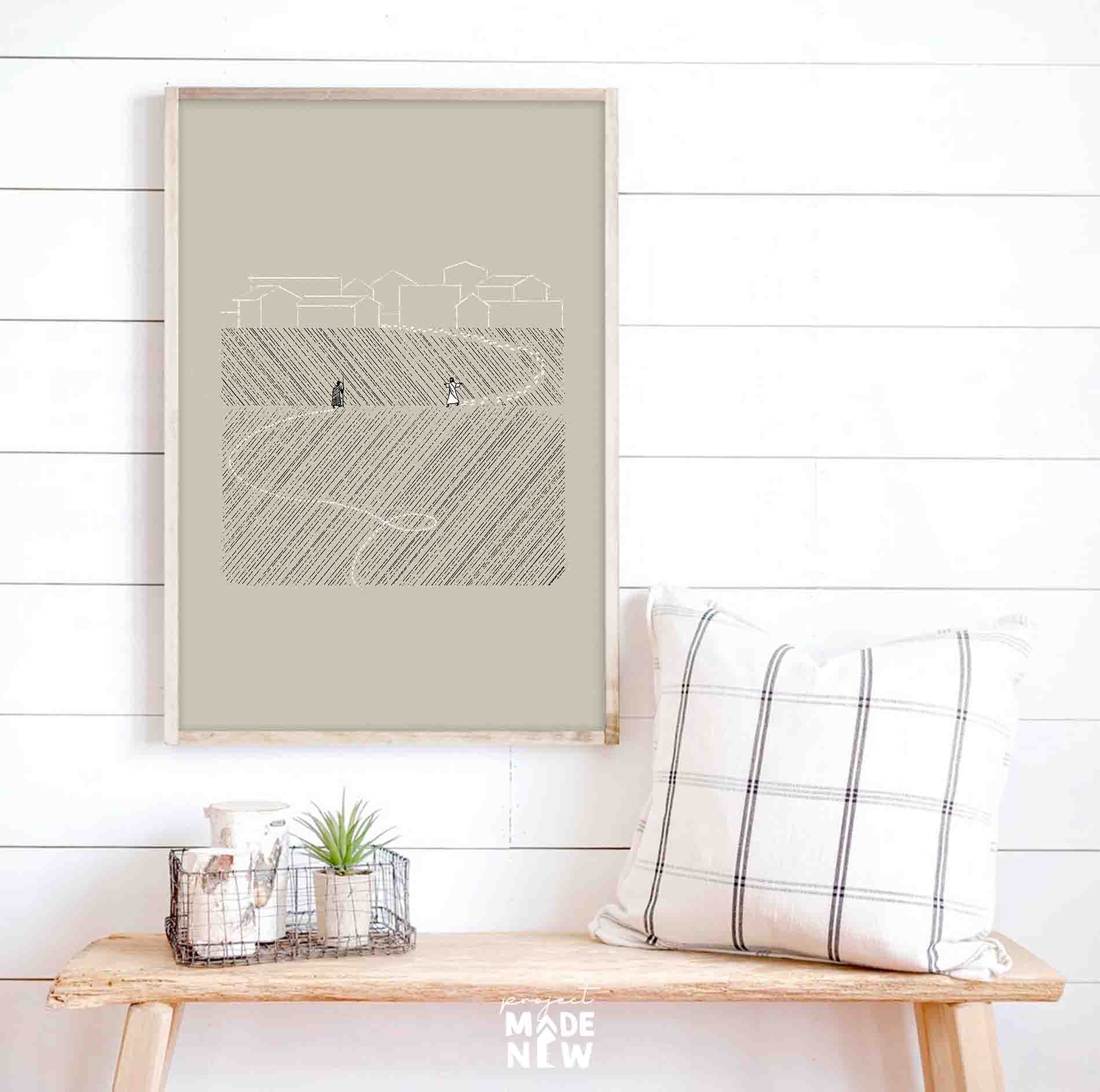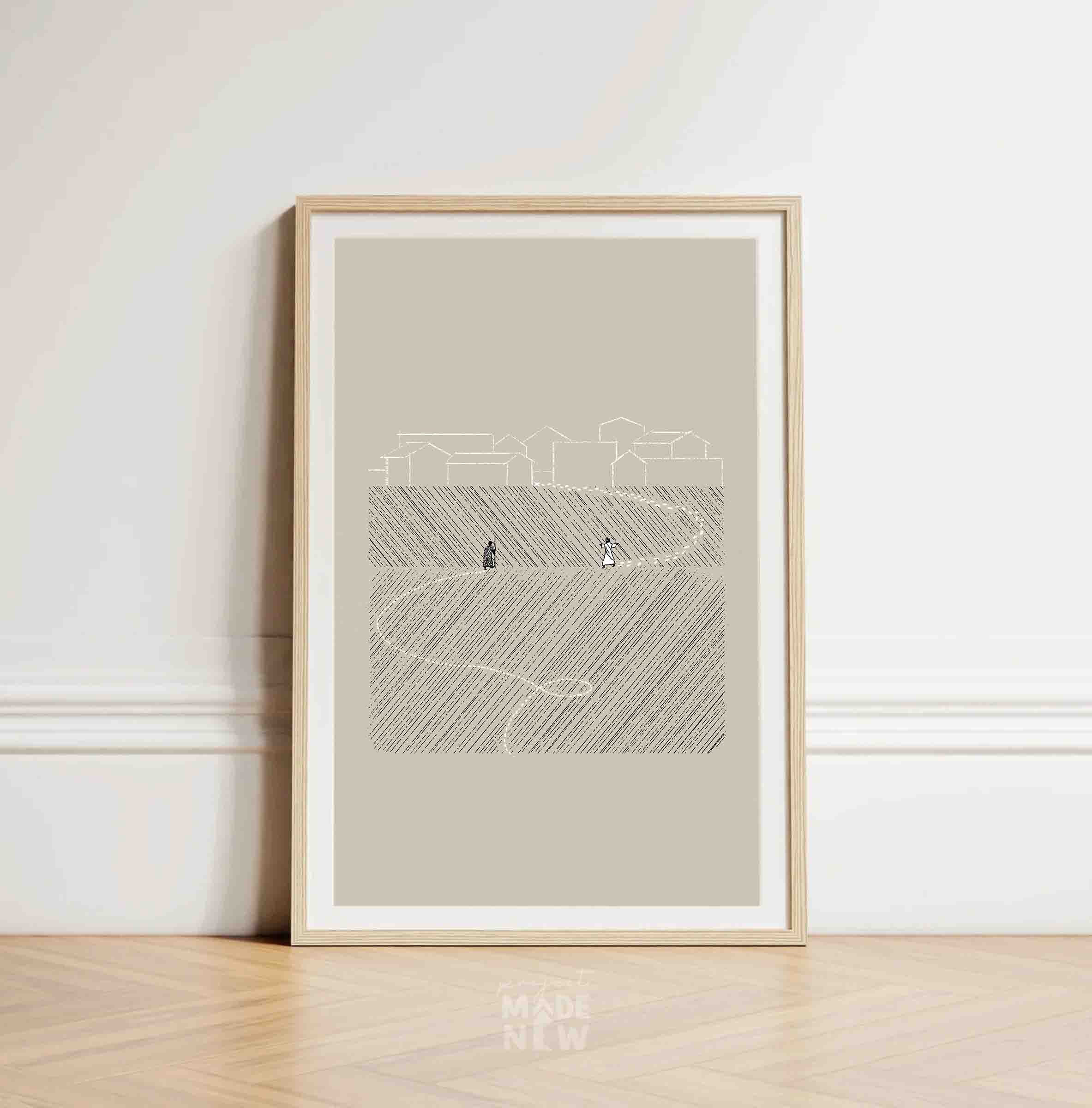 Minimalistic and modern digitally hand drawn art of the parable of the lost son, with the Father welcoming the son home with open arms.