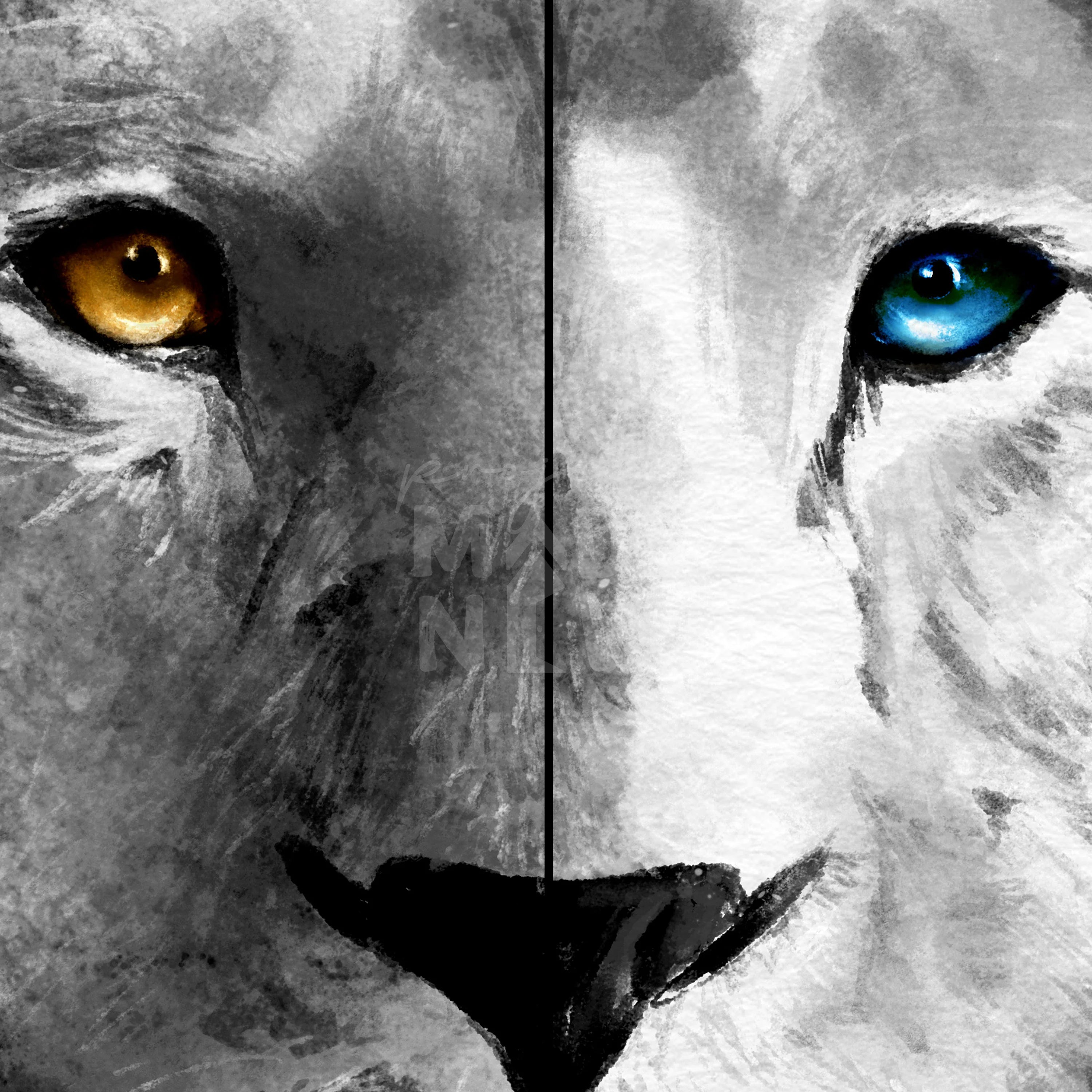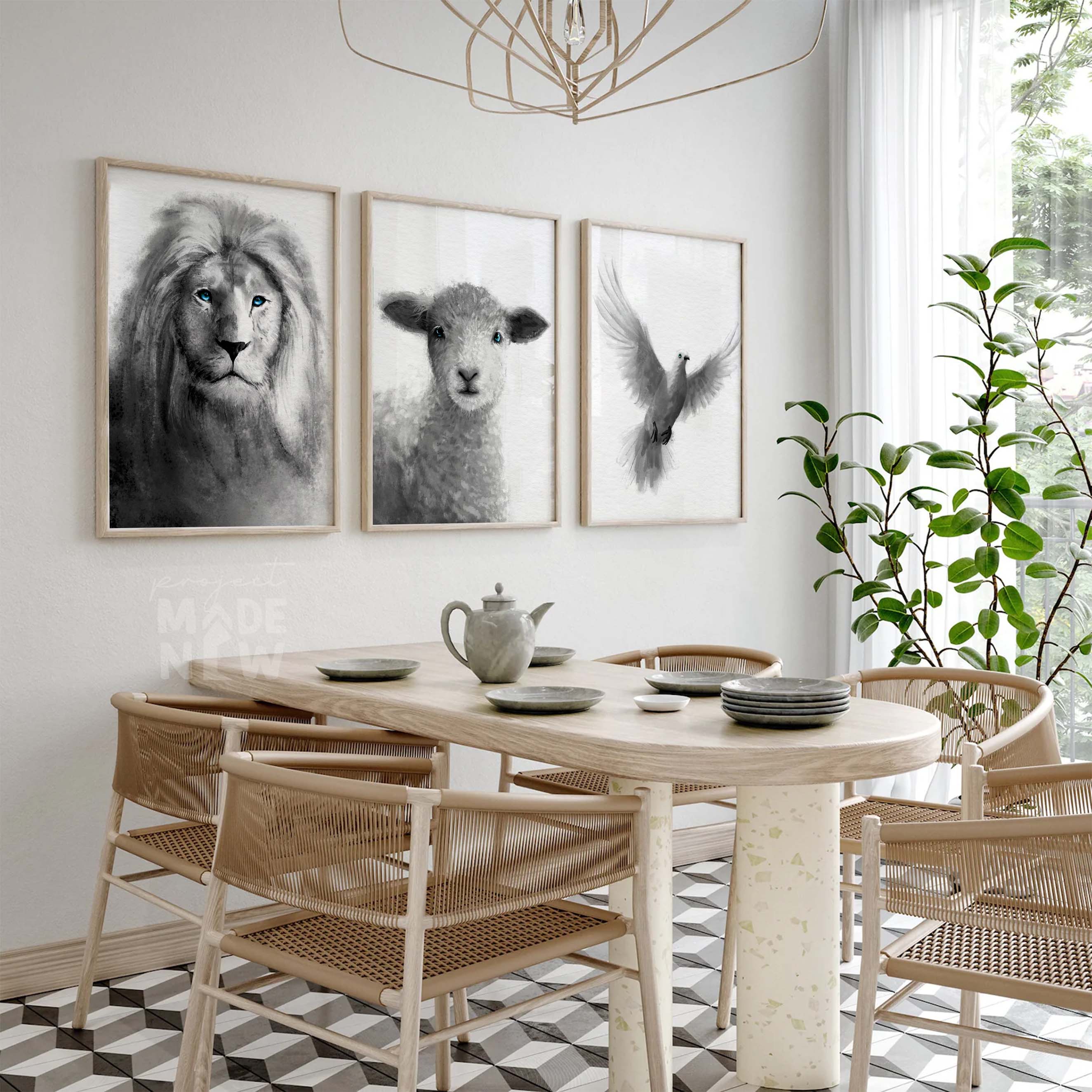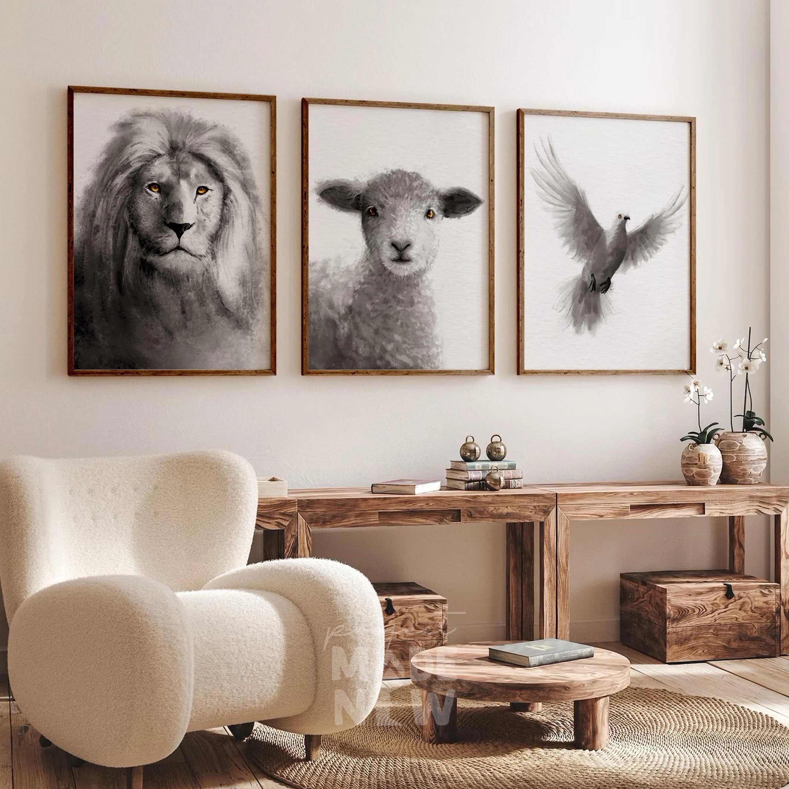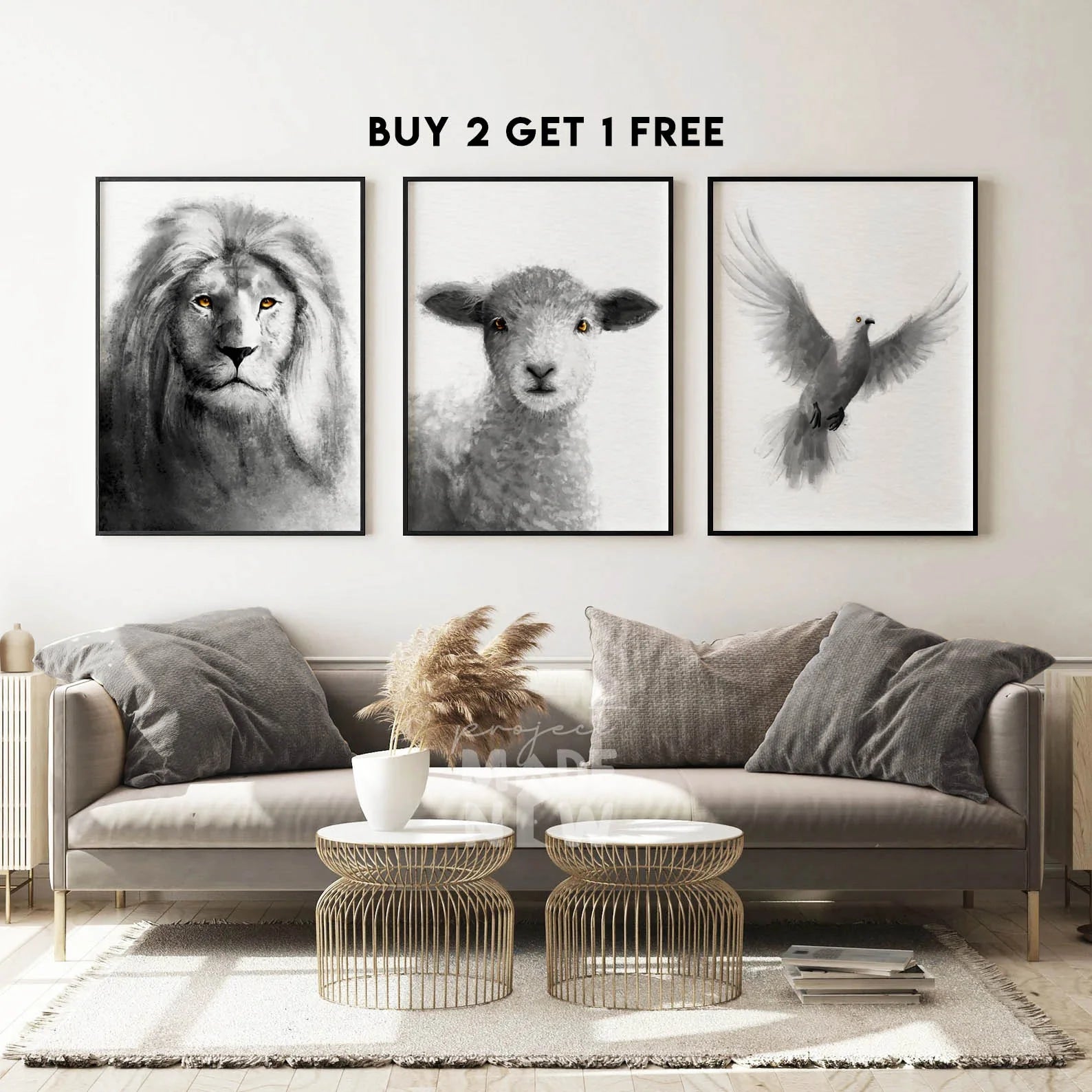 Set of 3 original black and white watercolor artworks (Lion, Lamb, and Dove). Available in golden or blue eyes.