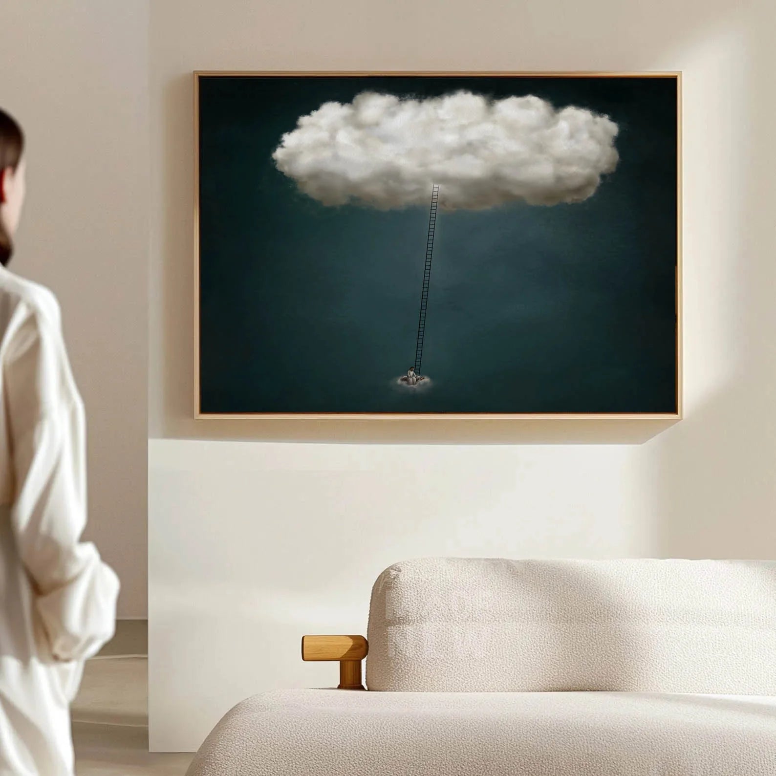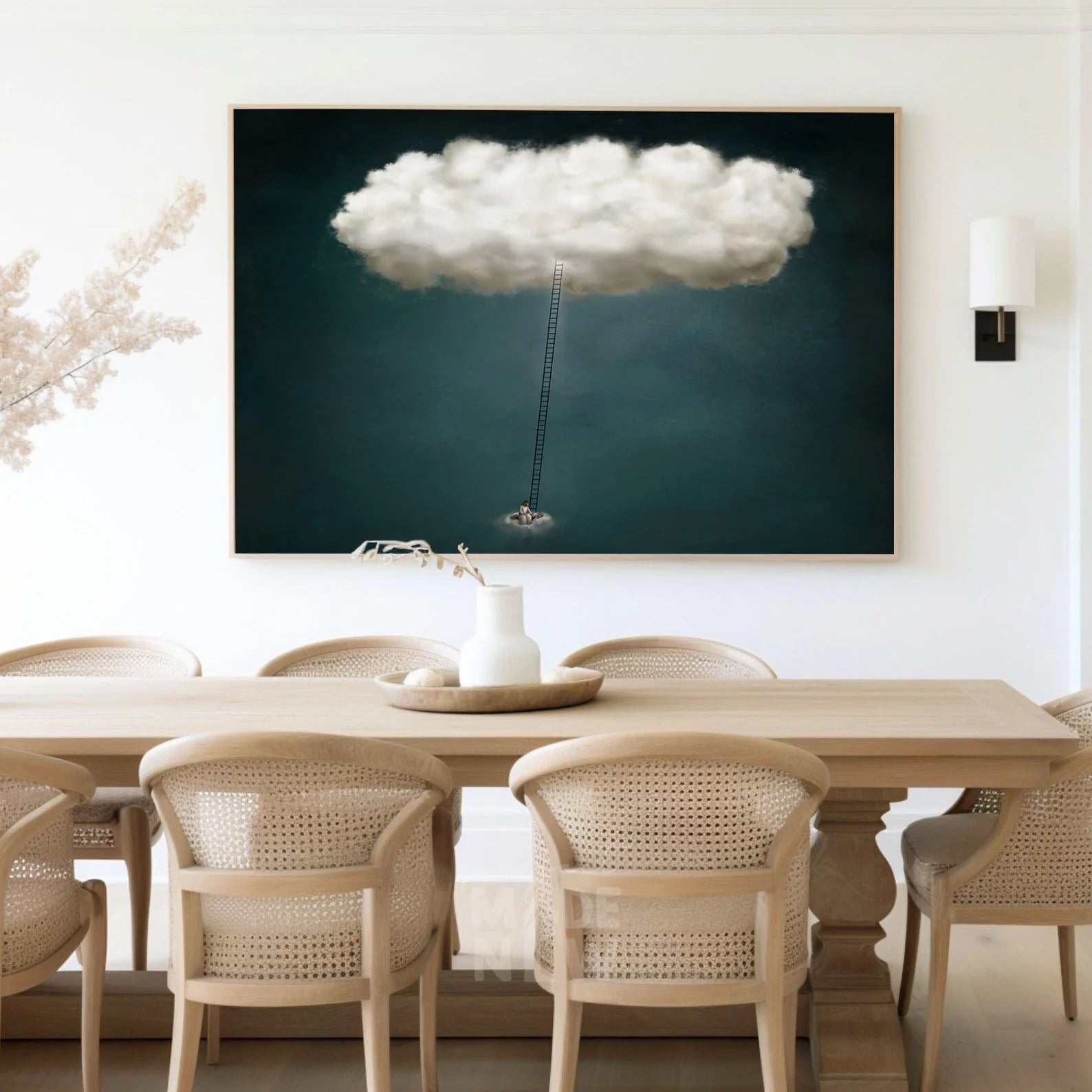 Minimalistic and modern heavenly painting of a ladder leading to Heaven, with Jesus sitting by the side of the bed while the girl sleeps. Perfect for subtle Christian decor in your space. Great conversation starter and brings God's peace to your space.