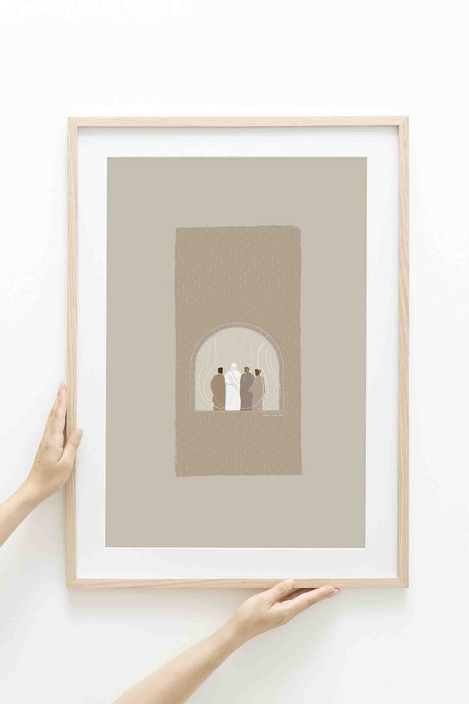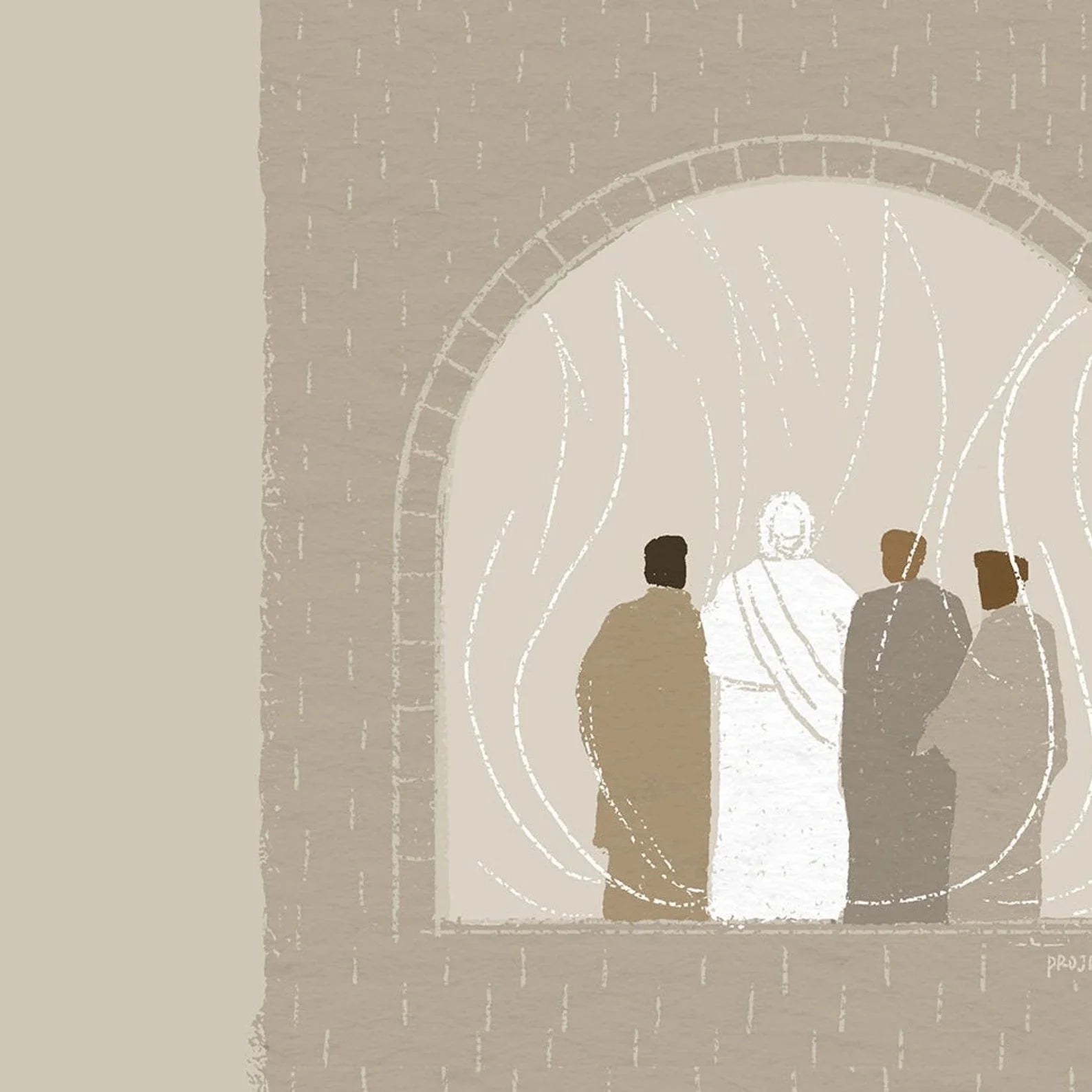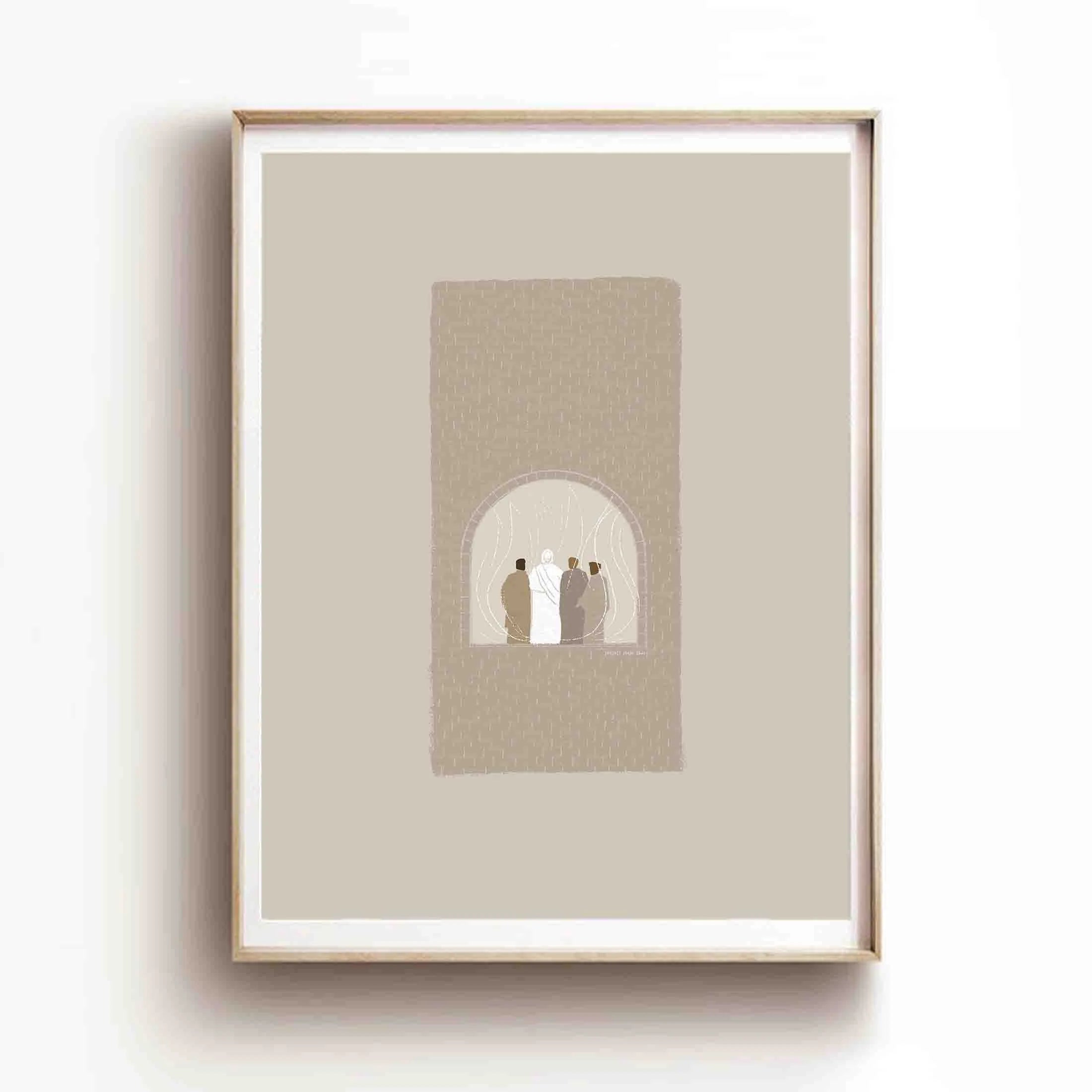 Minimalistic and modern digitally hand drawn art of Shadrach, Meshach, and Abed-nego being thrown into a fiery furnace but was not burnt by the fire because God was with them.