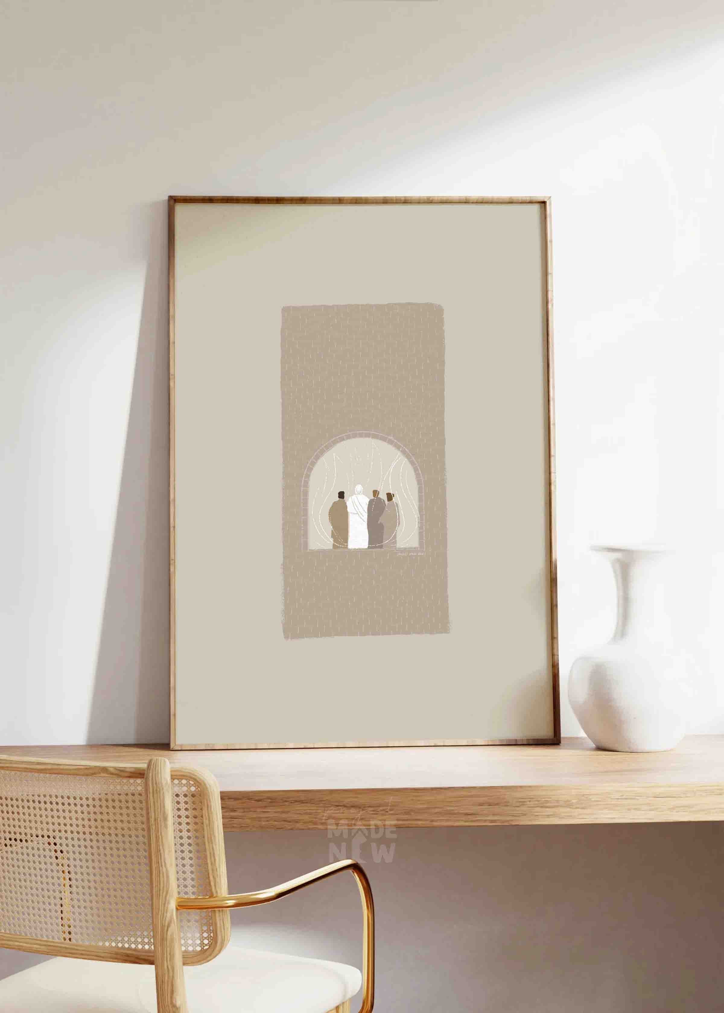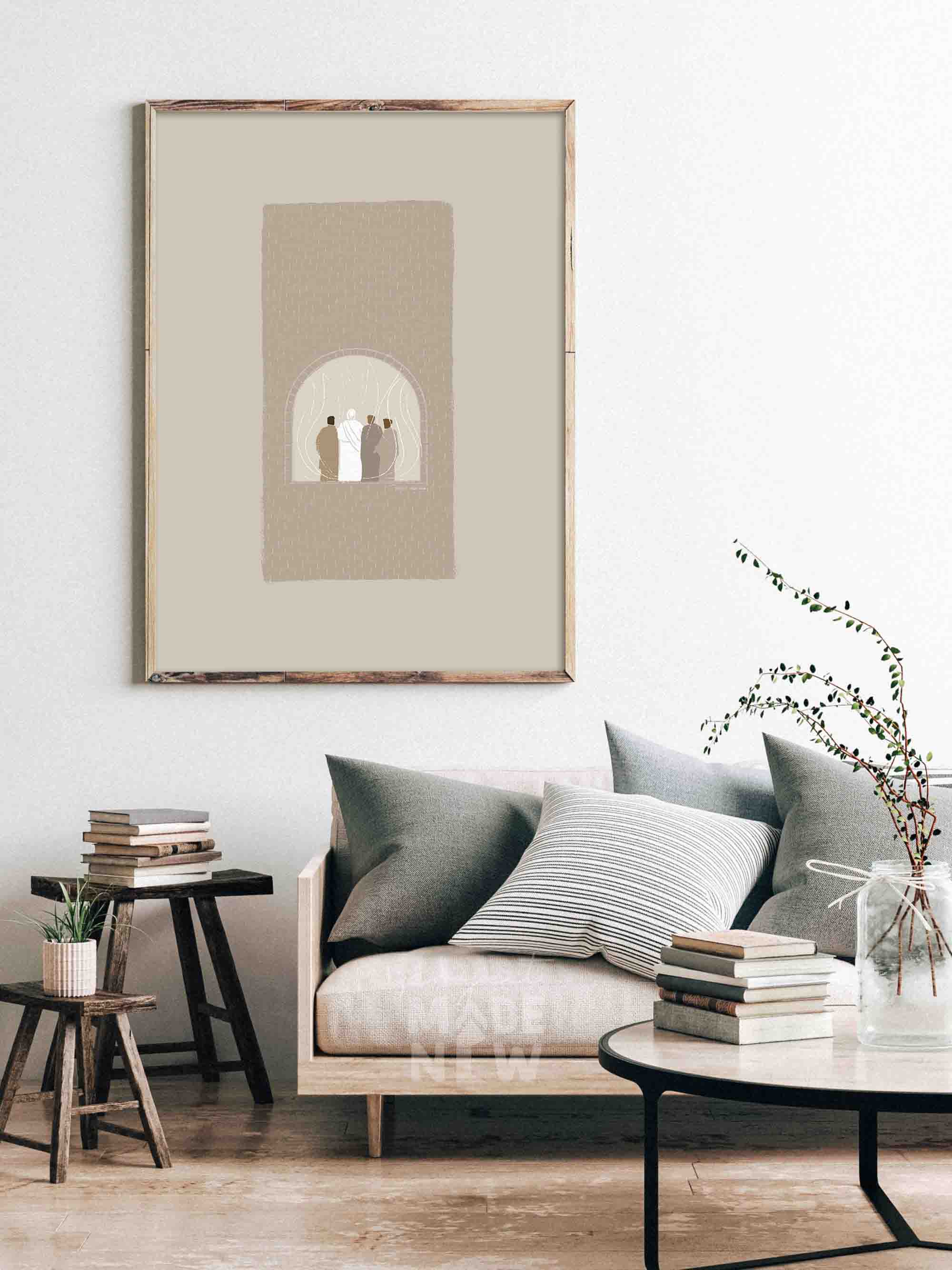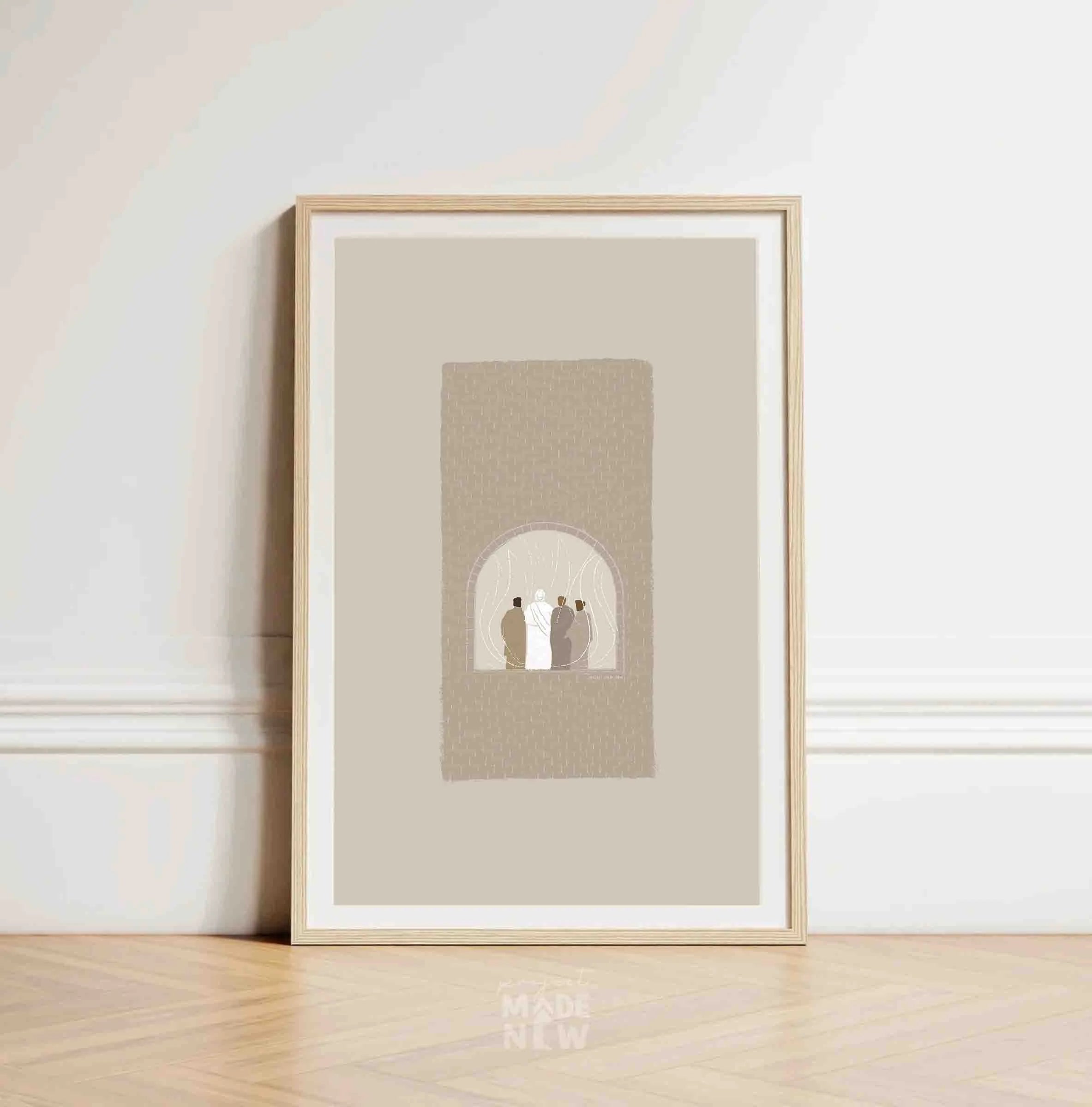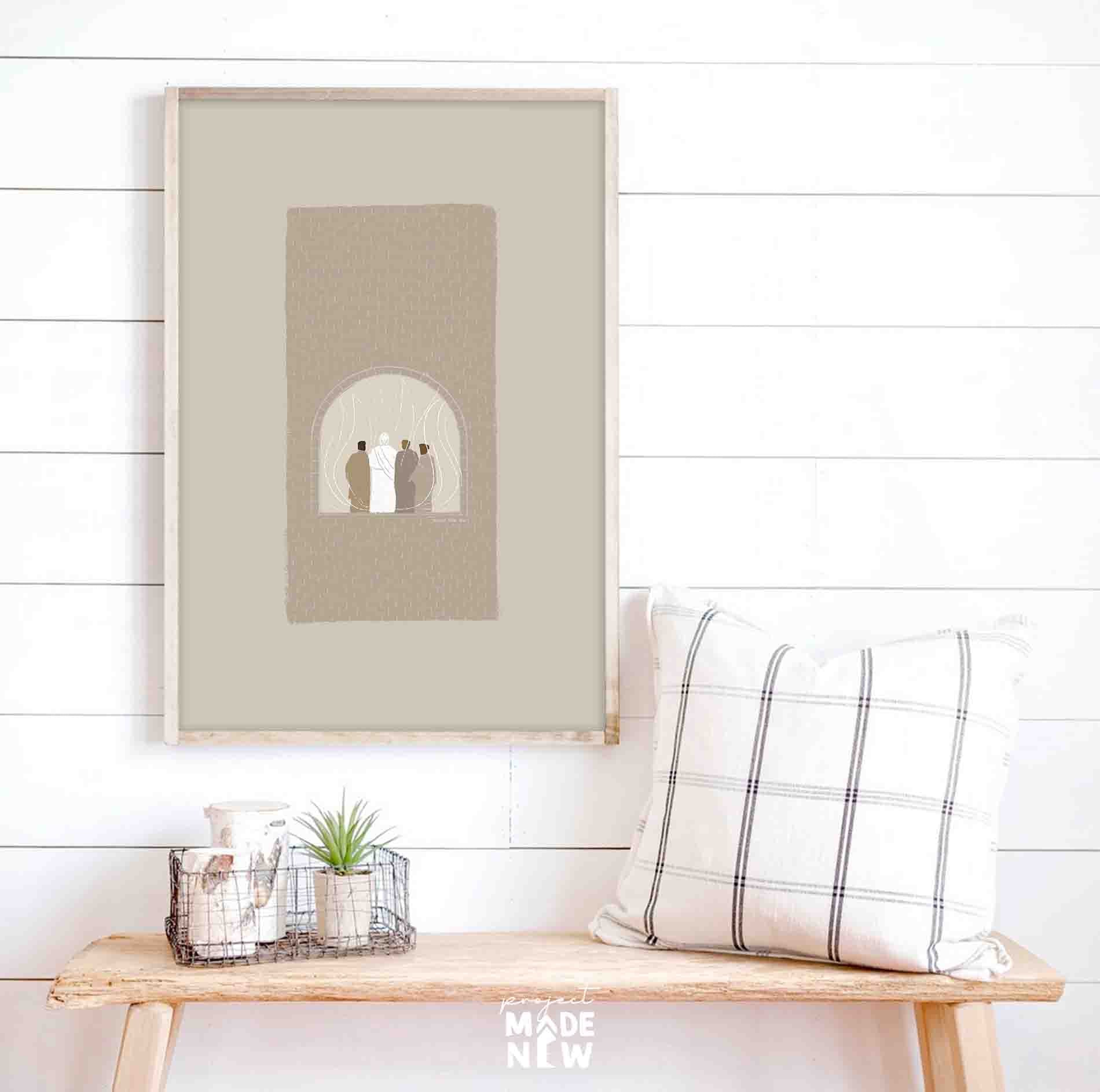 Minimalistic and modern digitally hand drawn art of Shadrach, Meshach, and Abed-nego being thrown into a fiery furnace but was not burnt by the fire because God was with them.