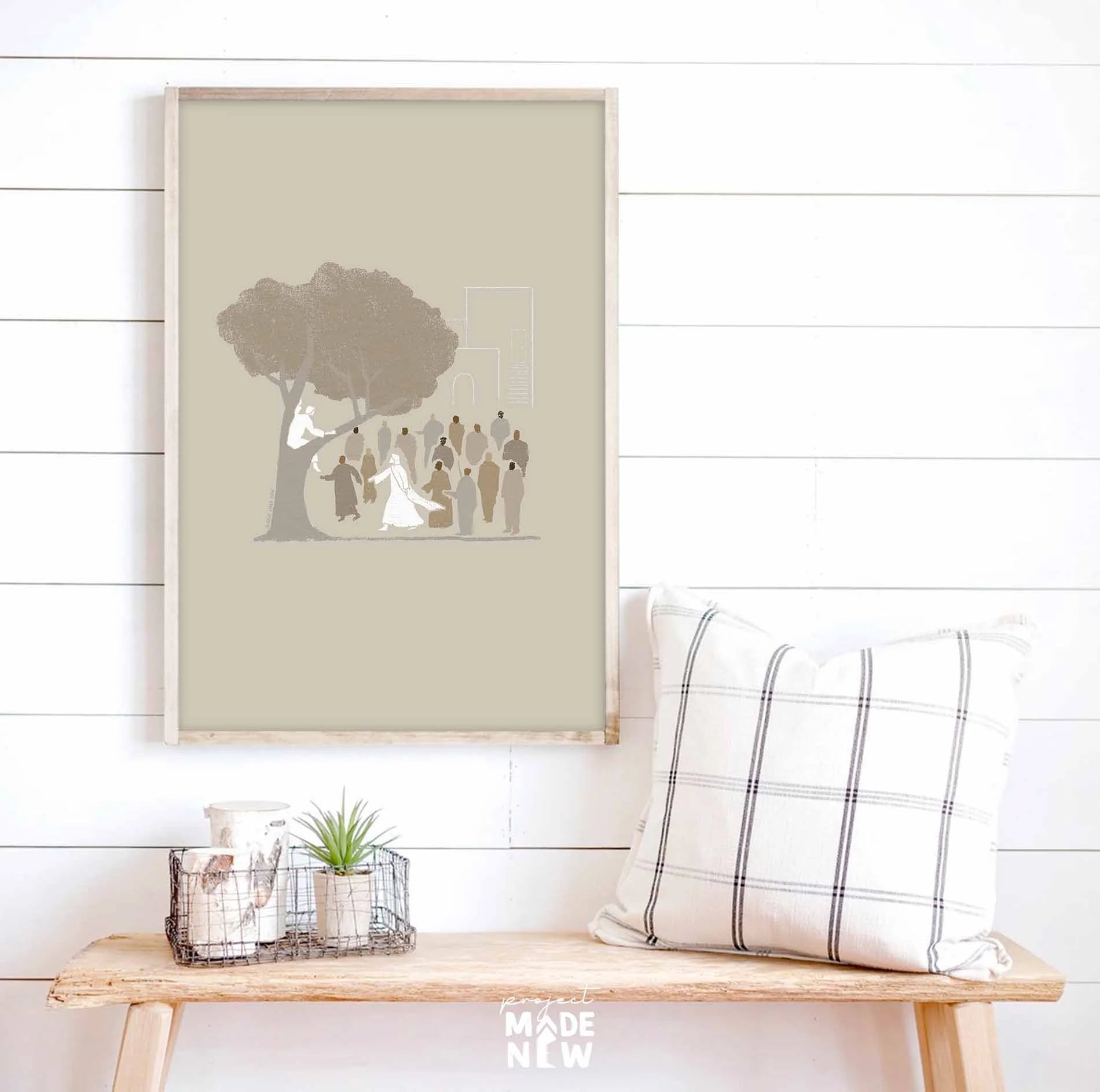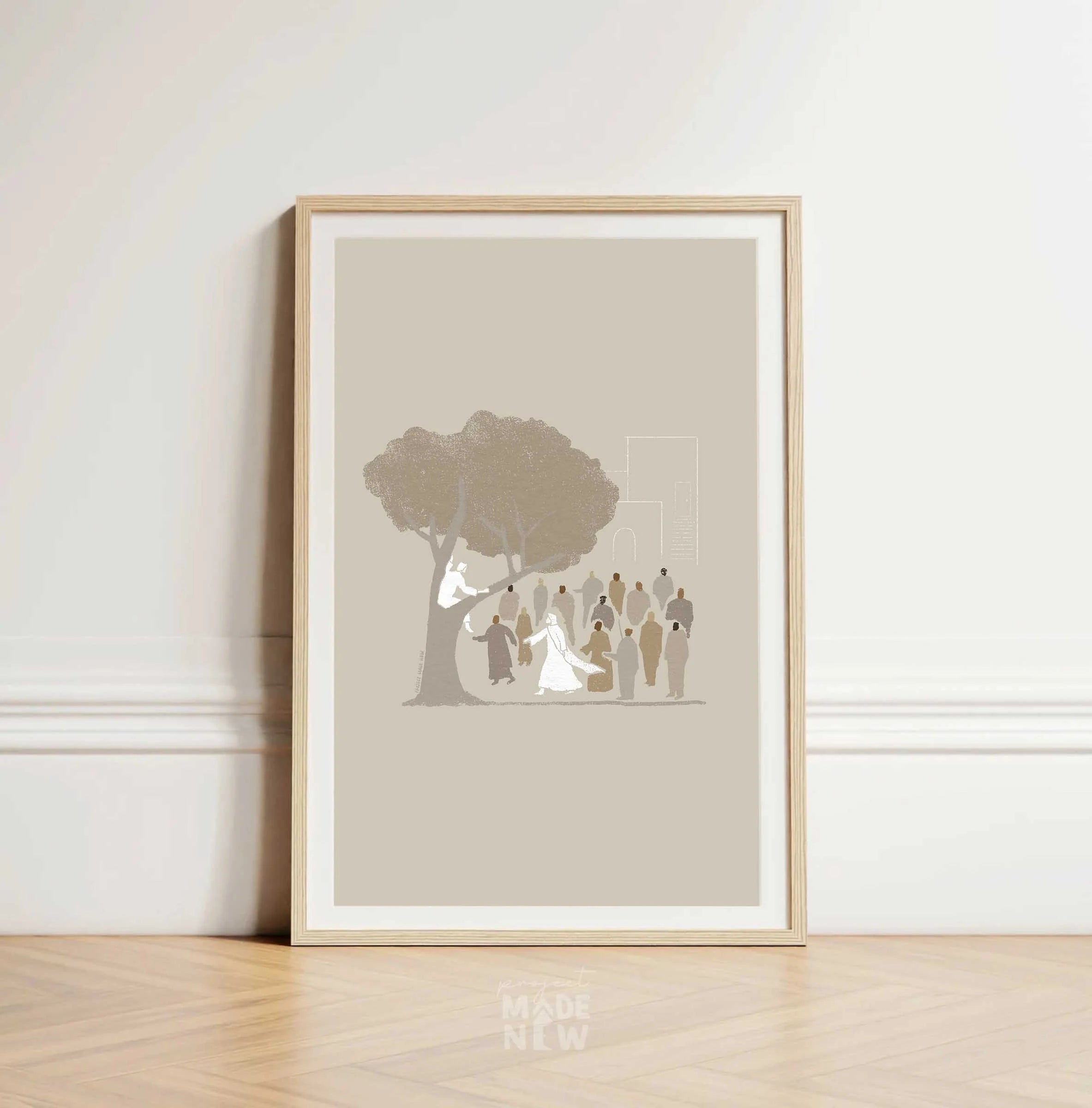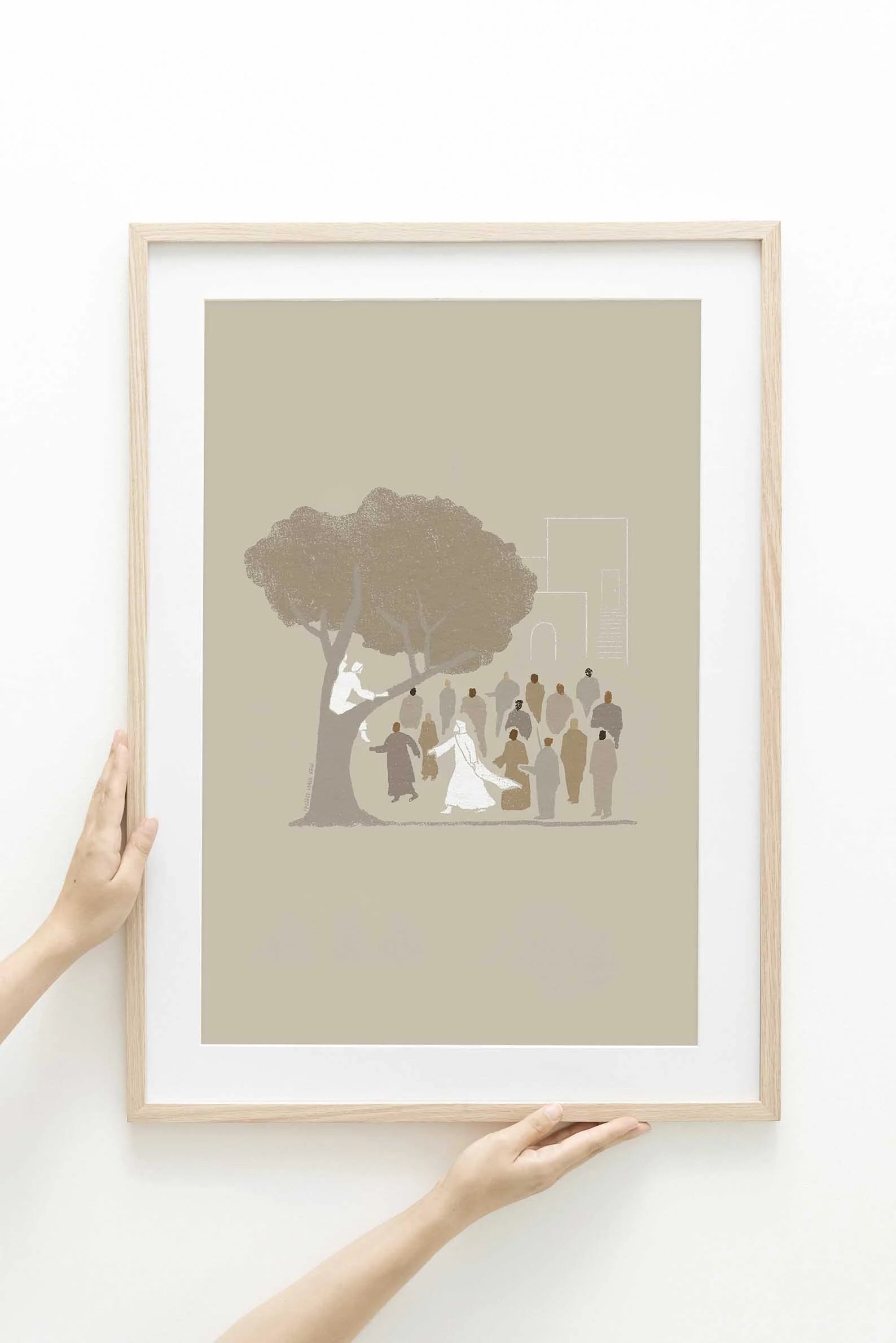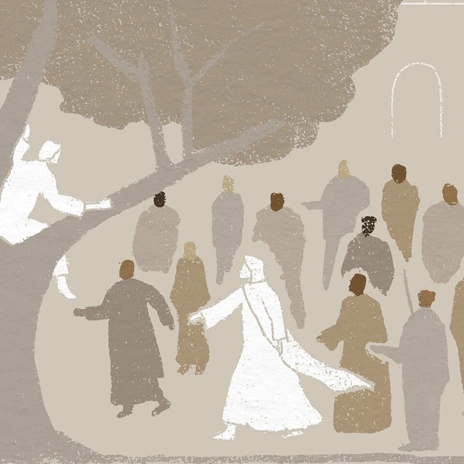 Minimalistic and modern digitally hand drawn art of Jesus calling Zacchaeus down from the fig tree to go to his house.