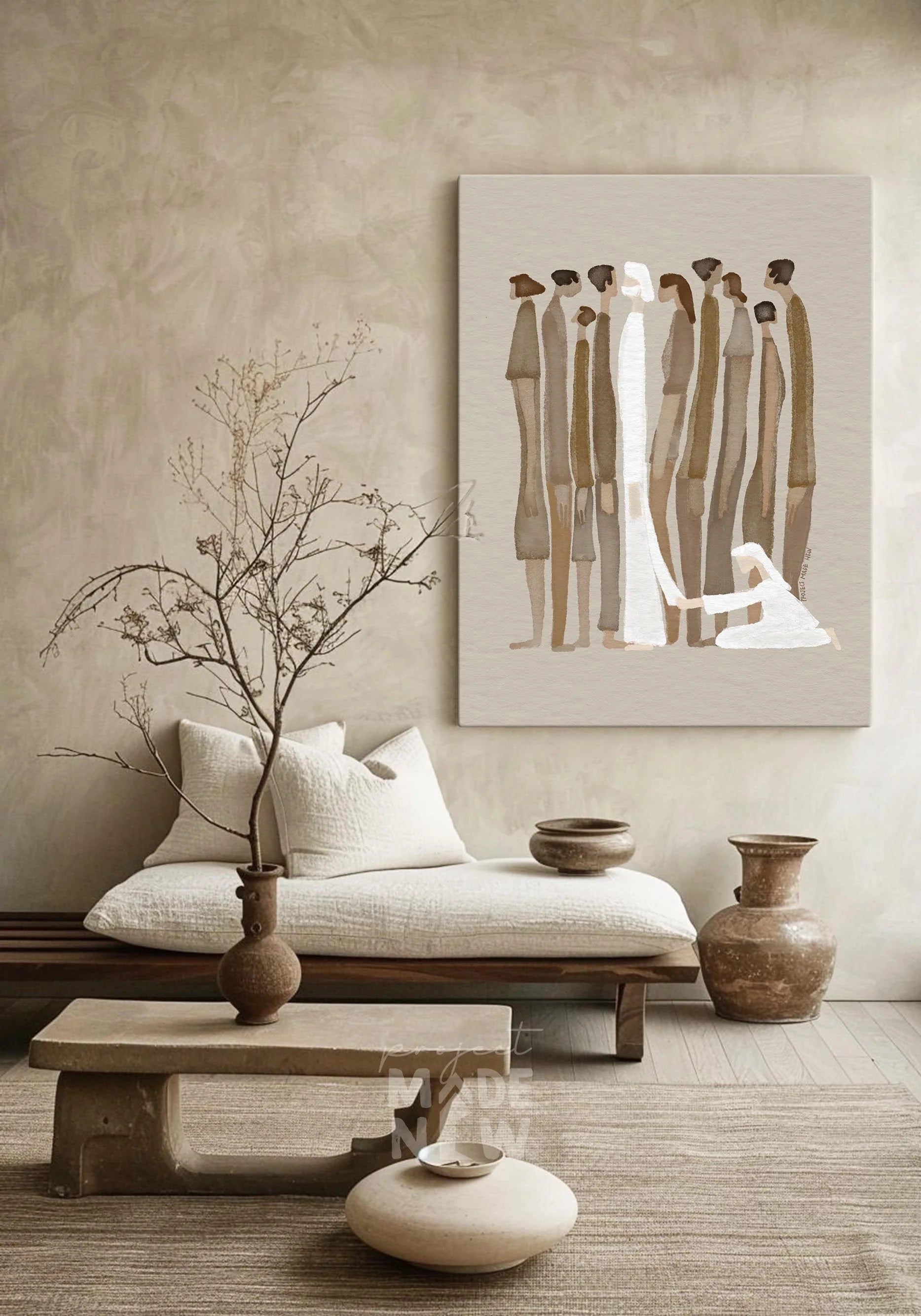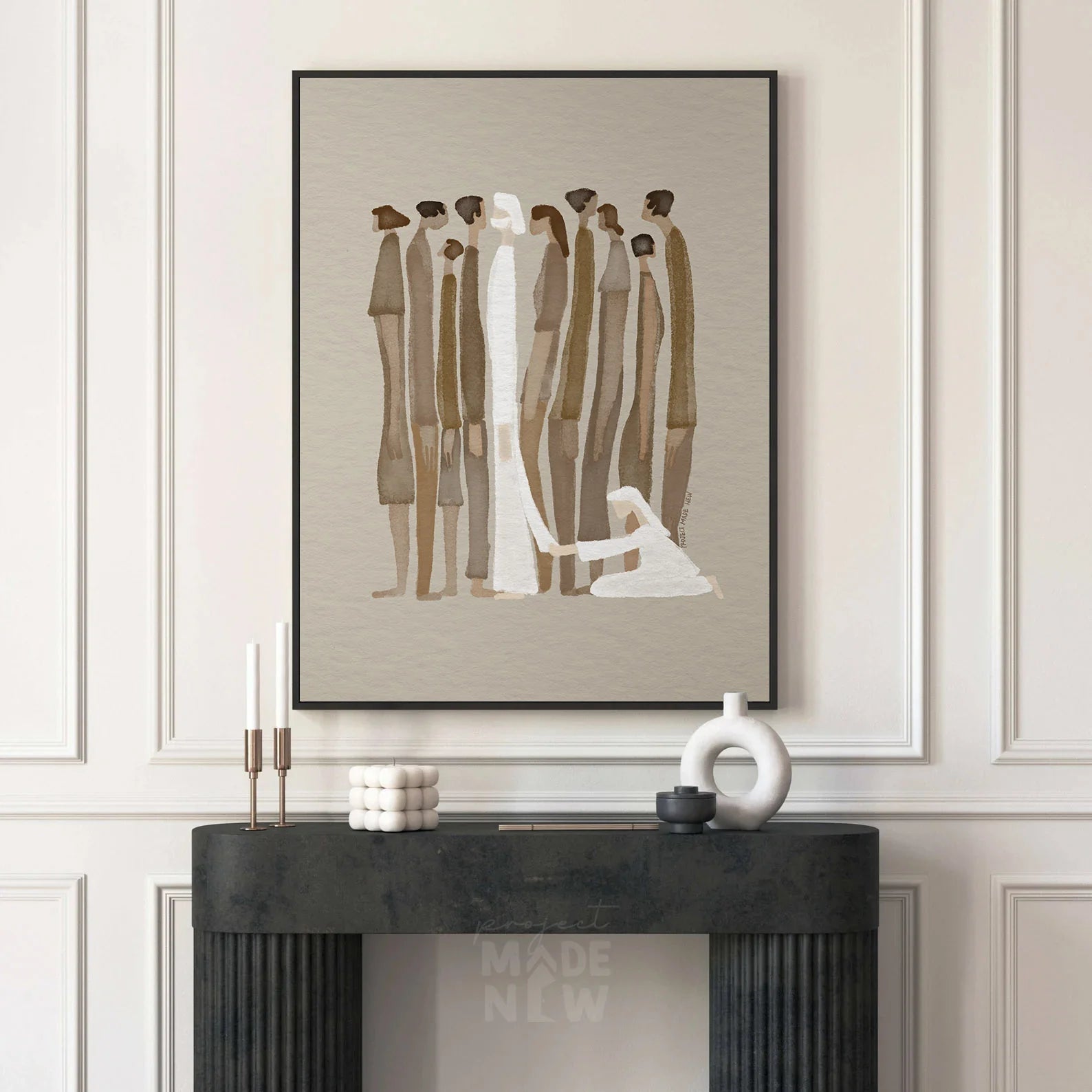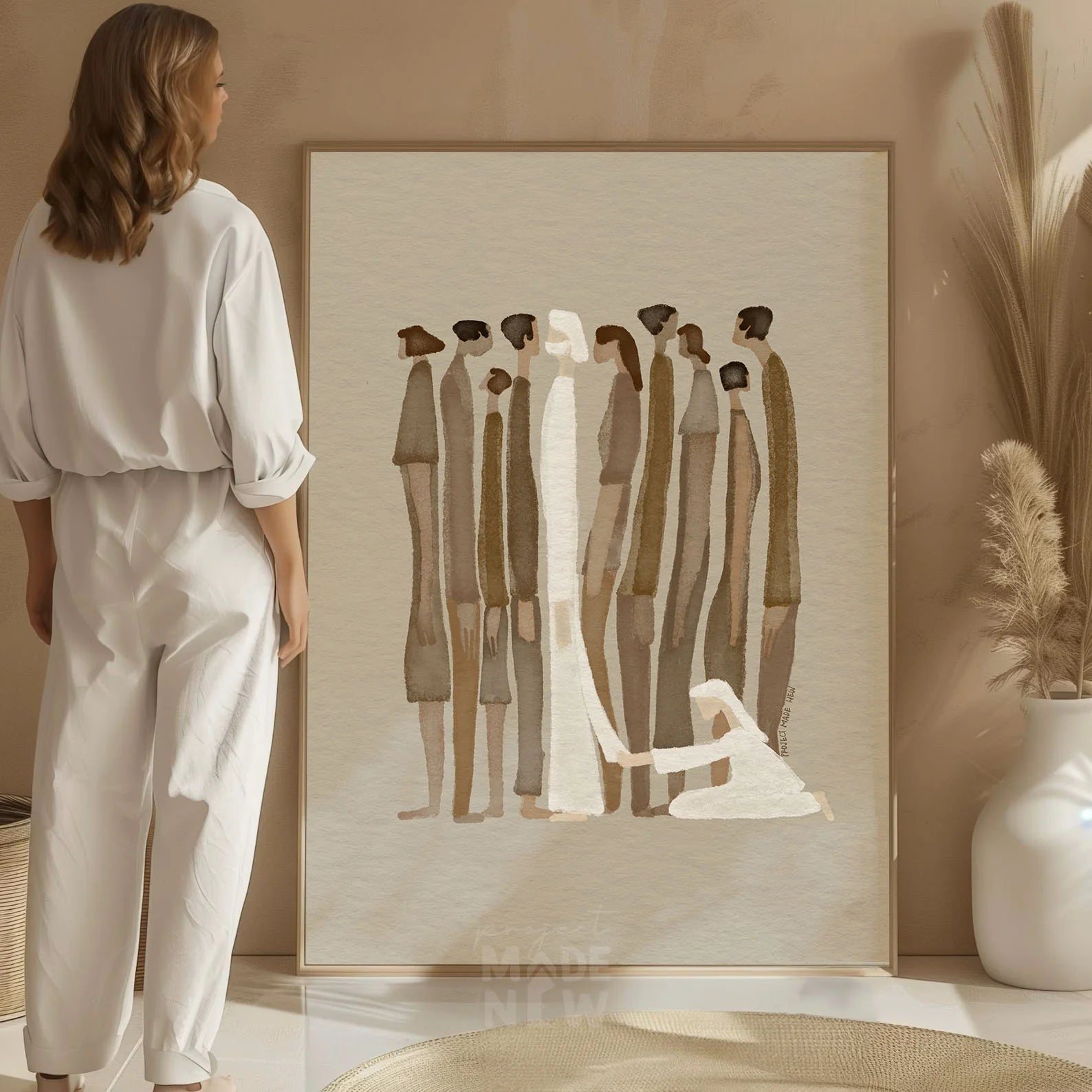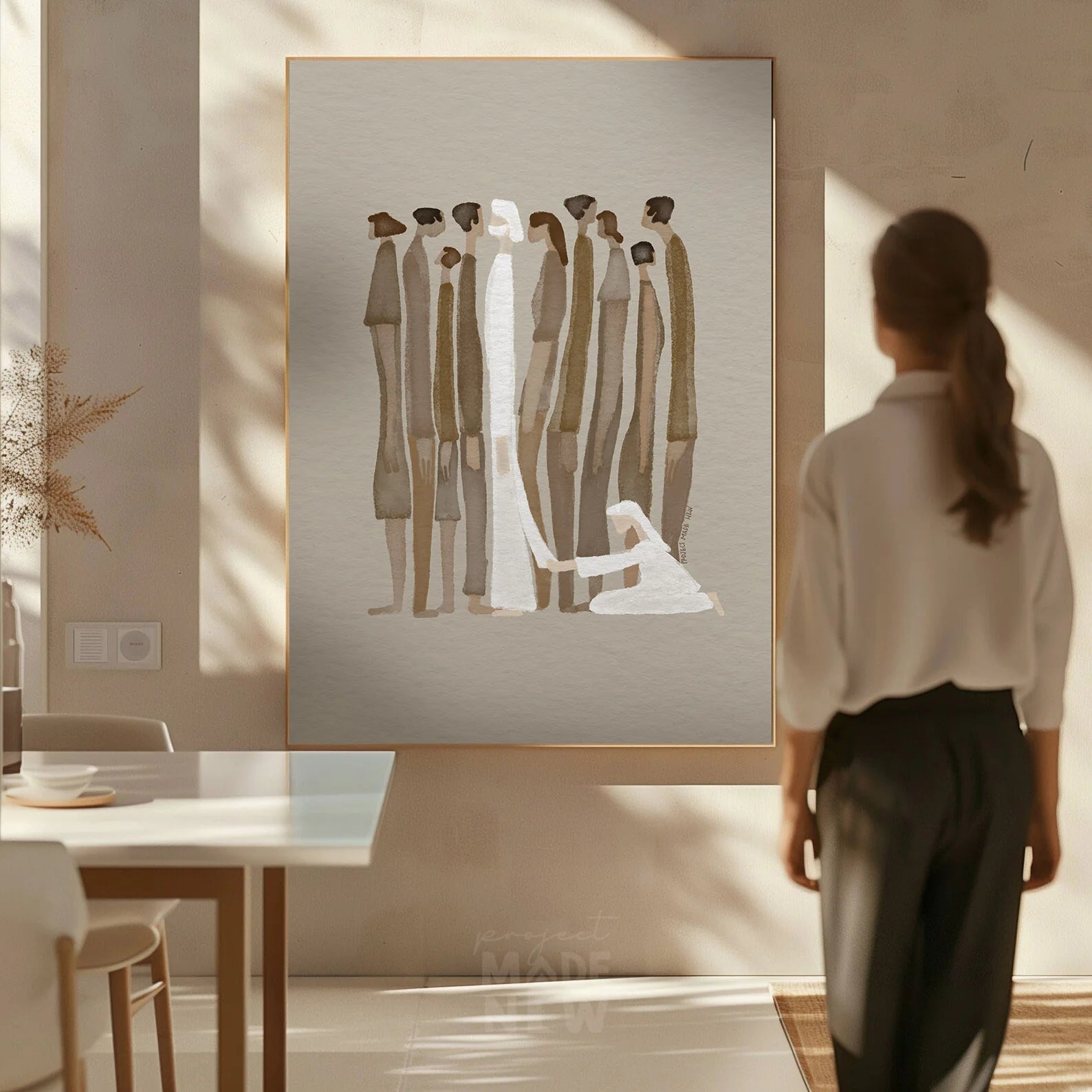 Minimalist and modern watercolor art of the woman with the issue of blood touching the fringe of Jesus's garment.