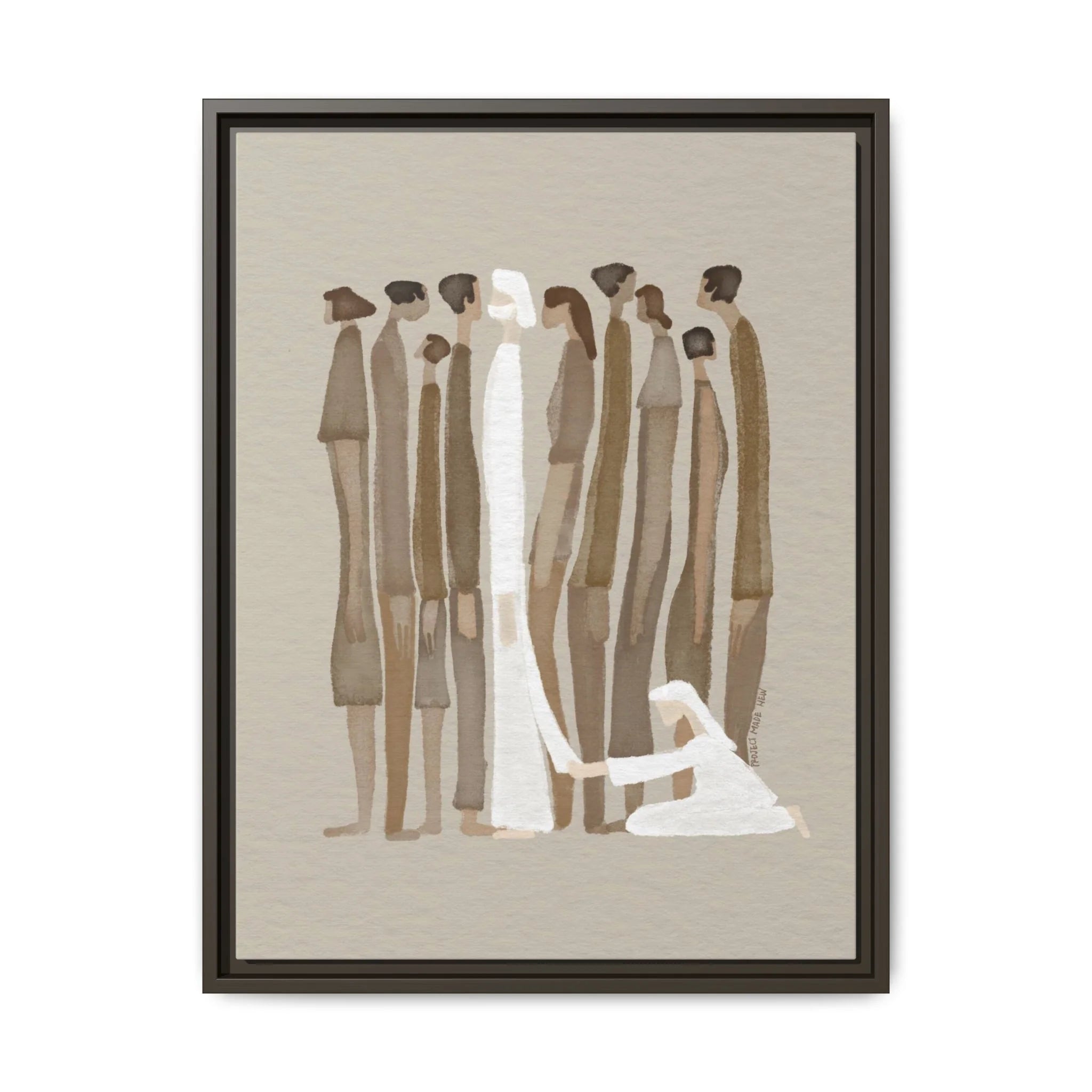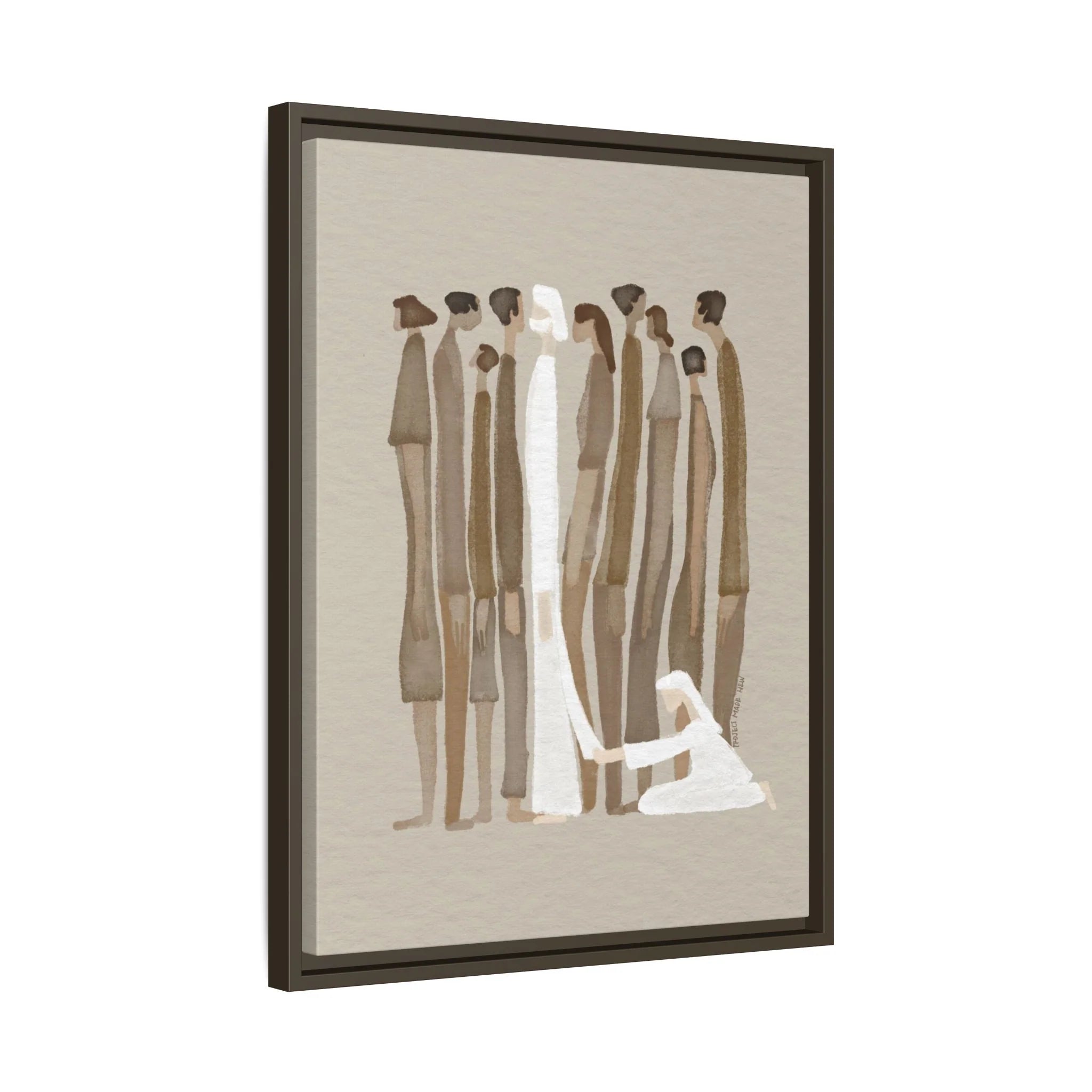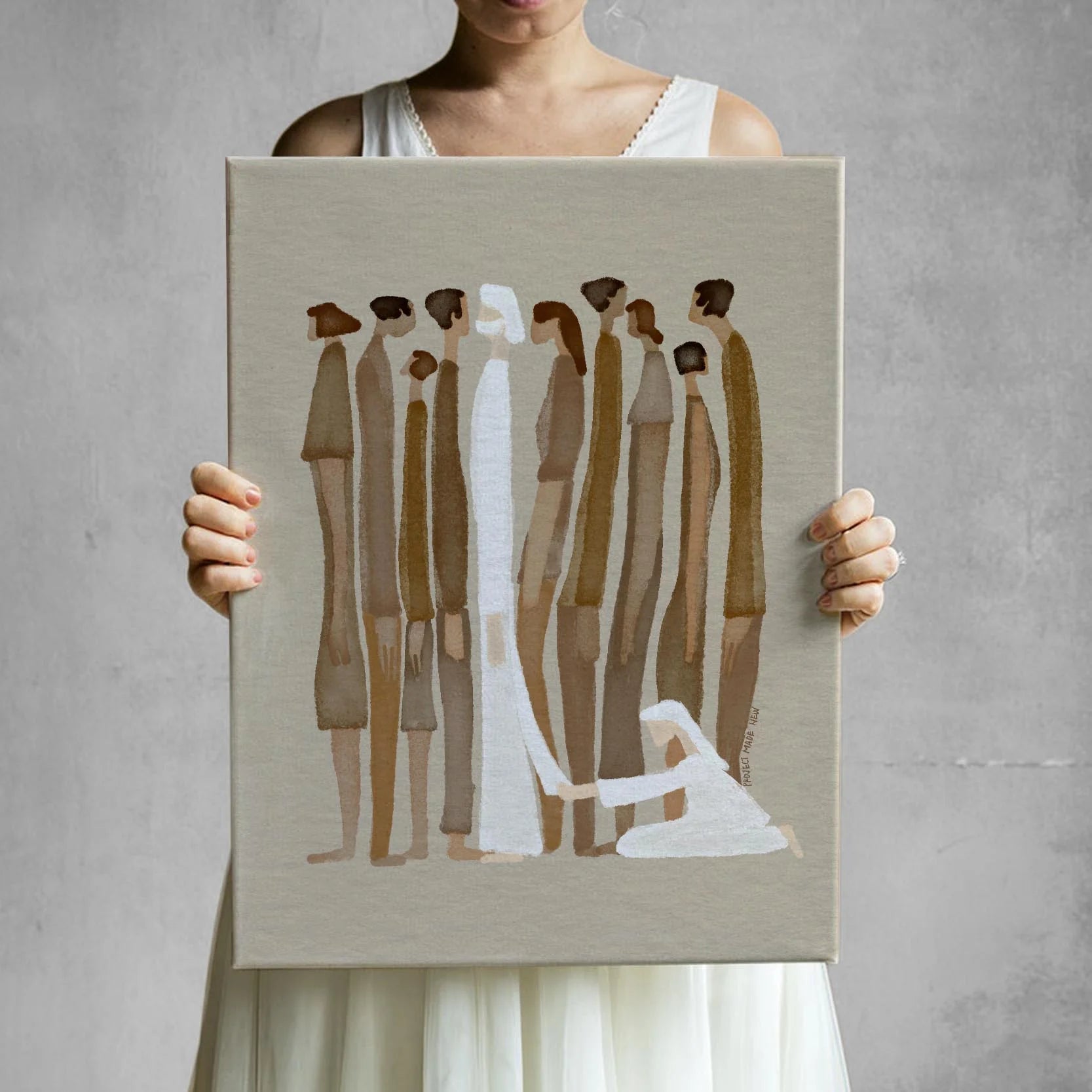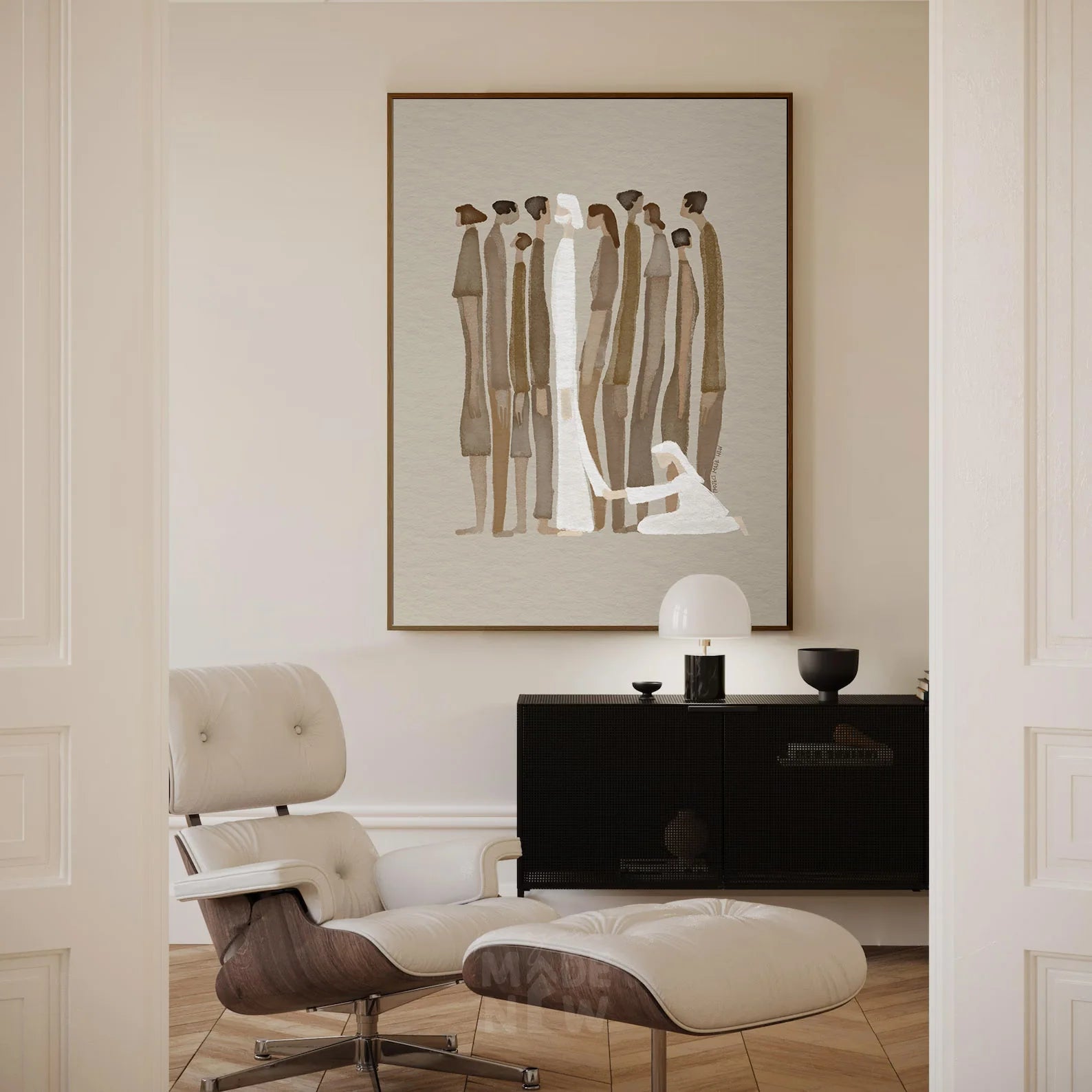 Minimalist and modern watercolor art of the woman with the issue of blood touching the fringe of Jesus's garment.